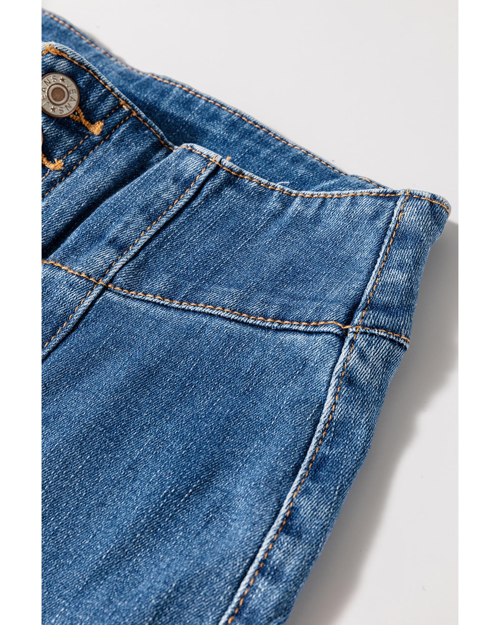 This pair of high waist flare jeans features a trendy fitted design with vintage-inspired details. The button fly closure and raw hem add an edgy touch, while seamed accents provide visual interest and texture. Made with high elasticity material, these jeans offer a comfortable and flattering fit suitable for various styles.