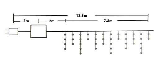 • Length: total 12.8 meters, with 7.8 meters of lighted length, 2 meters from lights to controller, and 3 meters from controller to power adaptor