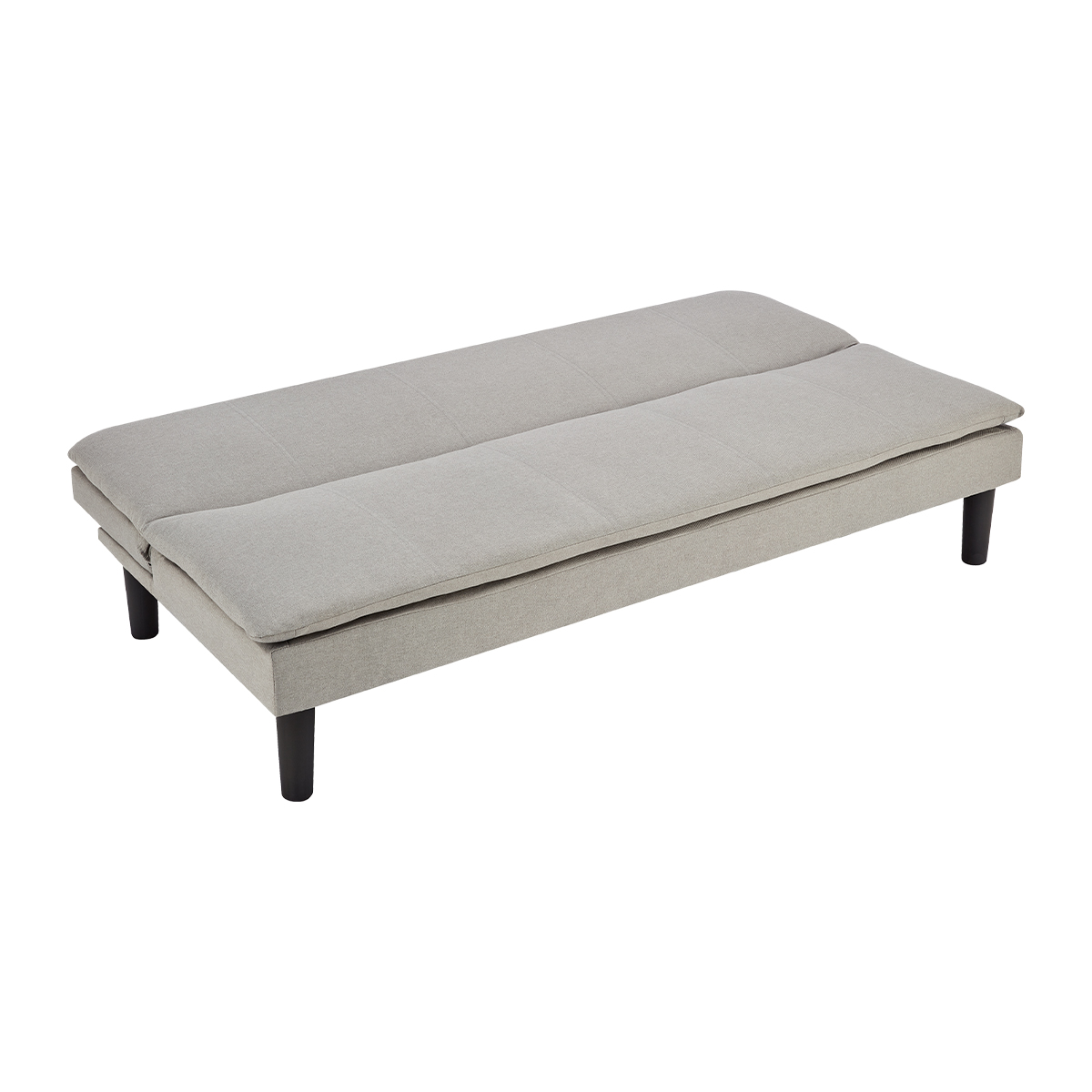 This three-seater sofa bed combines contemporary design with functional versatility, making it a stylish and practical addition to any living space. Its wooden legs and neutral light grey faux linen upholstery create a modern aesthetic while providing comfort and durability.