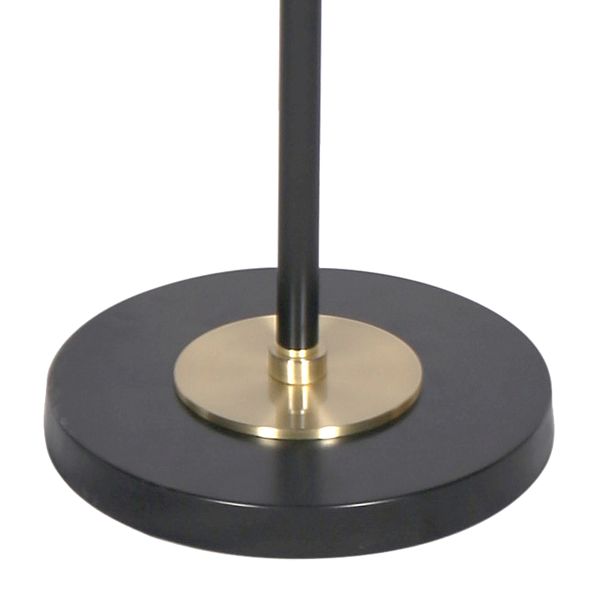 This adjustable two-light floor lamp features a sleek industrial design with a black and gold finish, adding a touch of modern elegance to any home or office space. Its slim profile and dual adjustable arms provide both style and versatile lighting options, making it suitable for living rooms, study areas, or workspaces.