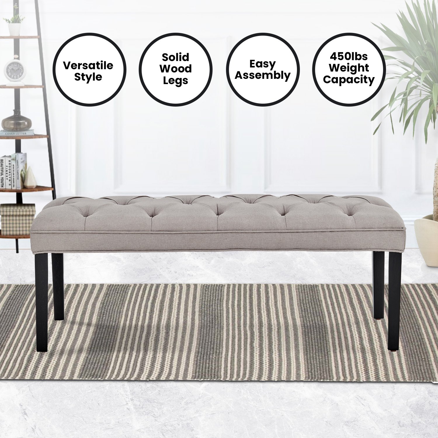 This upholstered bench features a stylish and sturdy design, making it a versatile addition to various areas of your home. It can serve as a dining bench, an end-of-bed seat, or an extra seating option in your hallway or living room. The button-tufted upholstery adds a touch of elegance, while the solid wooden legs ensure durability. Available in multiple shades, it complements a range of home decor styles and provides comfortable seating for you and your guests.