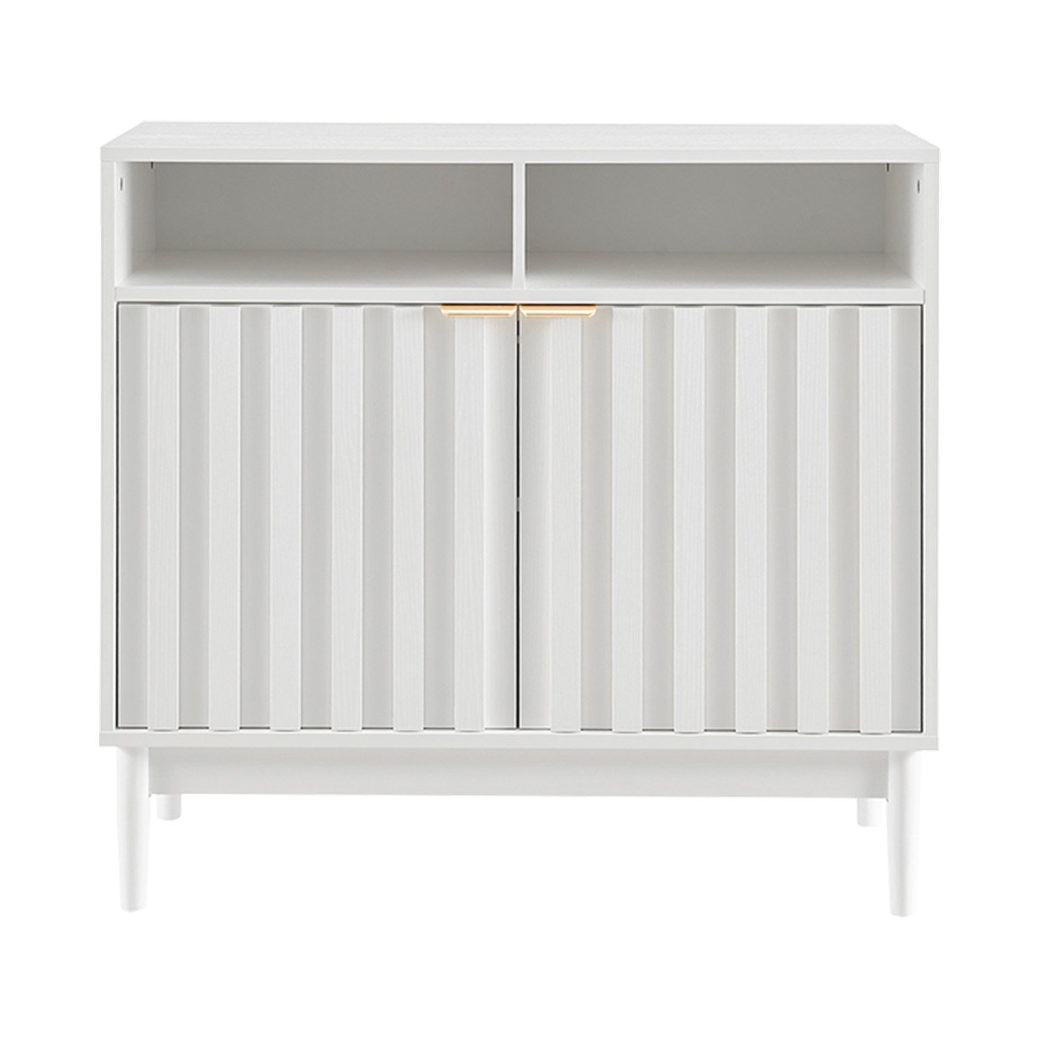 The sideboard combines elegance with rustic charm, featuring a modern farmhouse aesthetic. It has a sleek finish with fluted panels, adjustable shelves for versatile storage, and open niches for display. Supported by sturdy wood legs, it serves as a stylish and functional storage solution for various spaces.