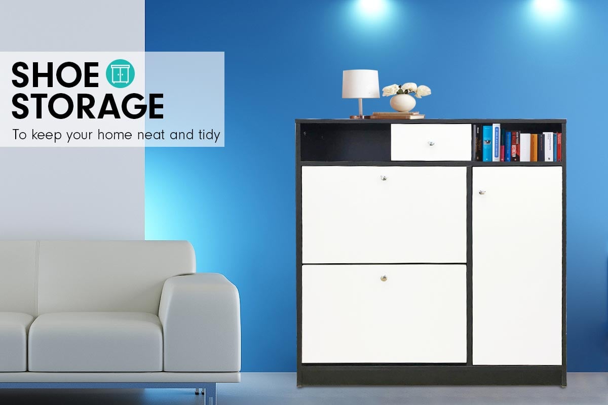 - Includes two drawers and a side door cabinet for shoe storage