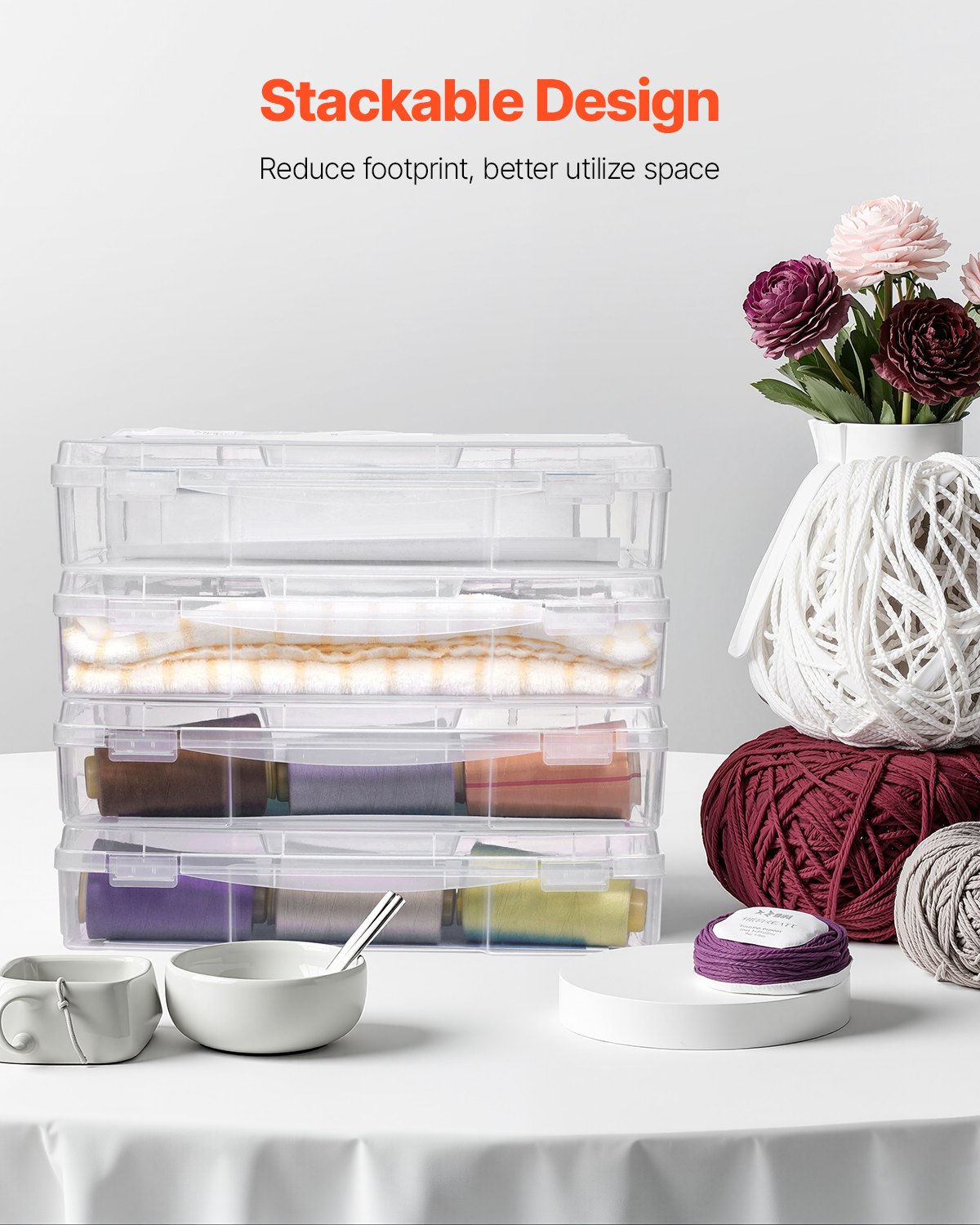 This set includes four stackable plastic storage boxes designed for organizing scrapbook paper and various craft materials. The boxes are clear, allowing for easy identification of contents, and feature a secure dual latch system to keep items safely enclosed. Their versatile design makes them suitable for use in different environments such as homes, offices, schools, and craft rooms, helping to maintain a tidy and organized space.