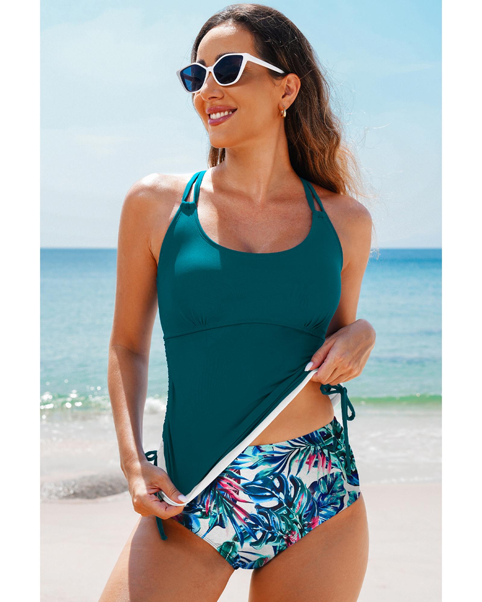 This stylish tankini swimsuit set features a trendy design with a comfortable fit, perfect for mixing and matching. The set includes a tankini top with a color block pattern and matching floral print swim shorts, offering a coordinated look for your beach or pool outings.