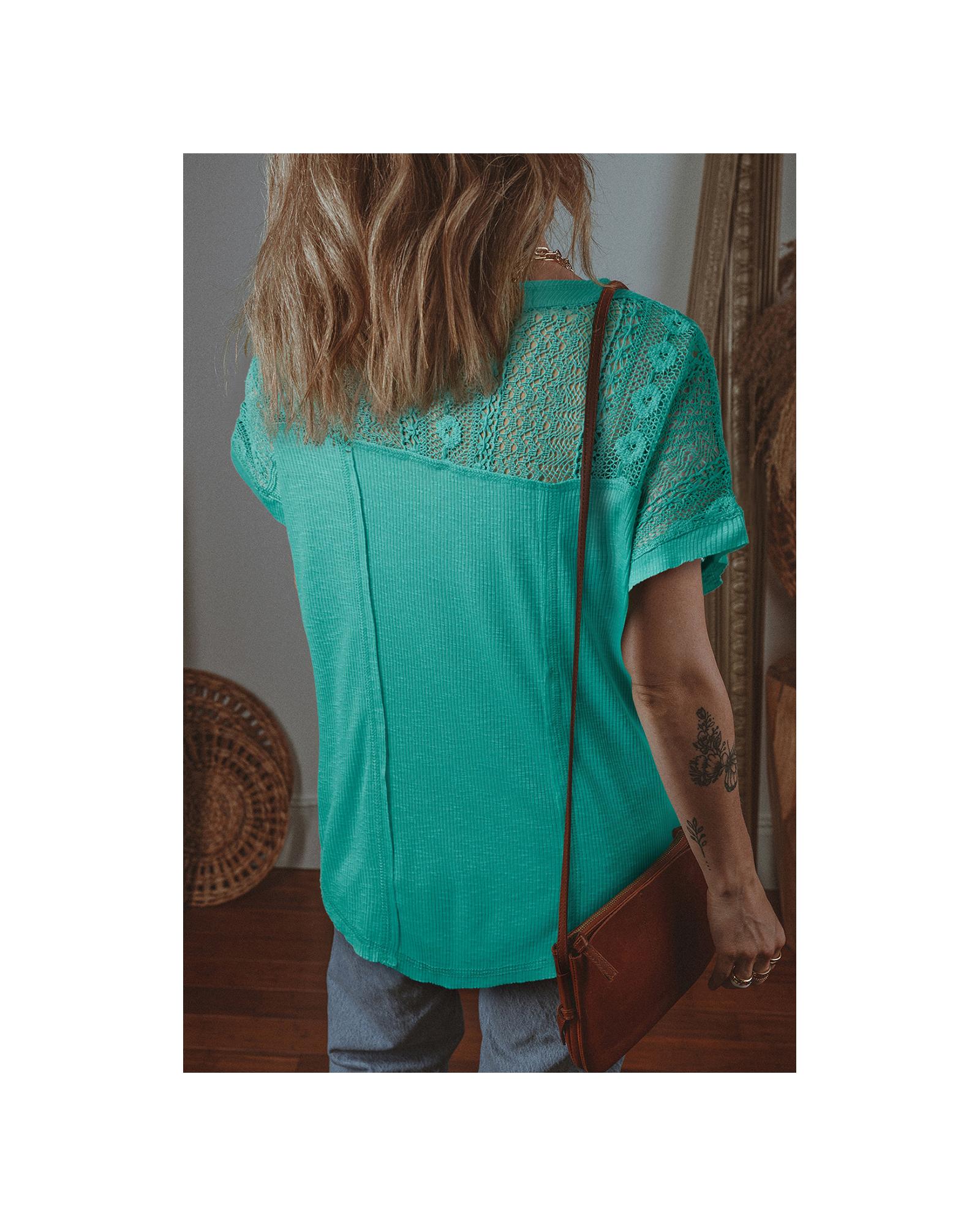 Sea Green Lace Patchwork Split Neck Textured Short Sleeve Blouse – XL