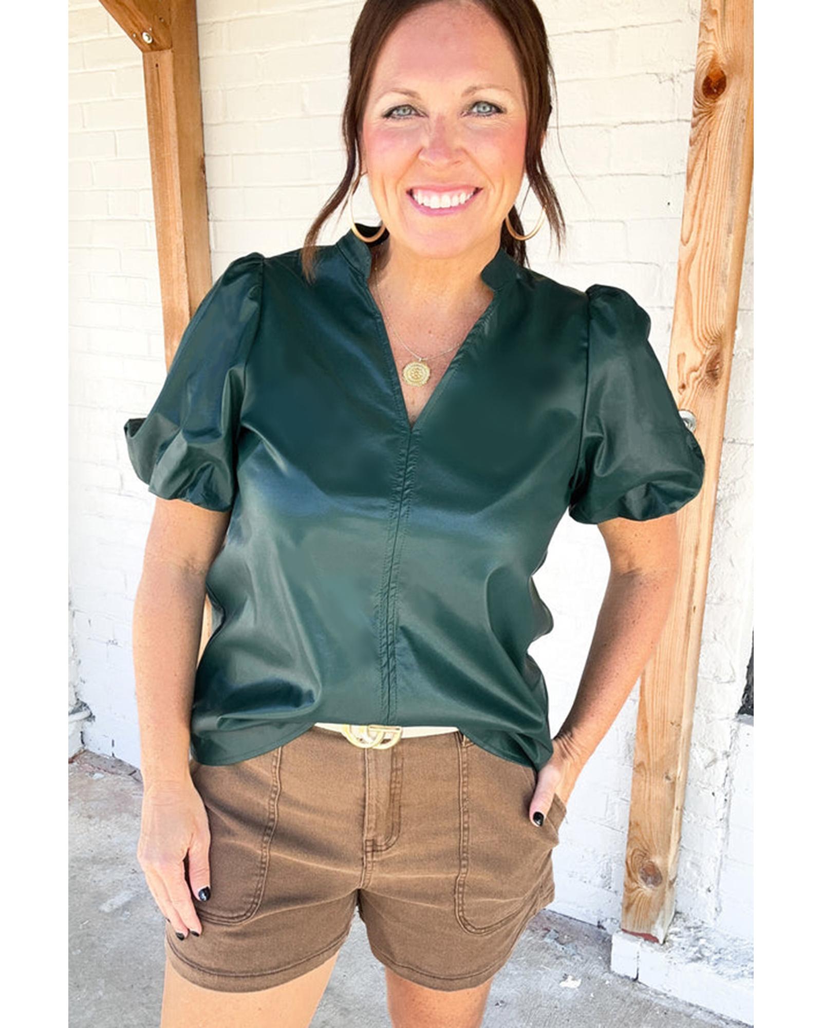 Sea Green Notched V Neck Short Puff Sleeve PU Leather Blouse – S