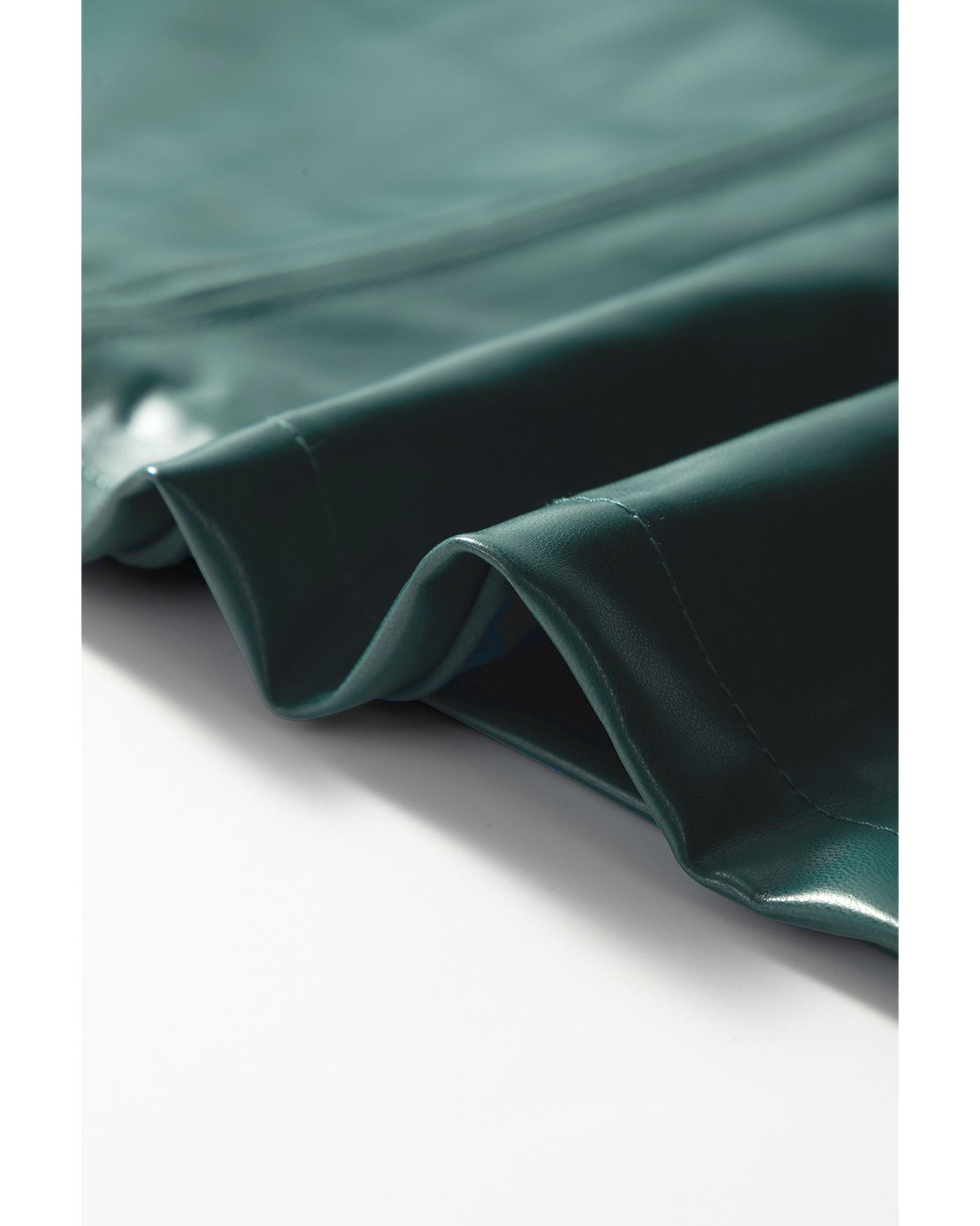 Sea Green Notched V Neck Short Puff Sleeve PU Leather Blouse – XL