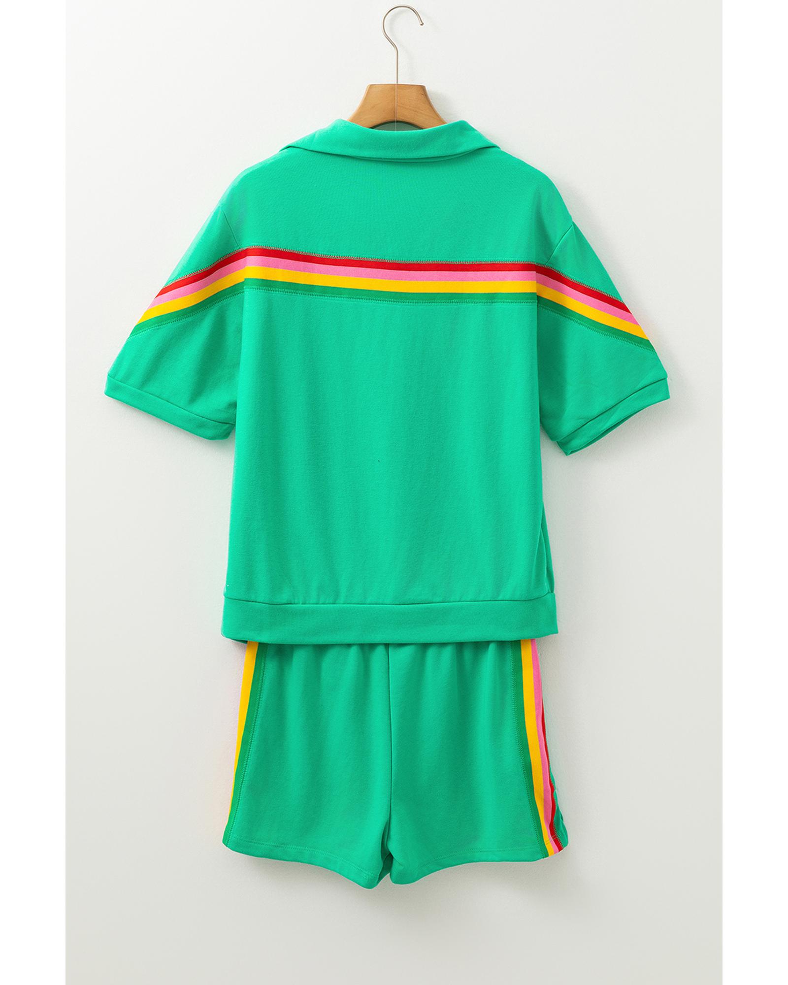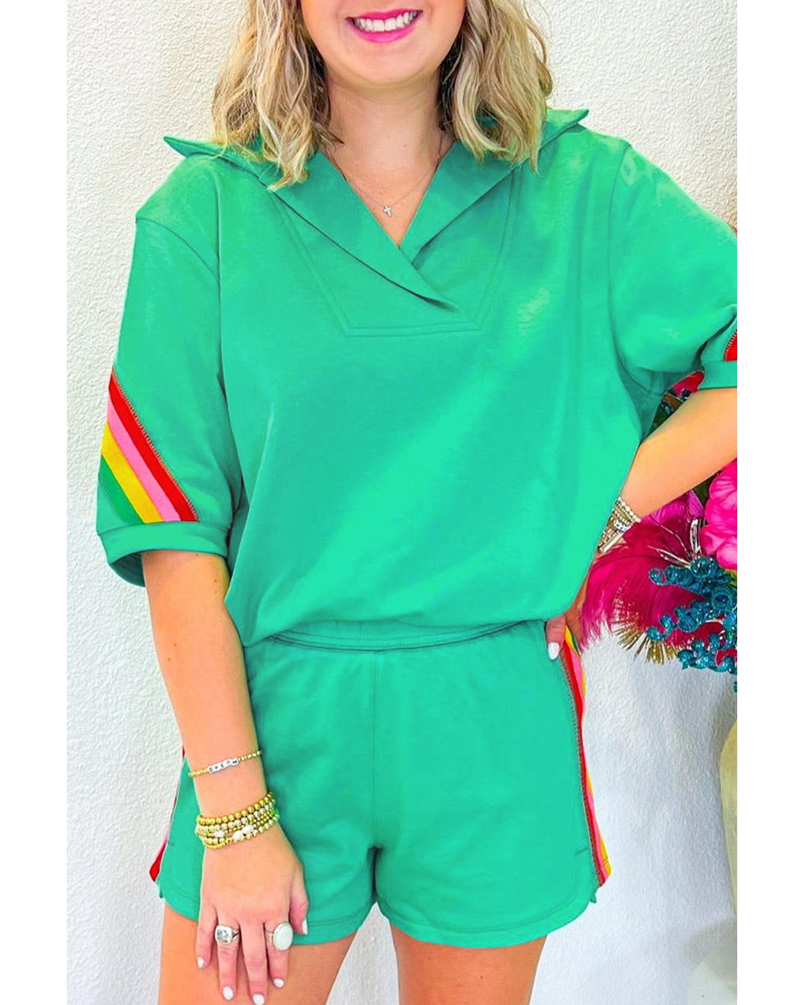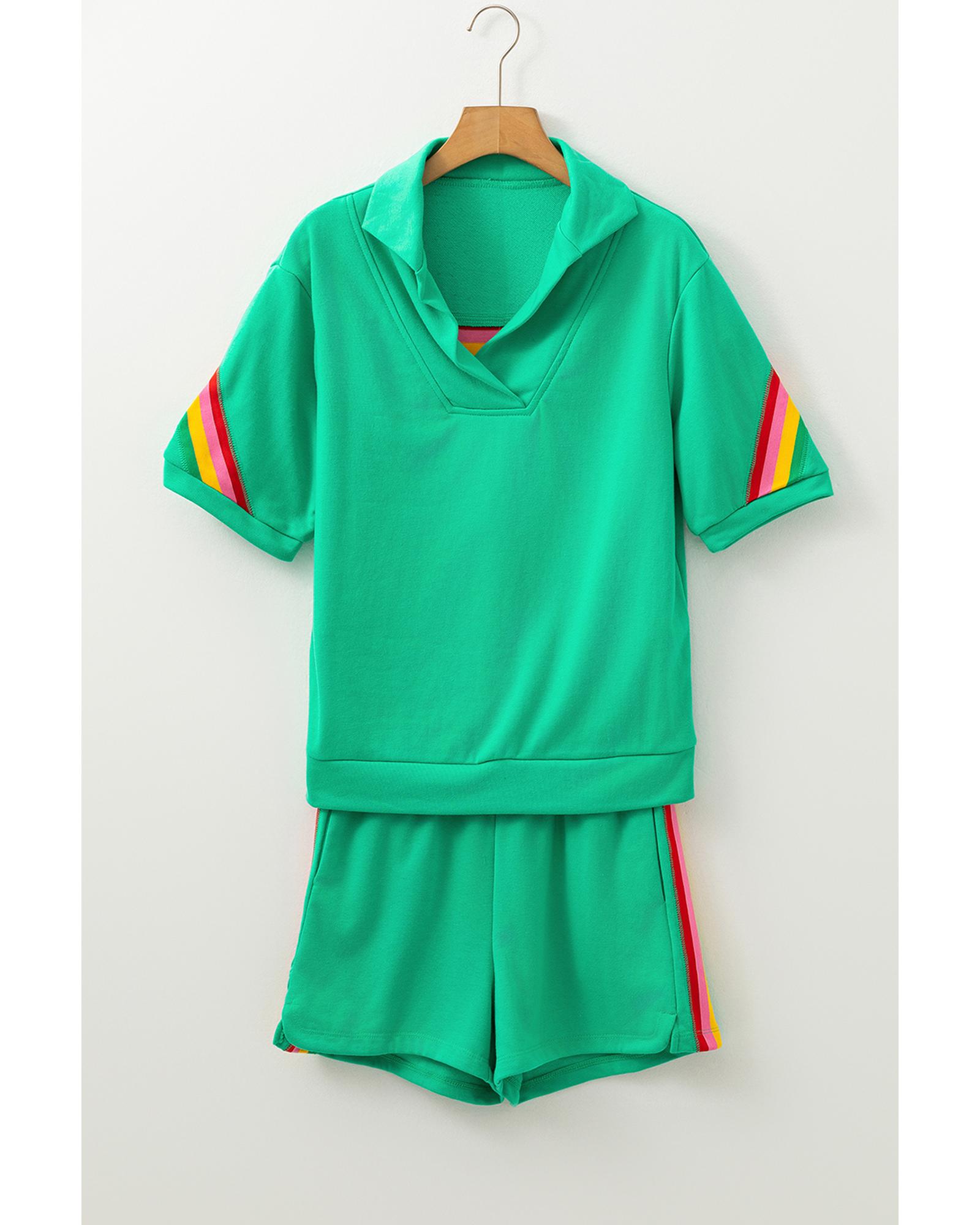 Sea Green Rainbow Colorblock Collared Short Sleeve Top 2 Piece Shorts Set – XL