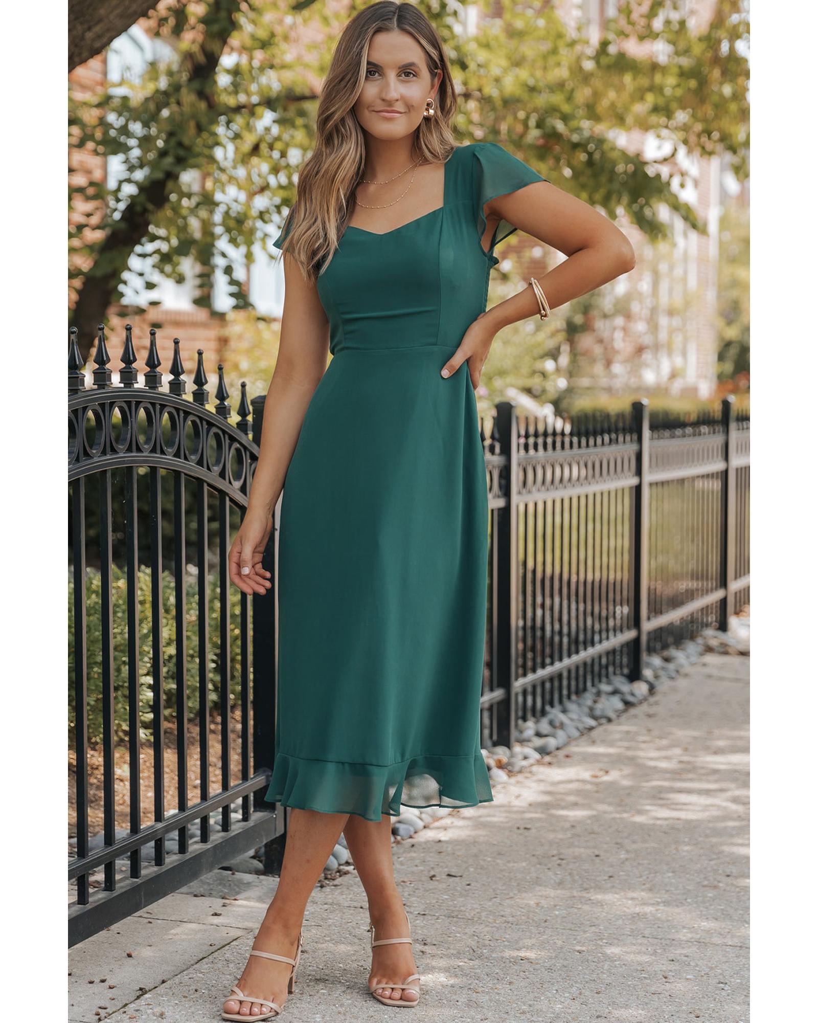 This dress features a trendy fitted silhouette with a flowy style, perfect for casual summer occasions. It has a shirred cut with a ruffled hem, a sweetheart neckline, and flutter sleeves, creating a charming and feminine look. The midi length adds elegance to the overall design.