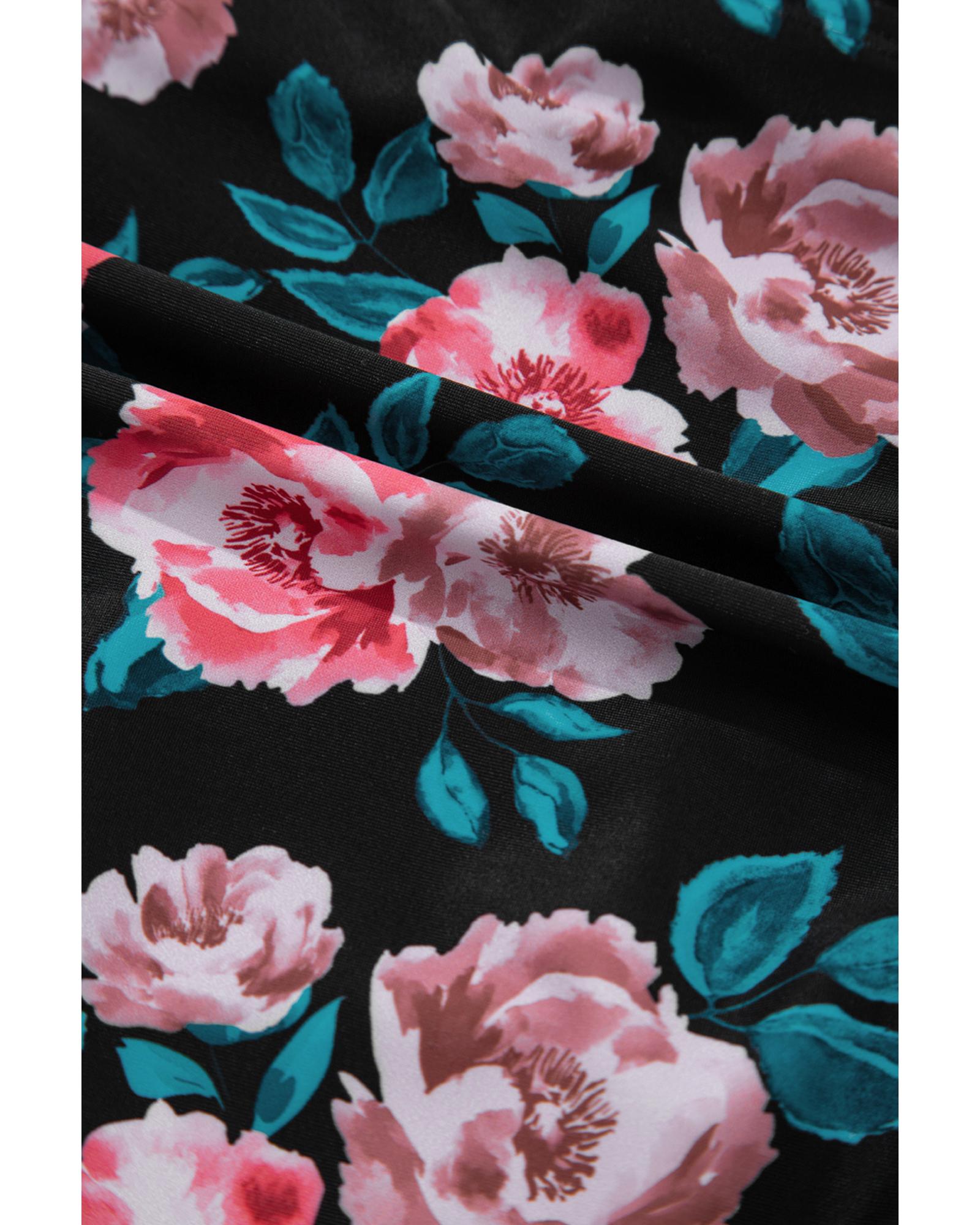 This swimwear set features a stylish and trendy design, perfect for a fashionable beach or poolside look. The set includes a ruffled square neck swim top and floral pattern bikini shorts, combining comfort with a chic appearance.