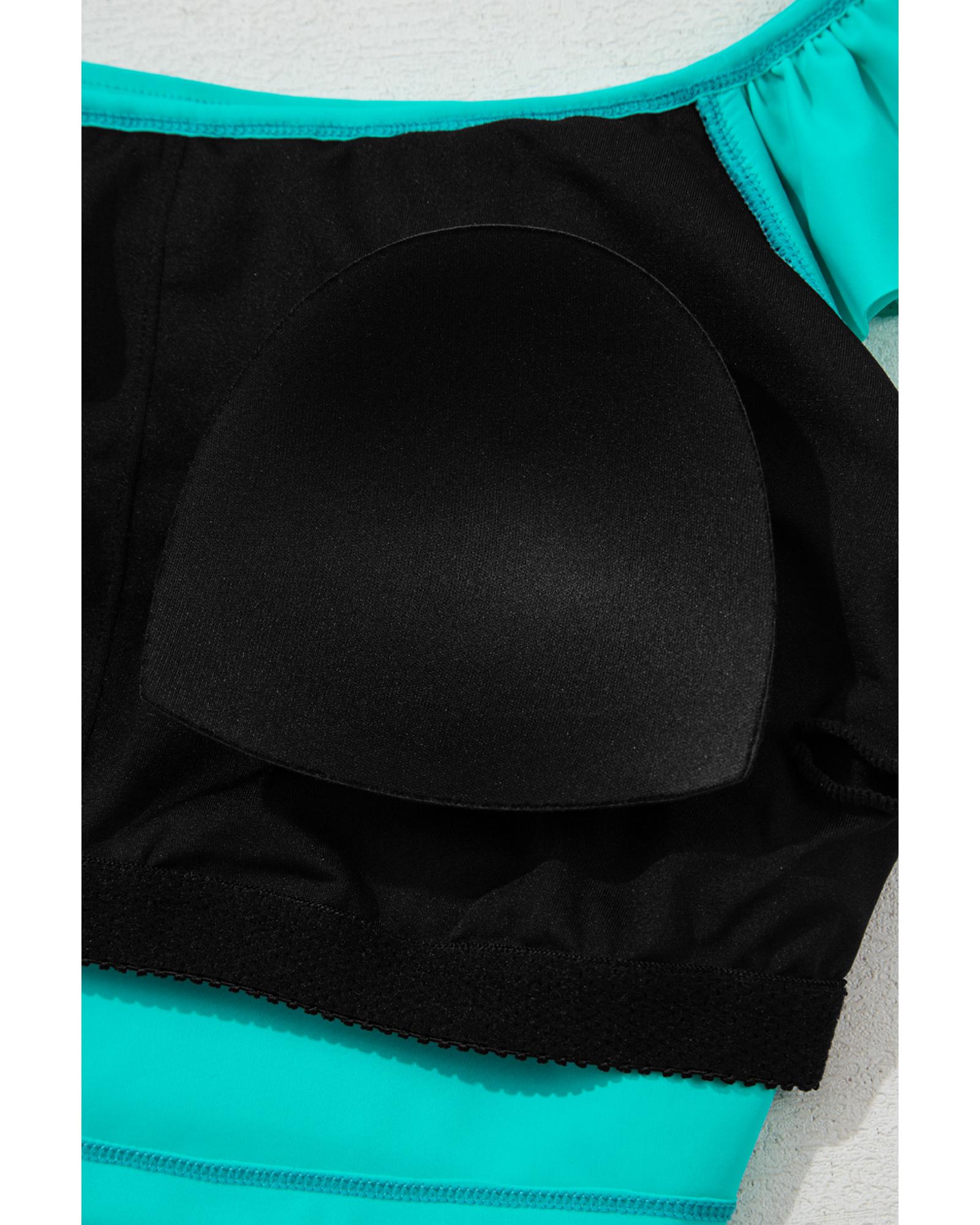Sea Green Solid Ruffled Square Neck Swim Top and Floral Shorts Bikini Set – XL