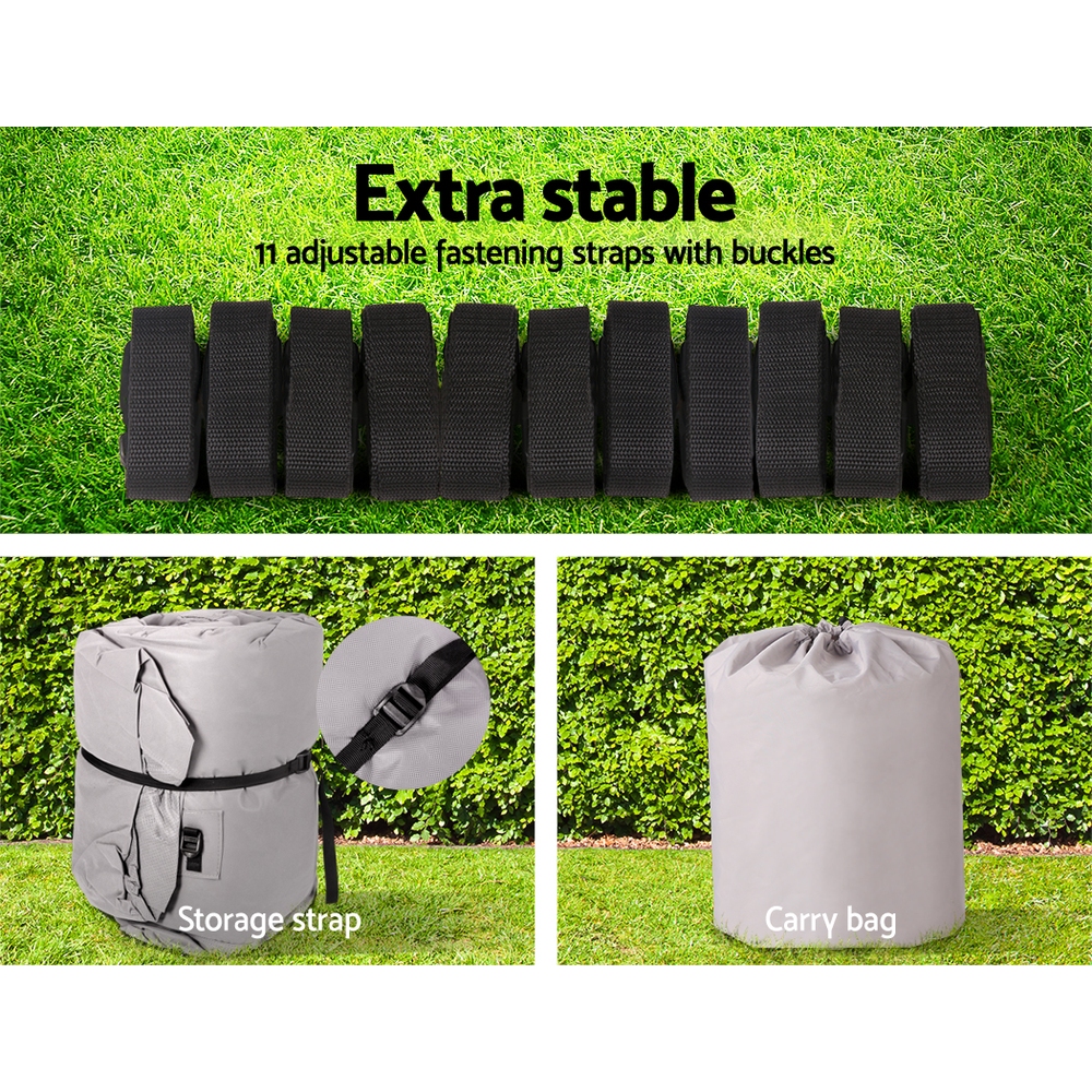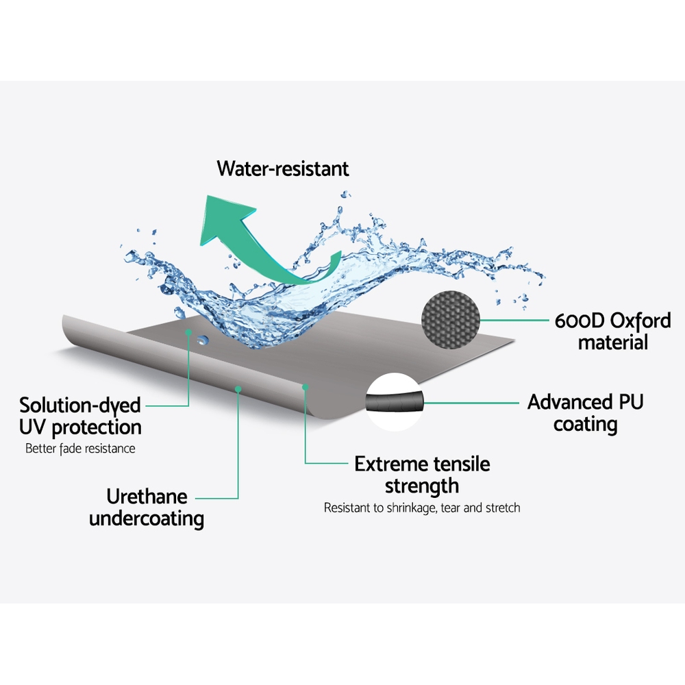 This boat cover is designed to fit watercraft with a length between 16 and 18.5 feet and a maximum beam width of 94 inches. Made from durable marine-grade polyester with a PU coating, it offers effective UV protection and mildew resistance. The cover features elastic hems for easy fitting and double-stitched seams for enhanced strength. It is equipped with adjustable fastening straps and heavy-duty loops for secure attachment to a trailer. The package includes a carry bag with a convenient carry strap for easy storage and transport.