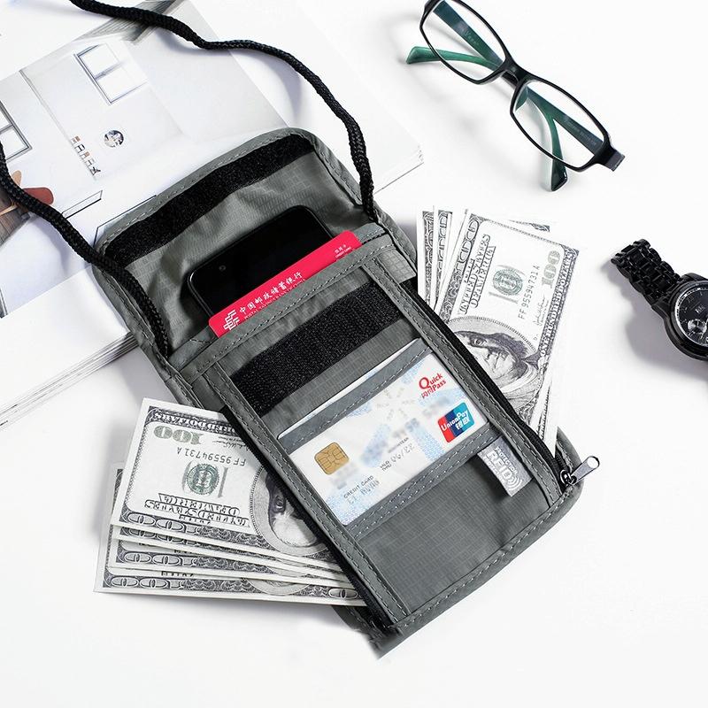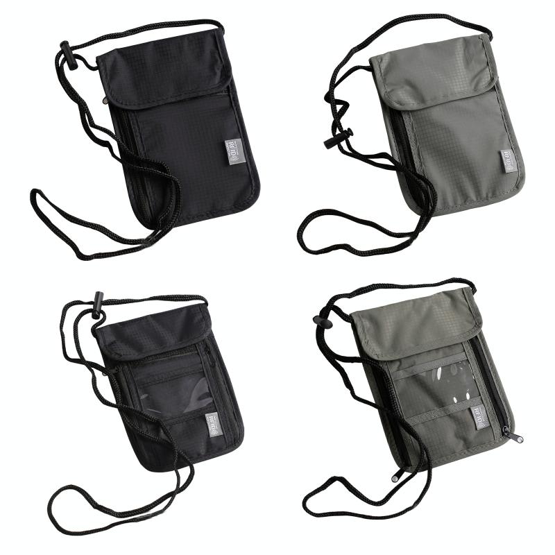 This secure hanging neck bag is designed for travel documents, offering RFID blocking protection to safeguard your personal information. Made from durable nylon, it features multiple pockets for organized storage and a transparent PVC sheet for easy content visibility. The bag is lightweight, soft, breathable, and resistant to tearing, providing reliable protection and convenience during travel.