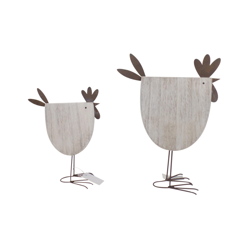 This decorative set features two standing French country-style chooks, designed to add a charming touch to your home decor. The finely detailed ornaments are suitable for enhancing various interior spaces with a rustic aesthetic.