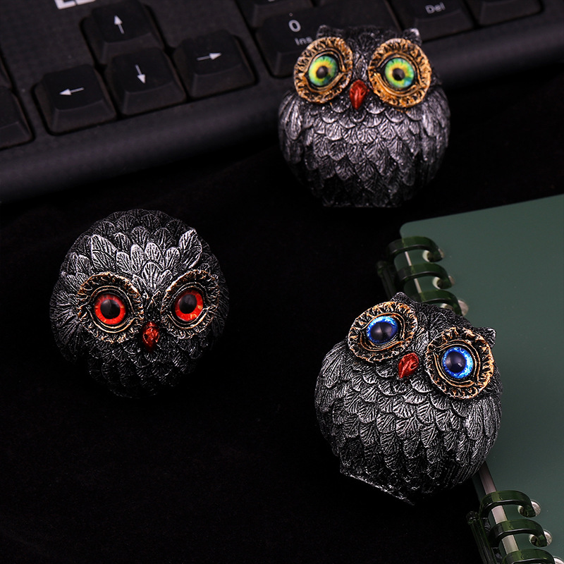 Set of Three Groups of Three Colors Small Decorative Resin Owl Figurine – Textured Statue with Blue Eyes(Blue, Green, Red)
