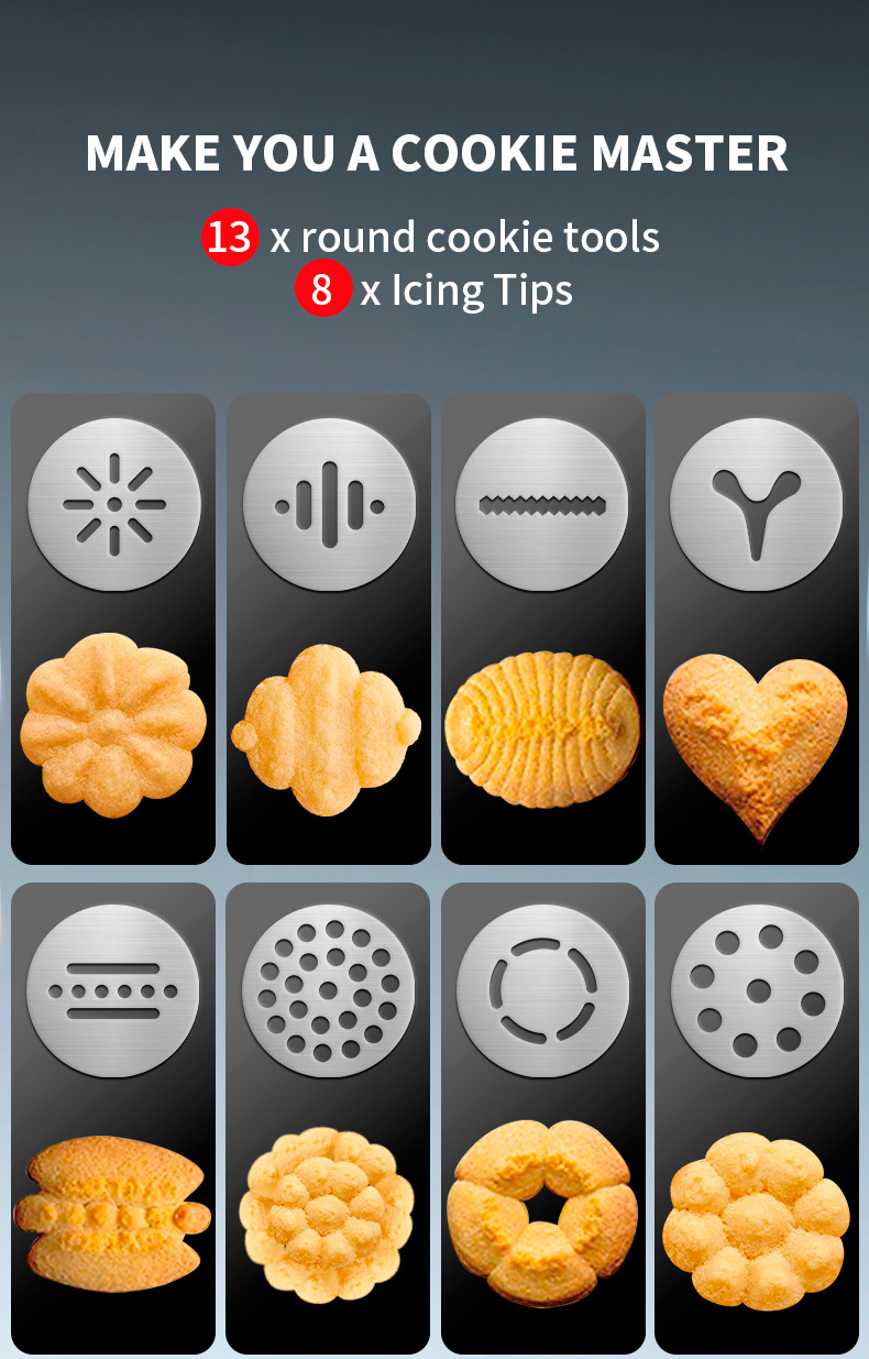 - Includes one durable stainless steel cookie press gun, thirteen interchangeable cookie discs for different shapes, and eight stainless steel icing nozzles for detailed decorating.