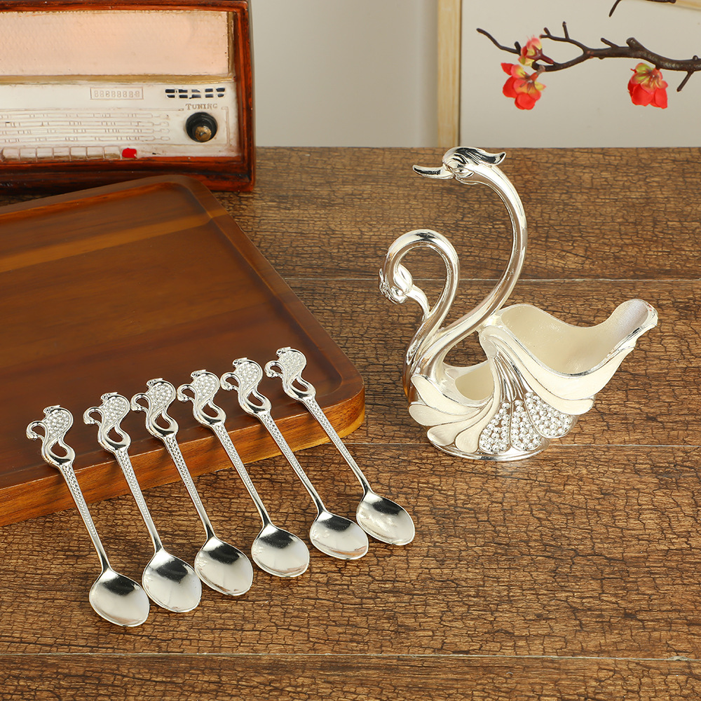 Silver Elegant Double Swan Cutlery Holder Set with 6pcs Spoons