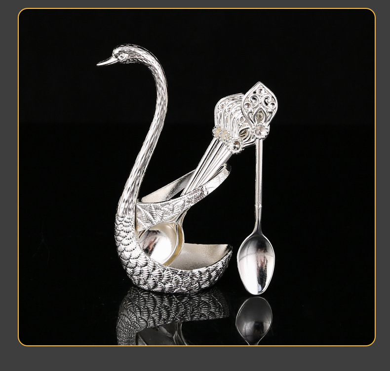 Silver Elegant Swan Cutlery Holder Set with 6 Dessert Spoons
