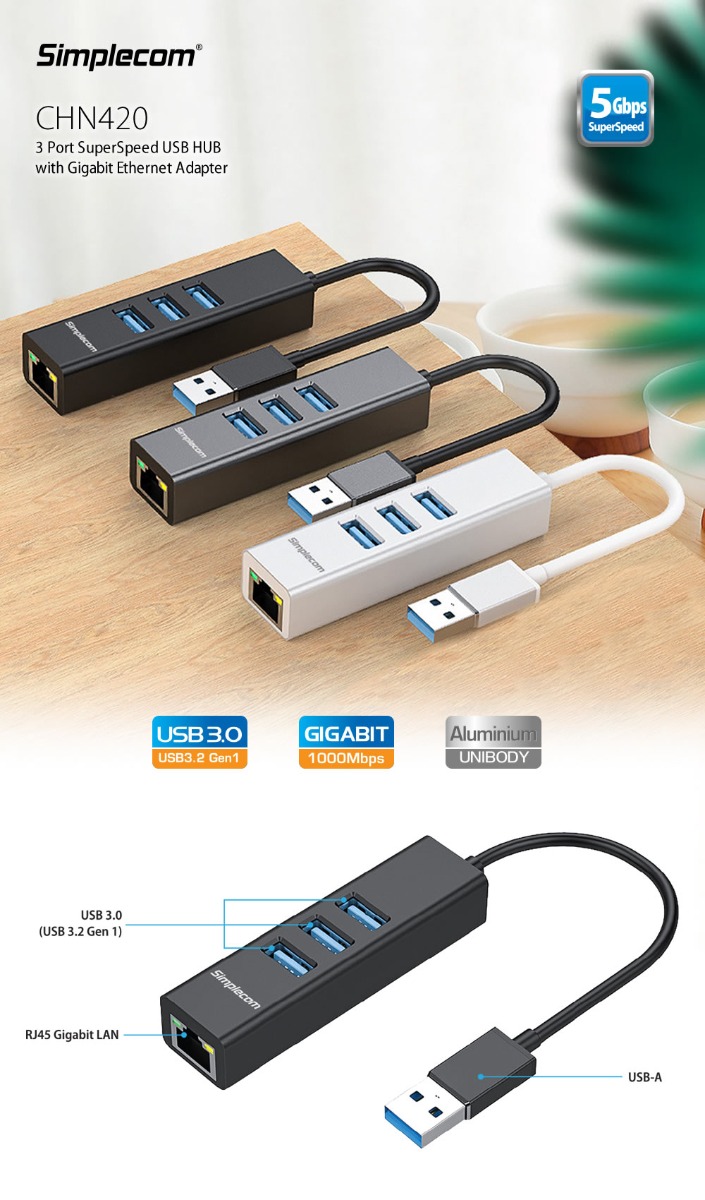 Simplecom CHN420 Aluminium 3 Port SuperSpeed USB HUB with Gigabit Ethernet Adapter Black