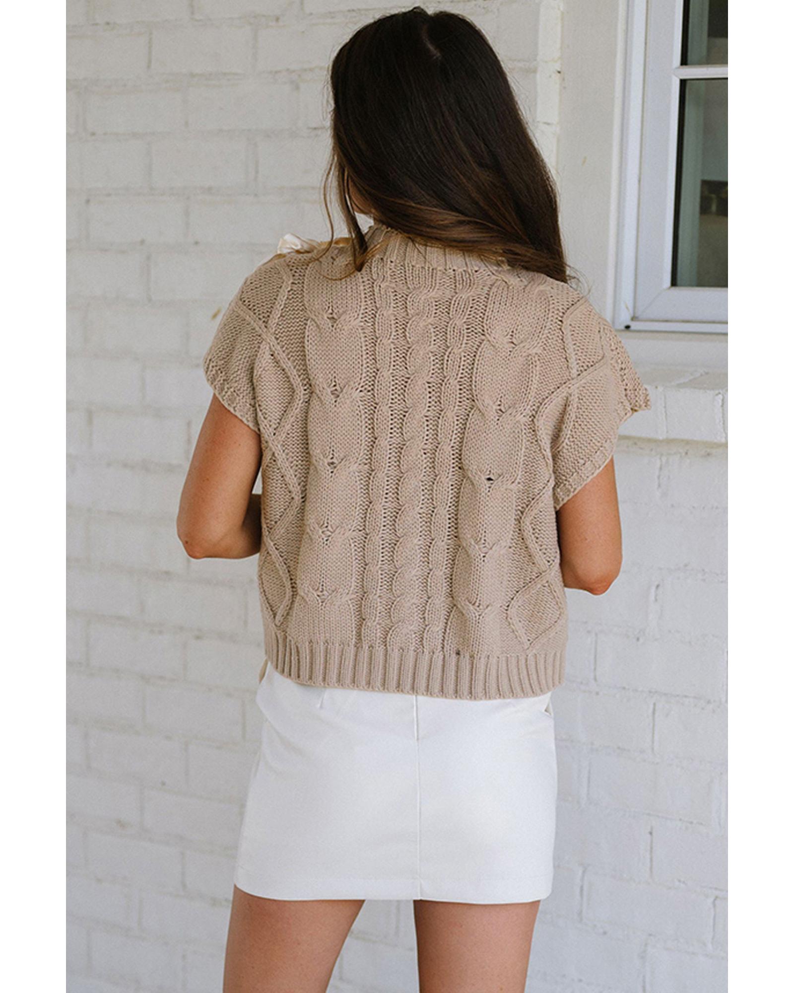 Simply Taupe Cable Knit Colorblock Satin Bowknot Short Sleeve Sweater – S