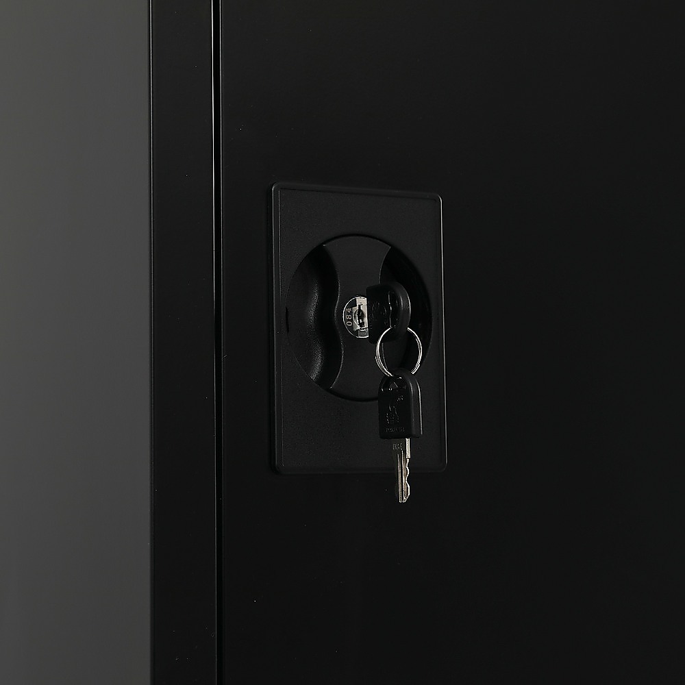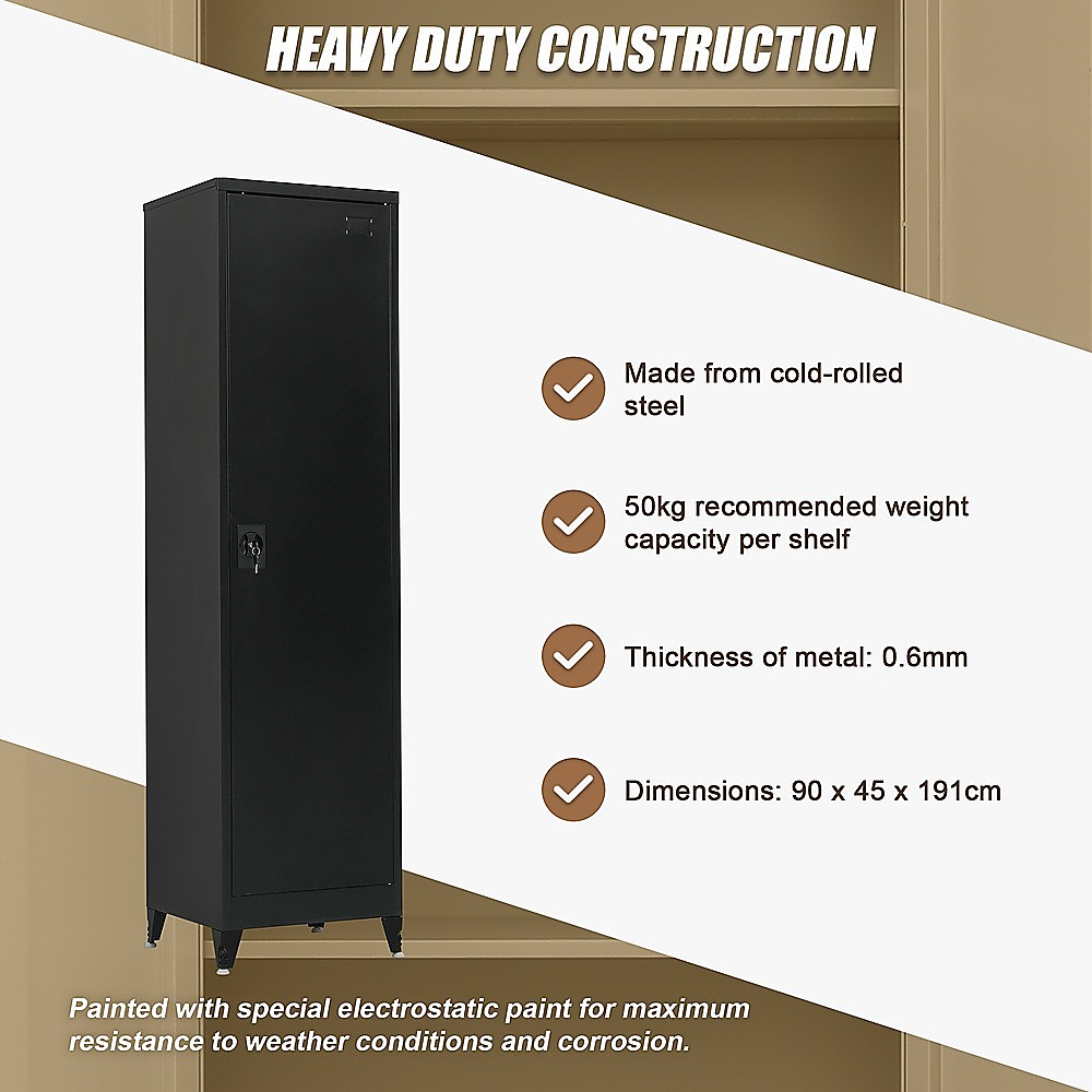 This metal tall cabinet offers a compact and lockable storage solution suitable for home, office, or gym environments. Its sturdy construction and organized interior make it ideal for keeping items secure and out of sight.