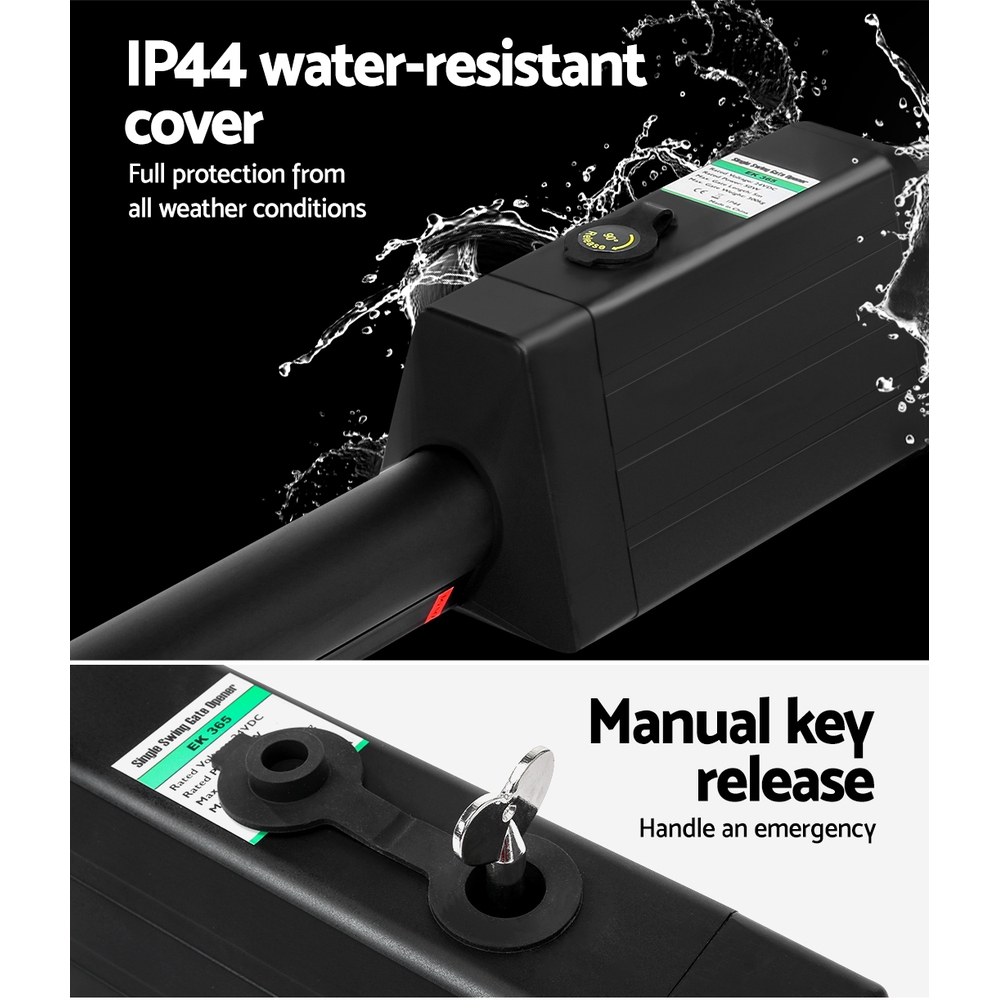 This gate opener is designed for easy and eco-friendly operation, providing smooth opening and closing with safety features that detect obstructions and automatically stop or reverse. It includes a remote control for convenient access and an emergency release key for power outages. The system is weather-resistant and suitable for various gate types.