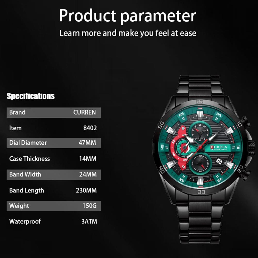 Six-hand Business Quartz Watch with Steel Strap – Calendar – Black Shell Green