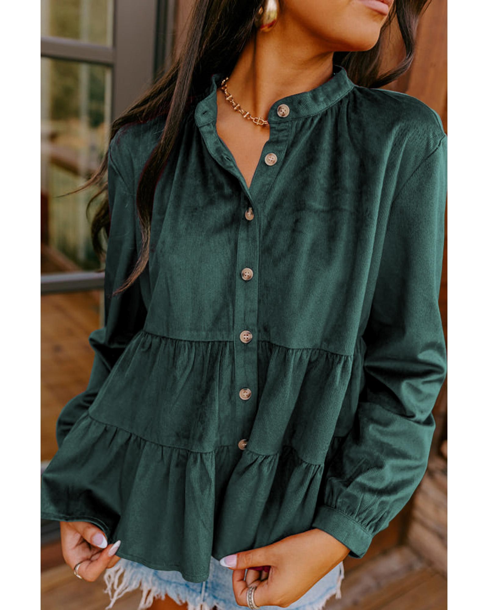 This corduroy ruffle tiered shirt features a stylish and trendy design with a flattering O neck collar. Made from soft and textured polyester, it offers a comfortable fit with an elegant layered look. The shirt is easy to wear with a convenient button closure and is available in various sizes to suit different preferences.