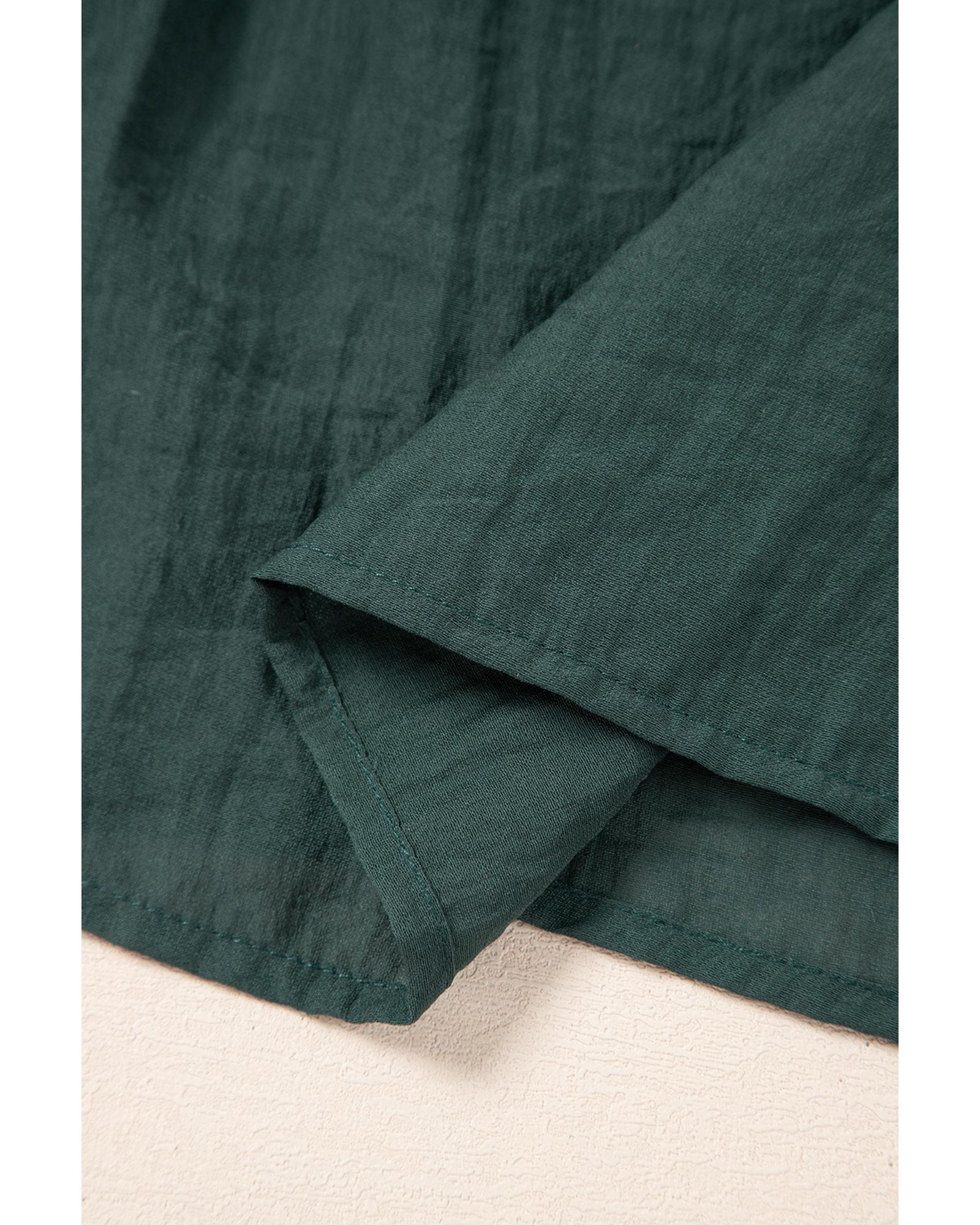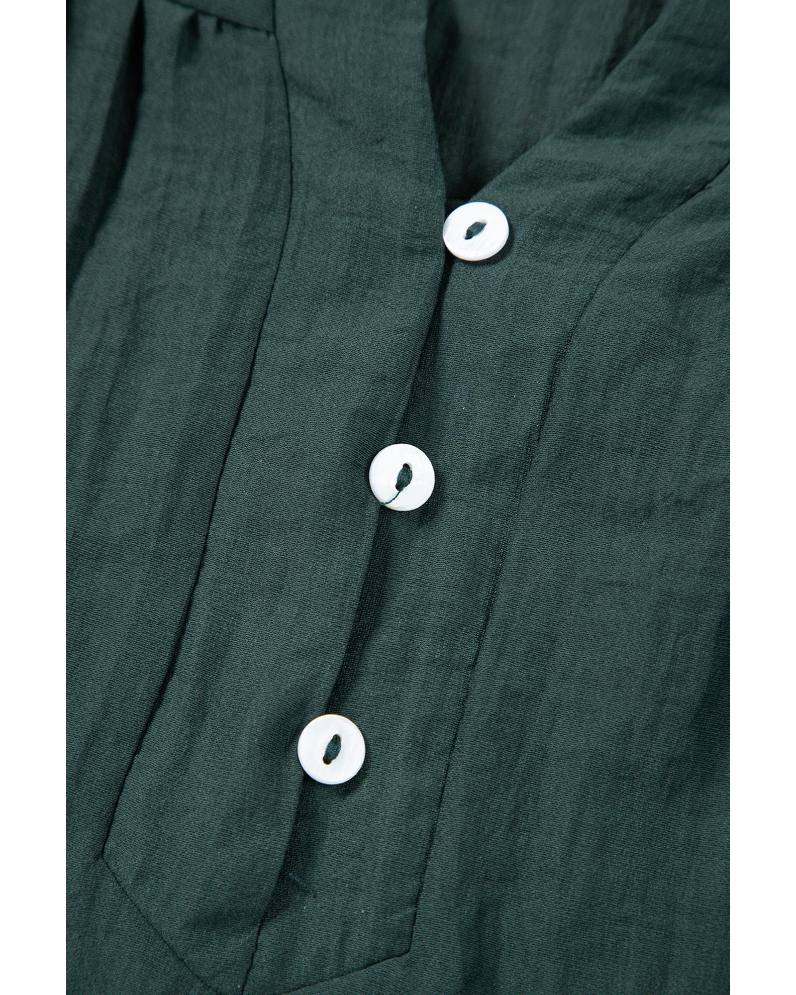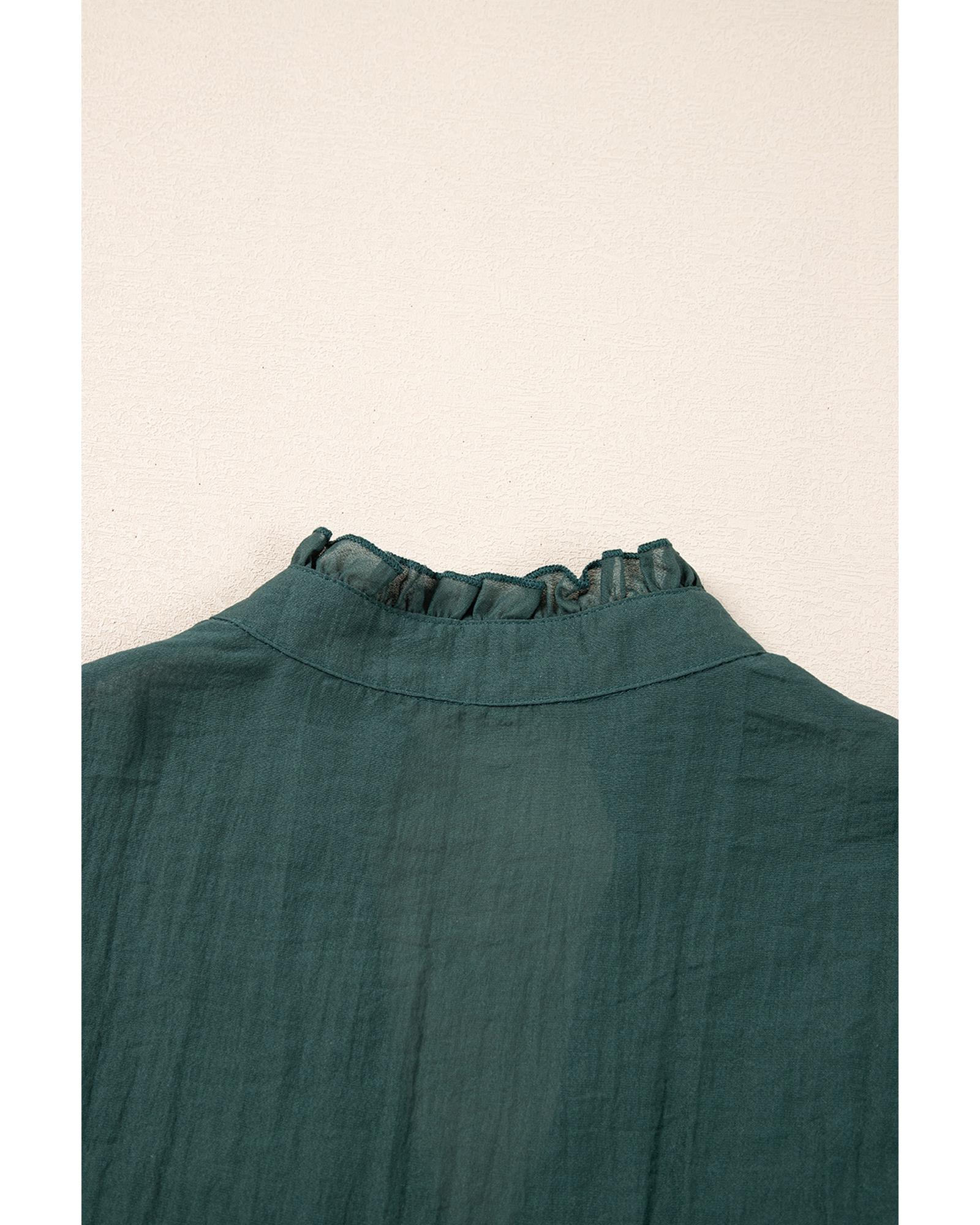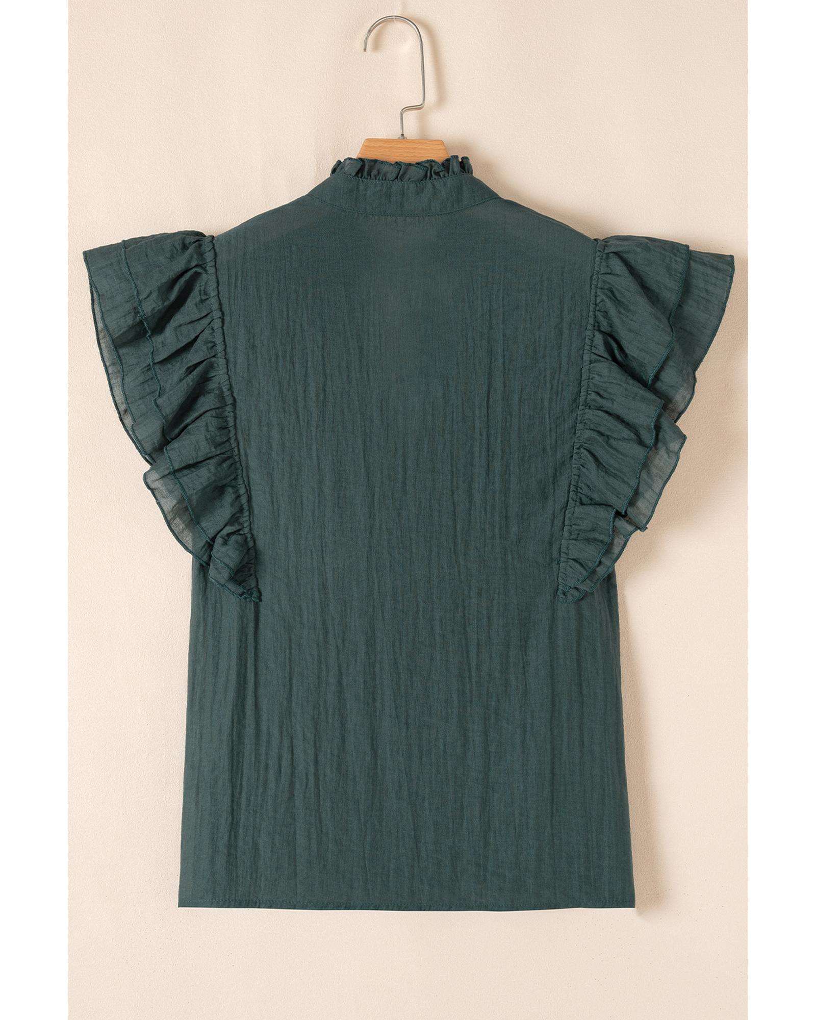 This blouse features a delicate frilled V neckline and stylish ruffled cap sleeves, offering a feminine and trendy appearance. It is versatile and pairs well with both pants and skirts, making it suitable for various occasions.