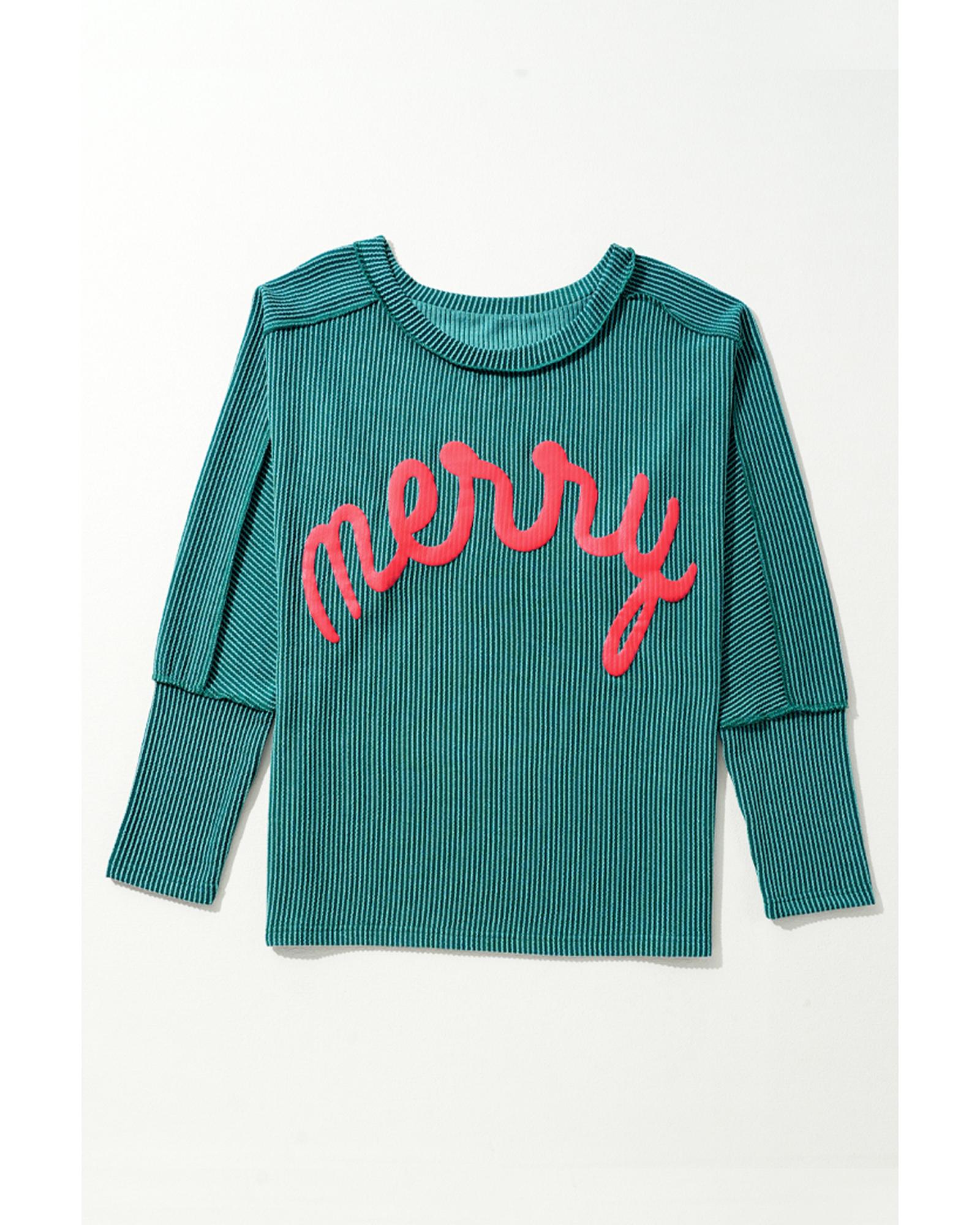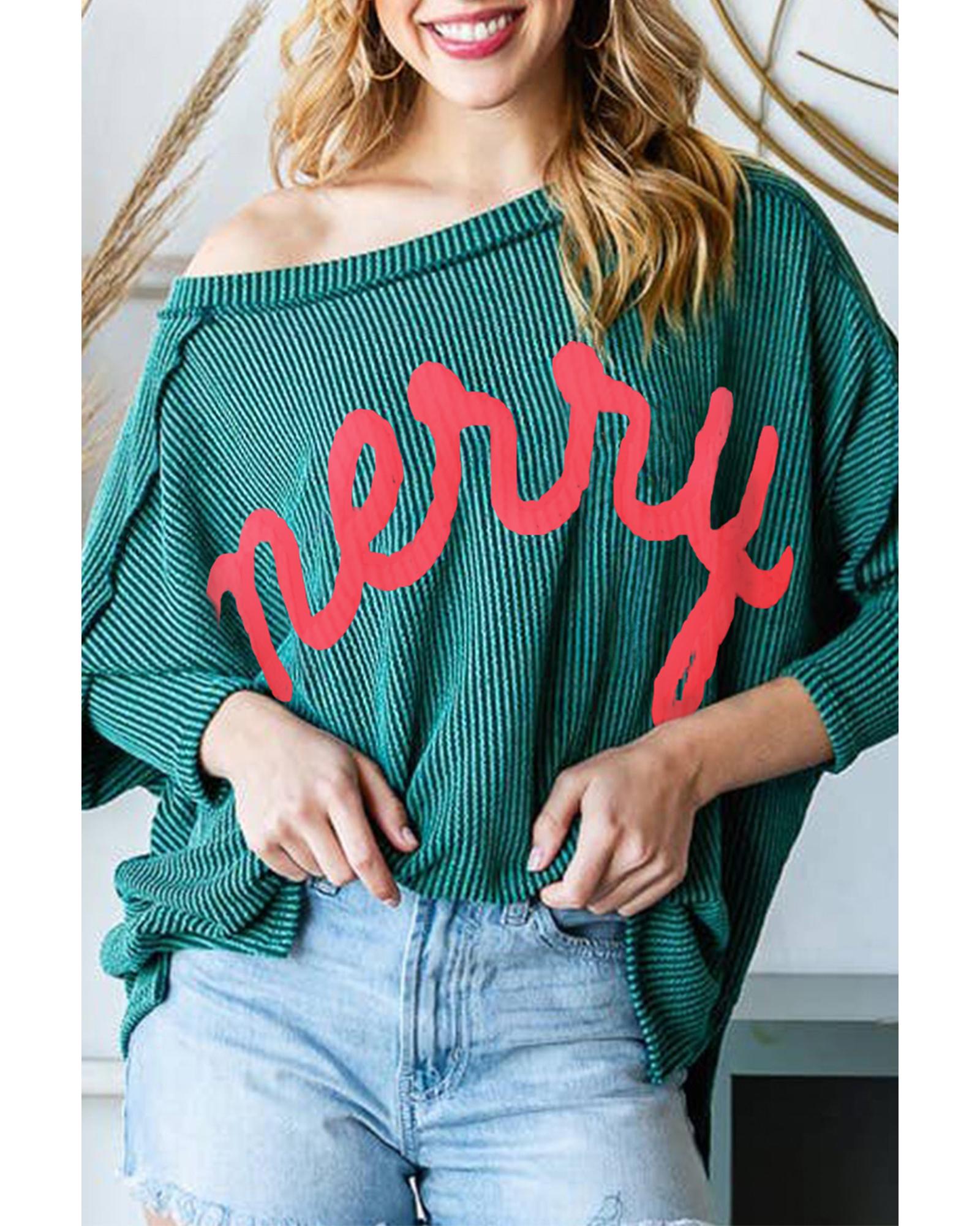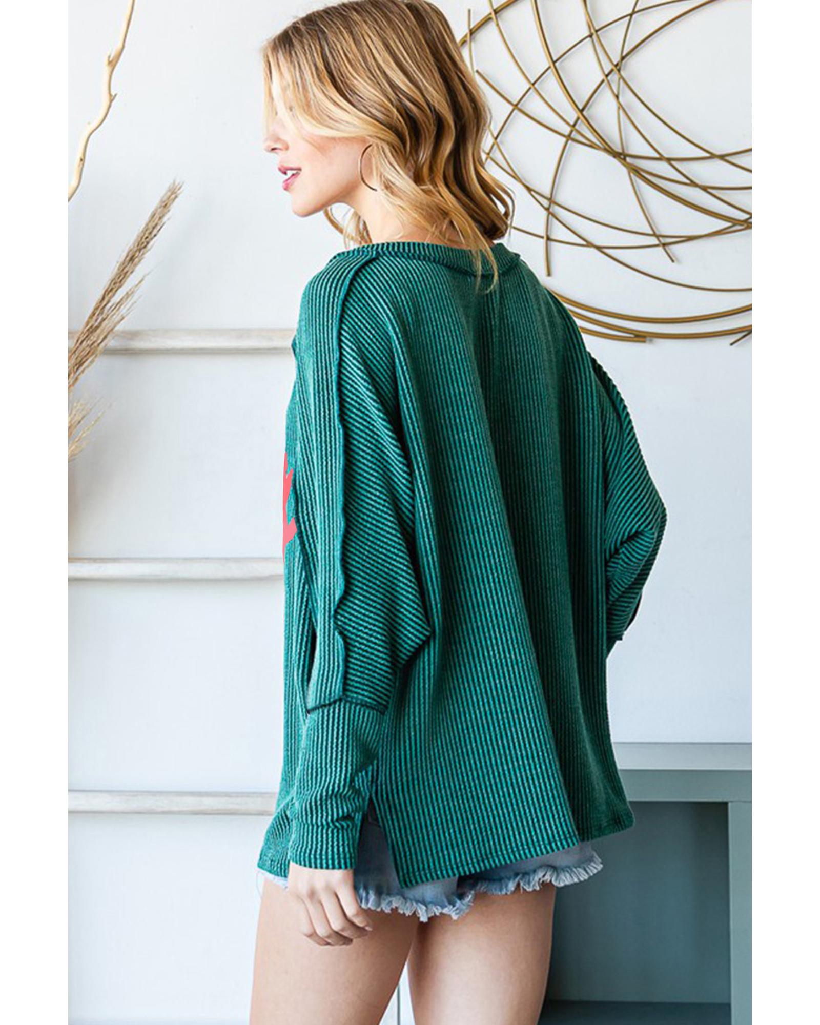 This knit top features a trendy fitted silhouette with a graphic design, making it suitable for casual and holiday wear. The corded knit fabric offers a fine textured touch, complemented by fashionable batwing sleeves and chic exposed stitching for a stylish look.