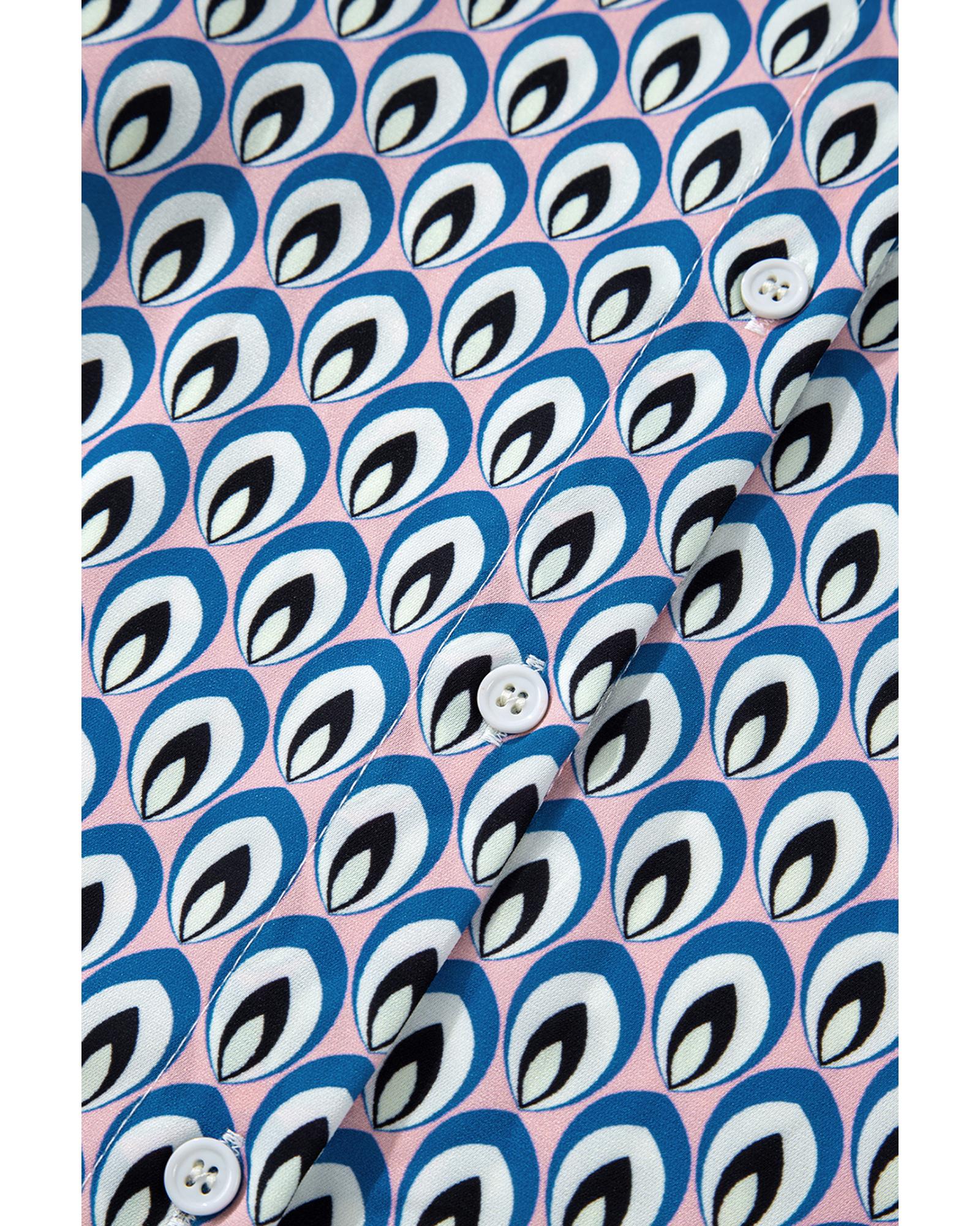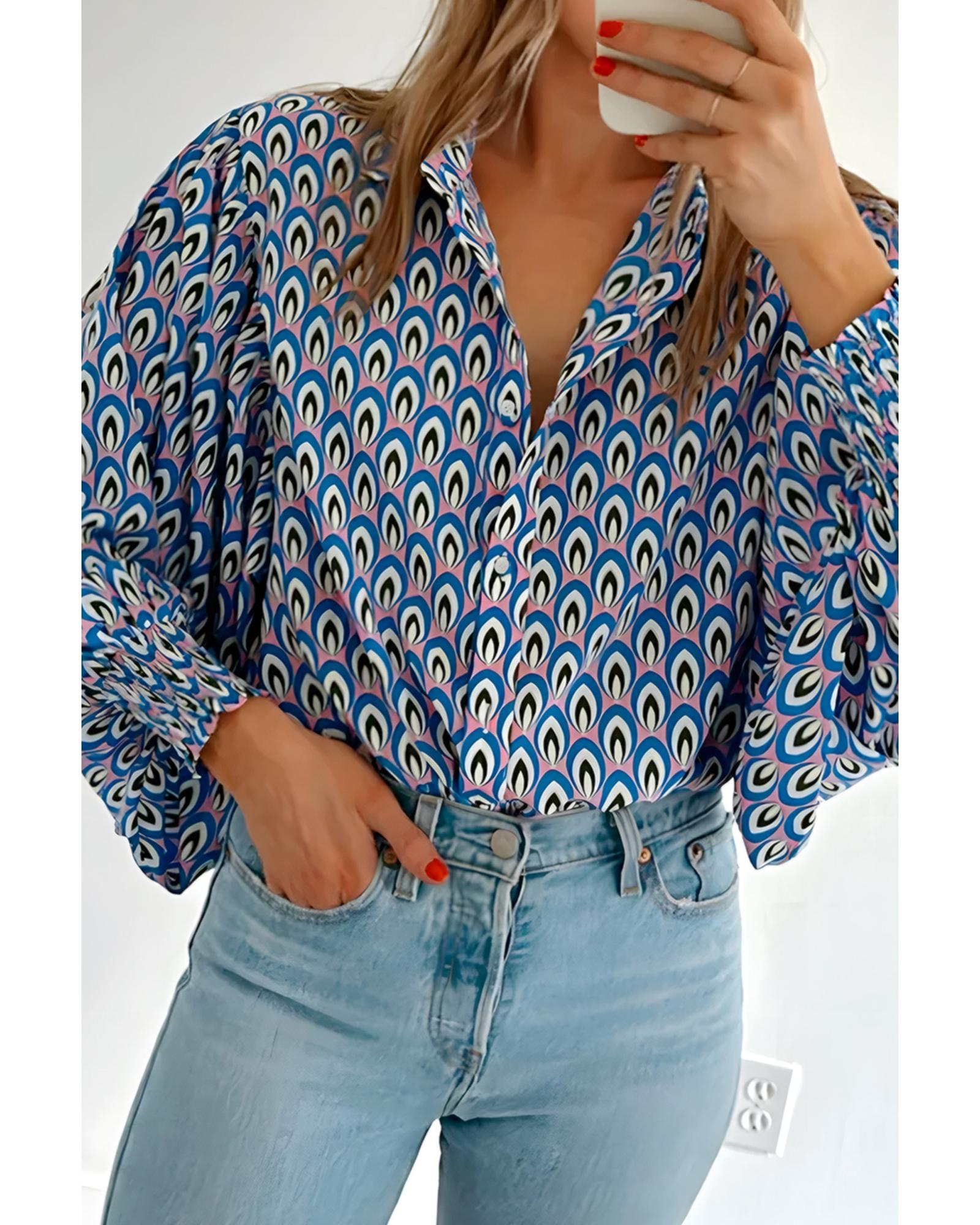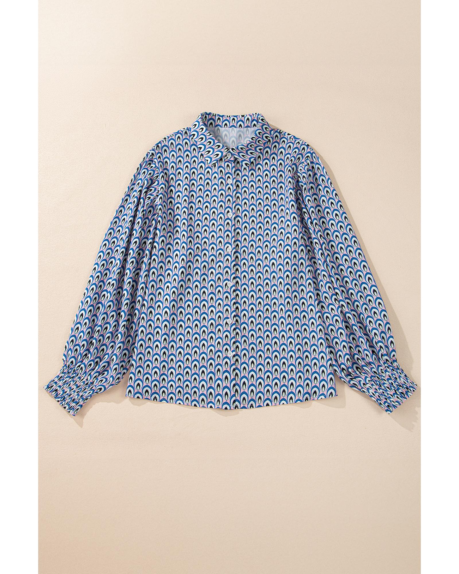 Sky Blue Abstract Print Shirred Cuff Buttoned Oversized Shirt – S