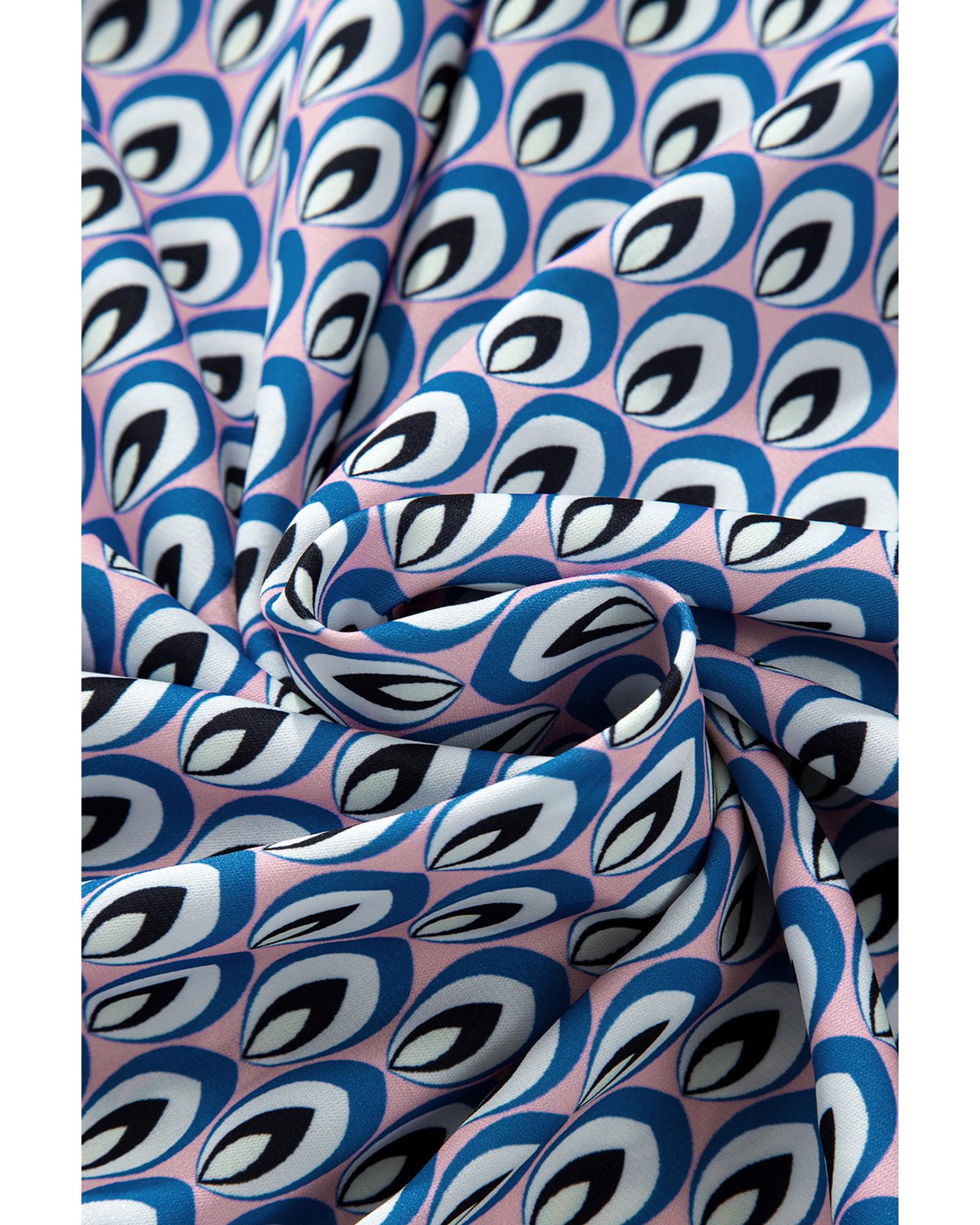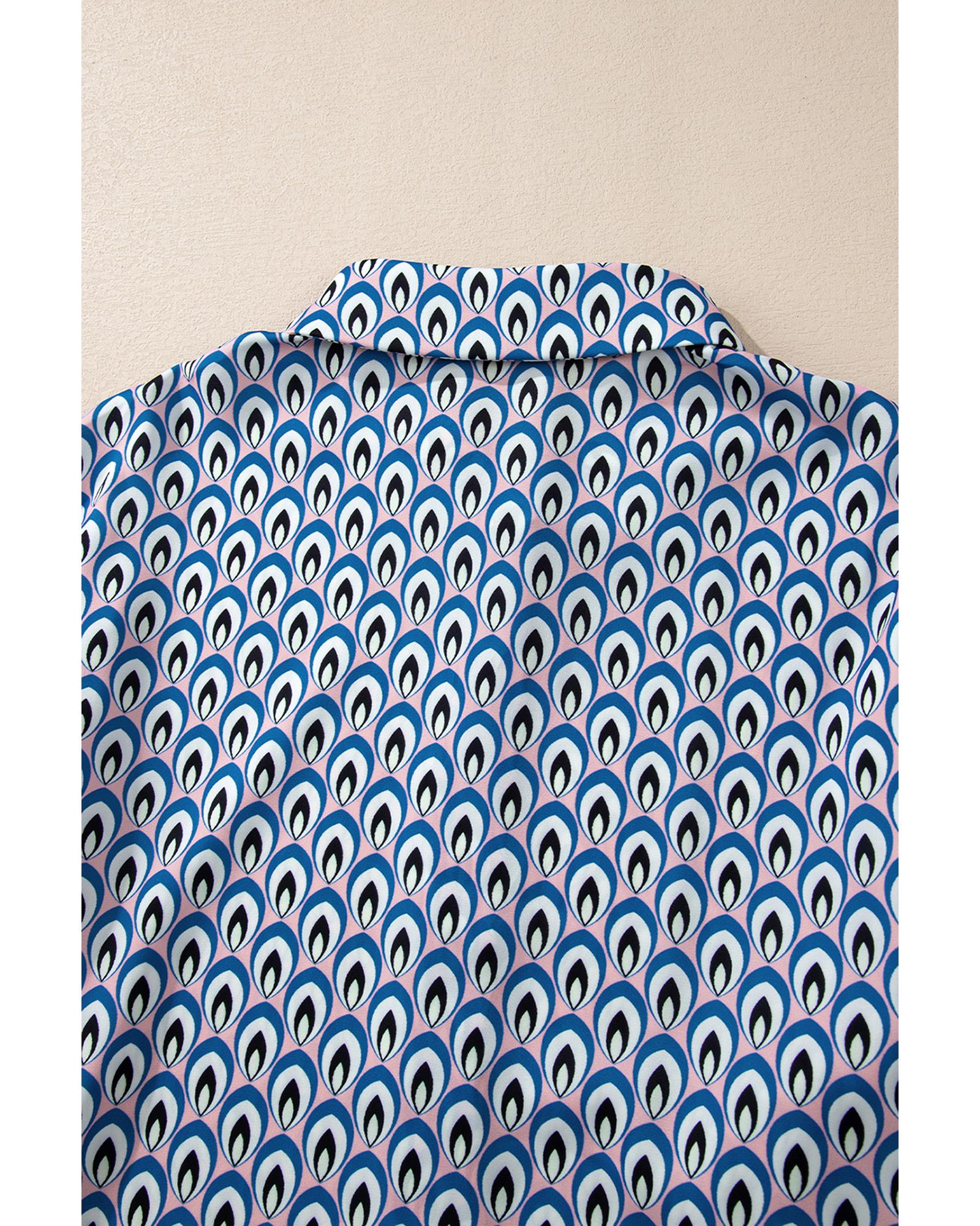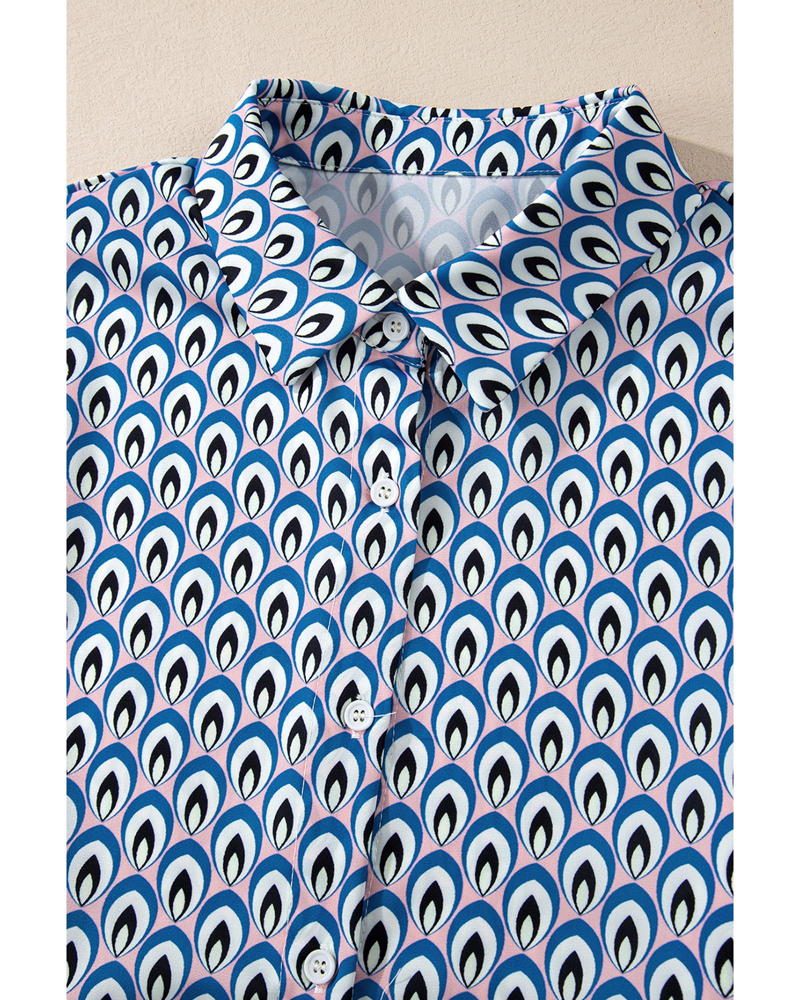 Sky Blue Abstract Print Shirred Cuff Buttoned Oversized Shirt – S
