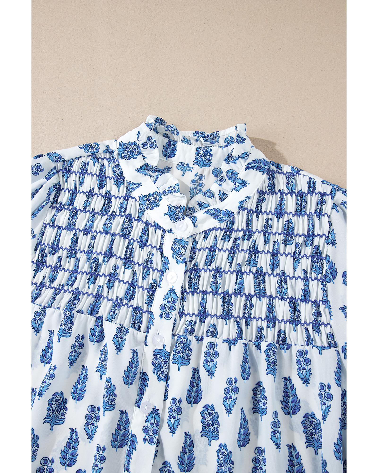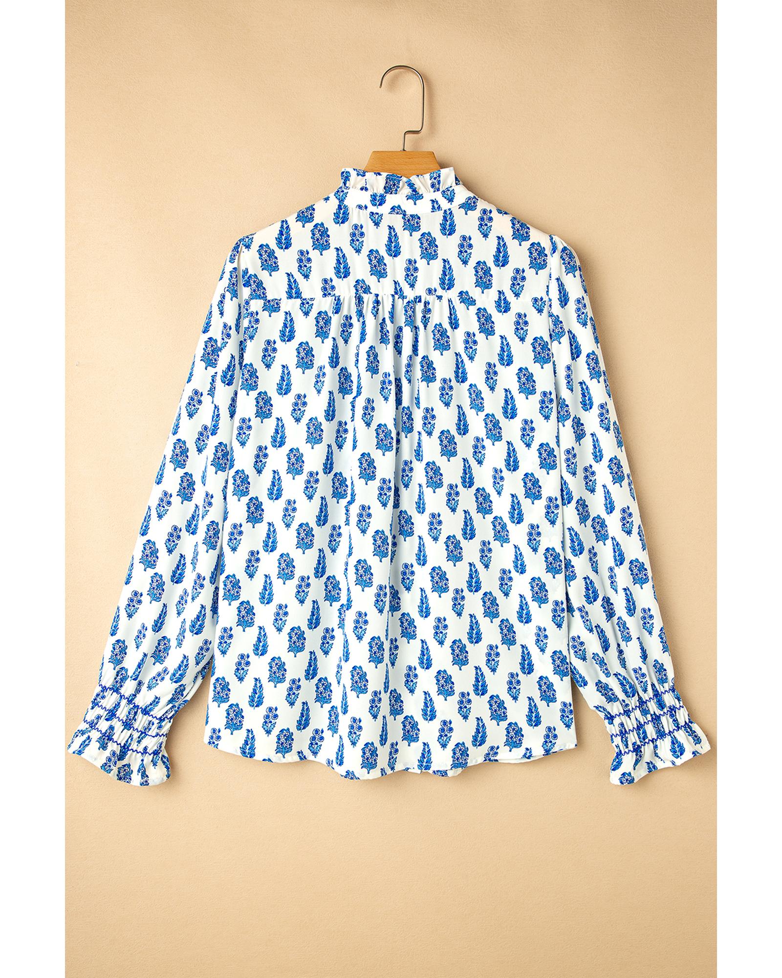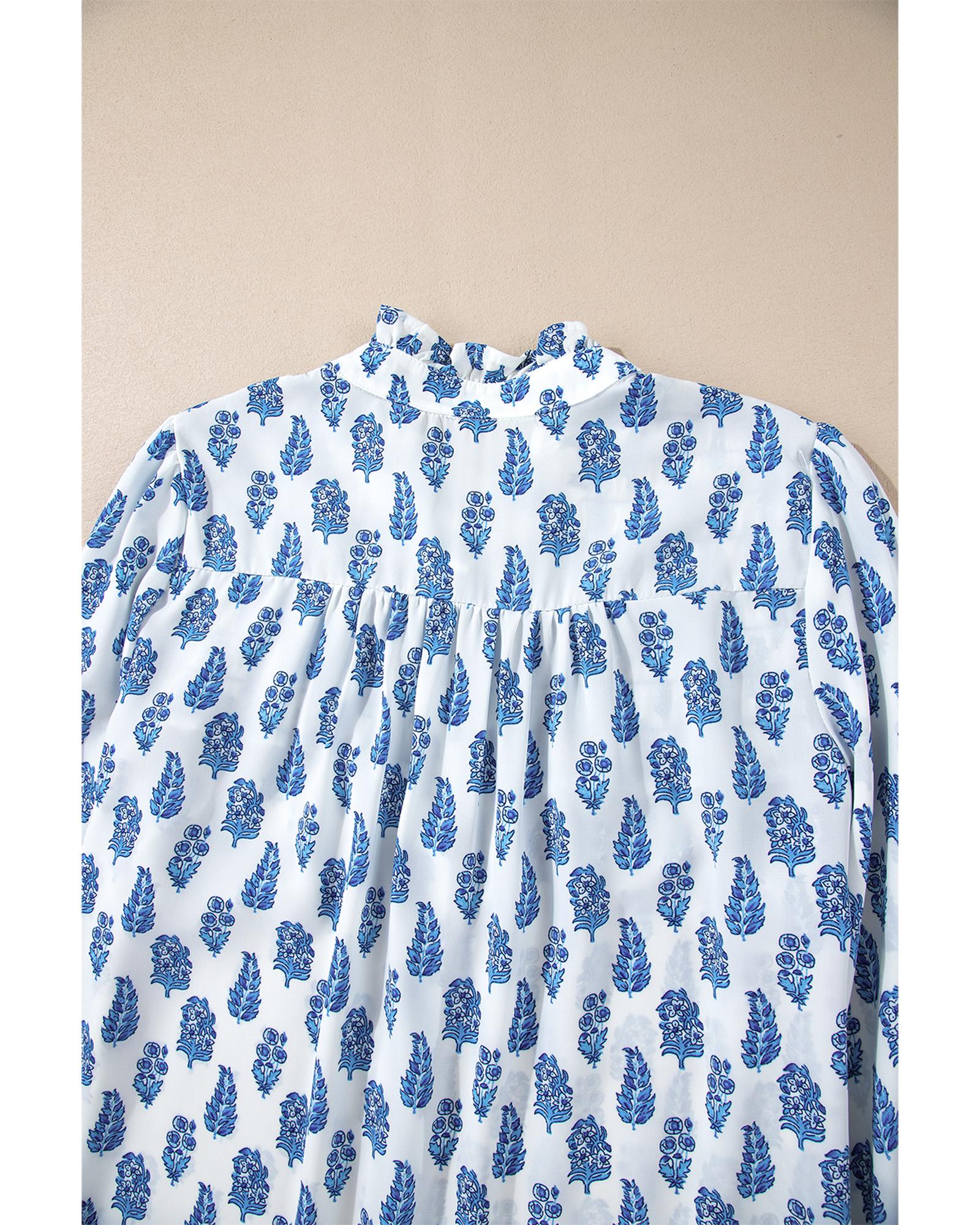 Sky Blue Boho Floral Printed Lantern Sleeve Frilled Neck Shirred Shirt – L