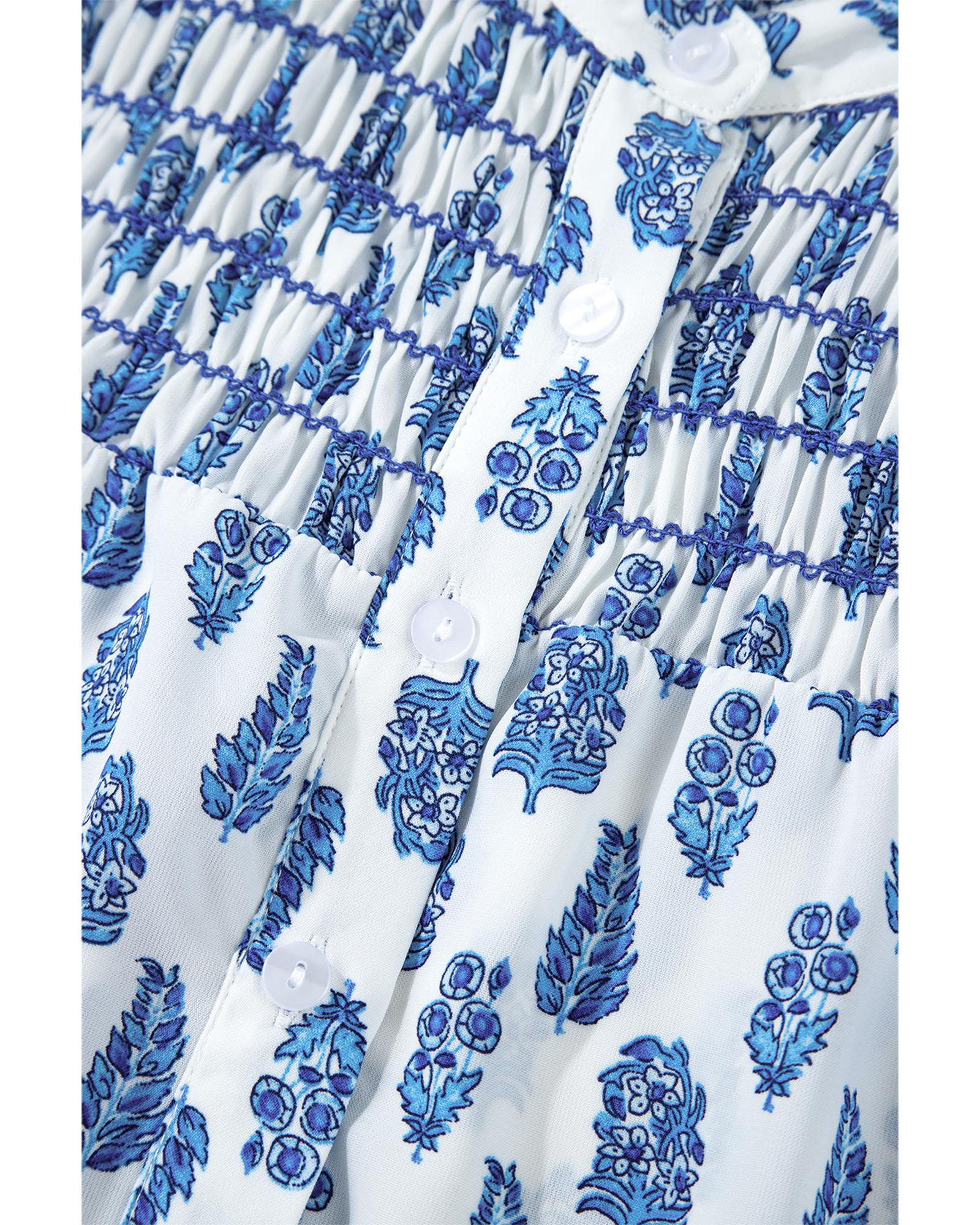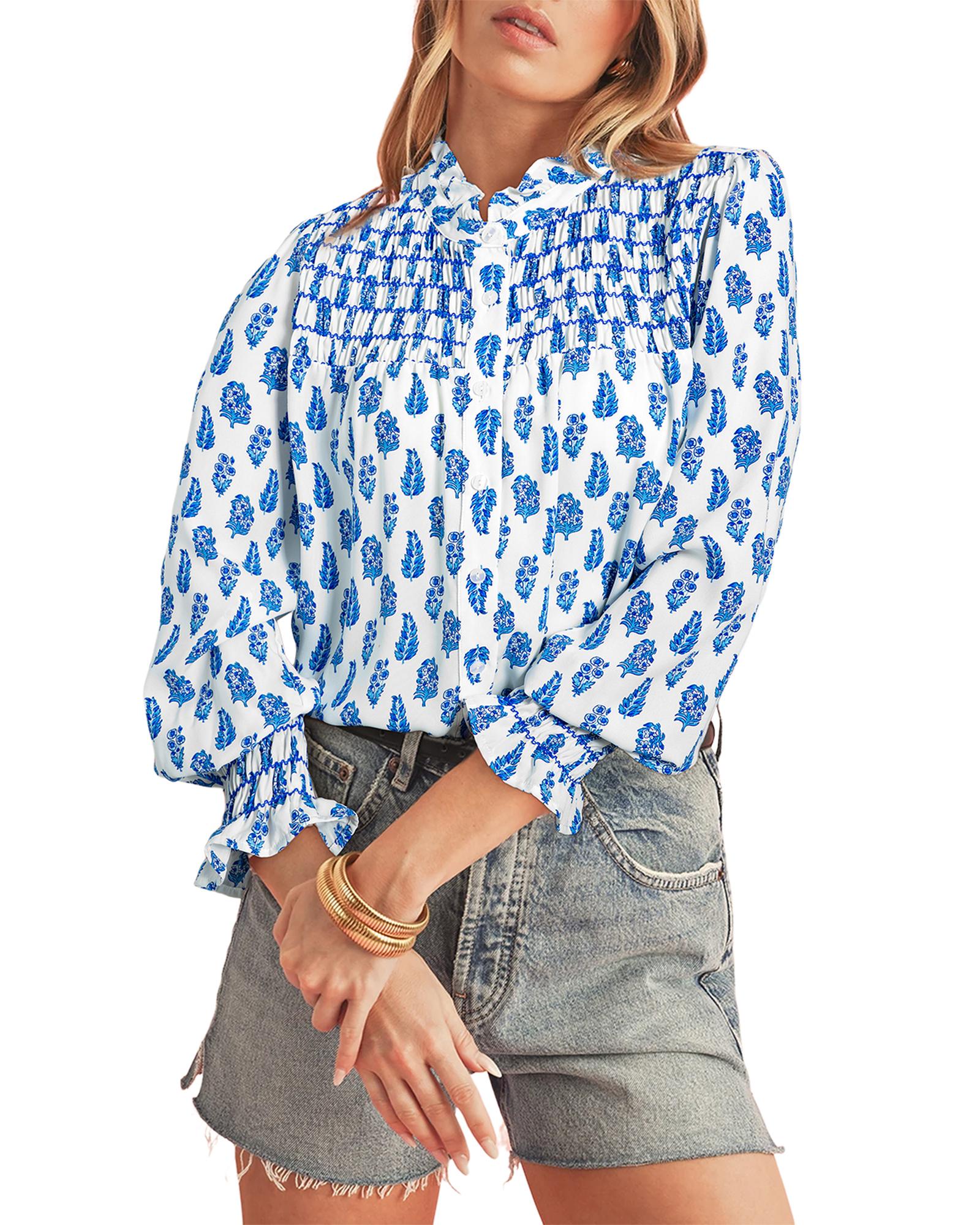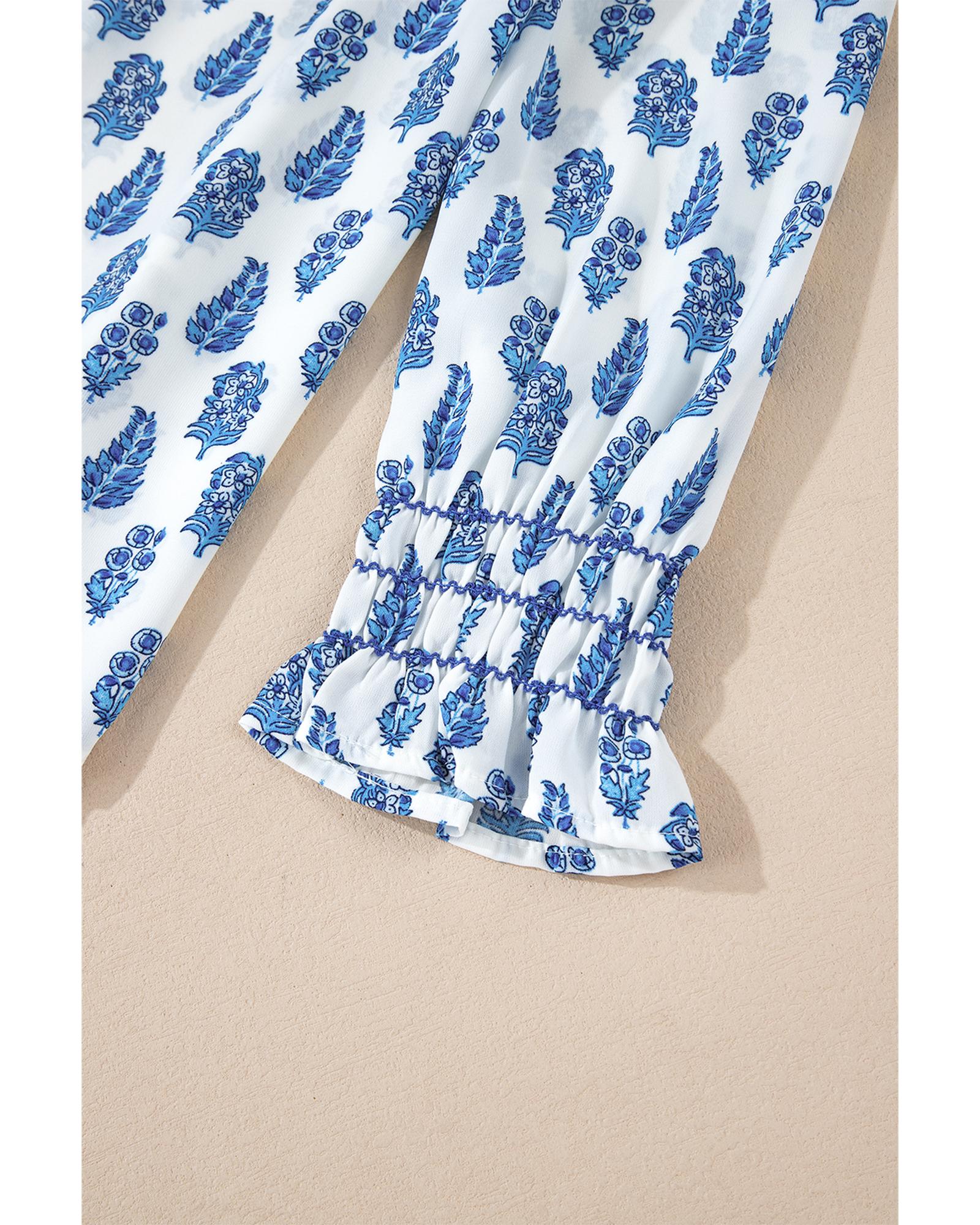 Sky Blue Boho Floral Printed Lantern Sleeve Frilled Neck Shirred Shirt – L