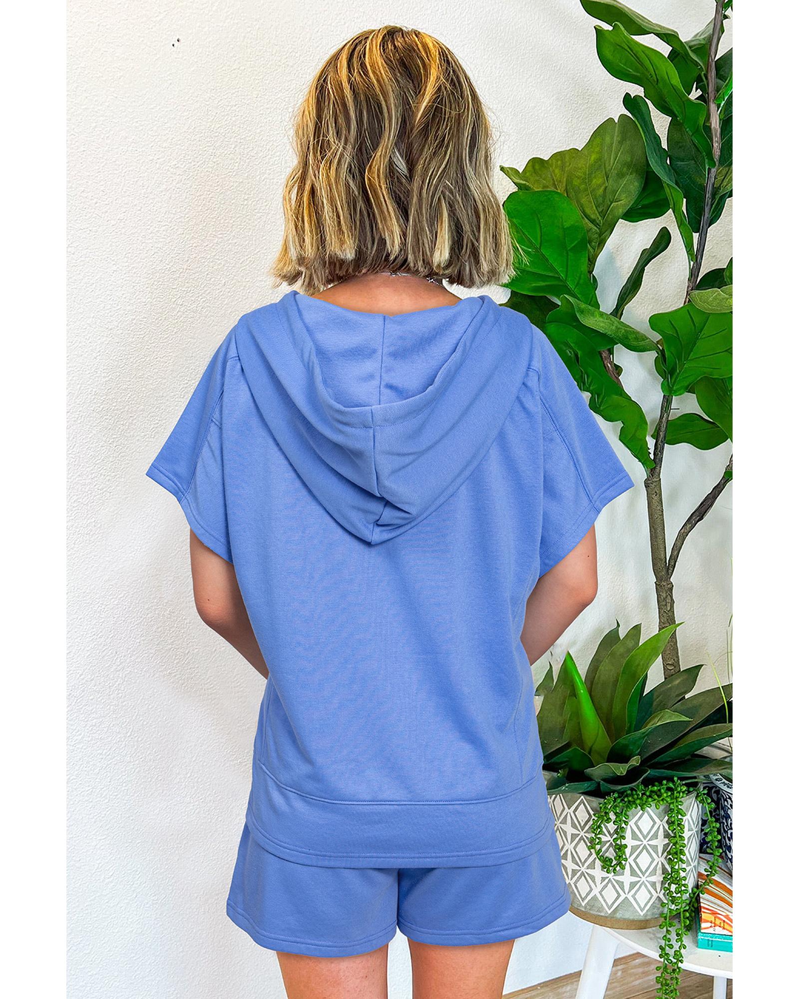 Sky Blue Casual Zipped Short Sleeve Hoodie and Shorts Set – M