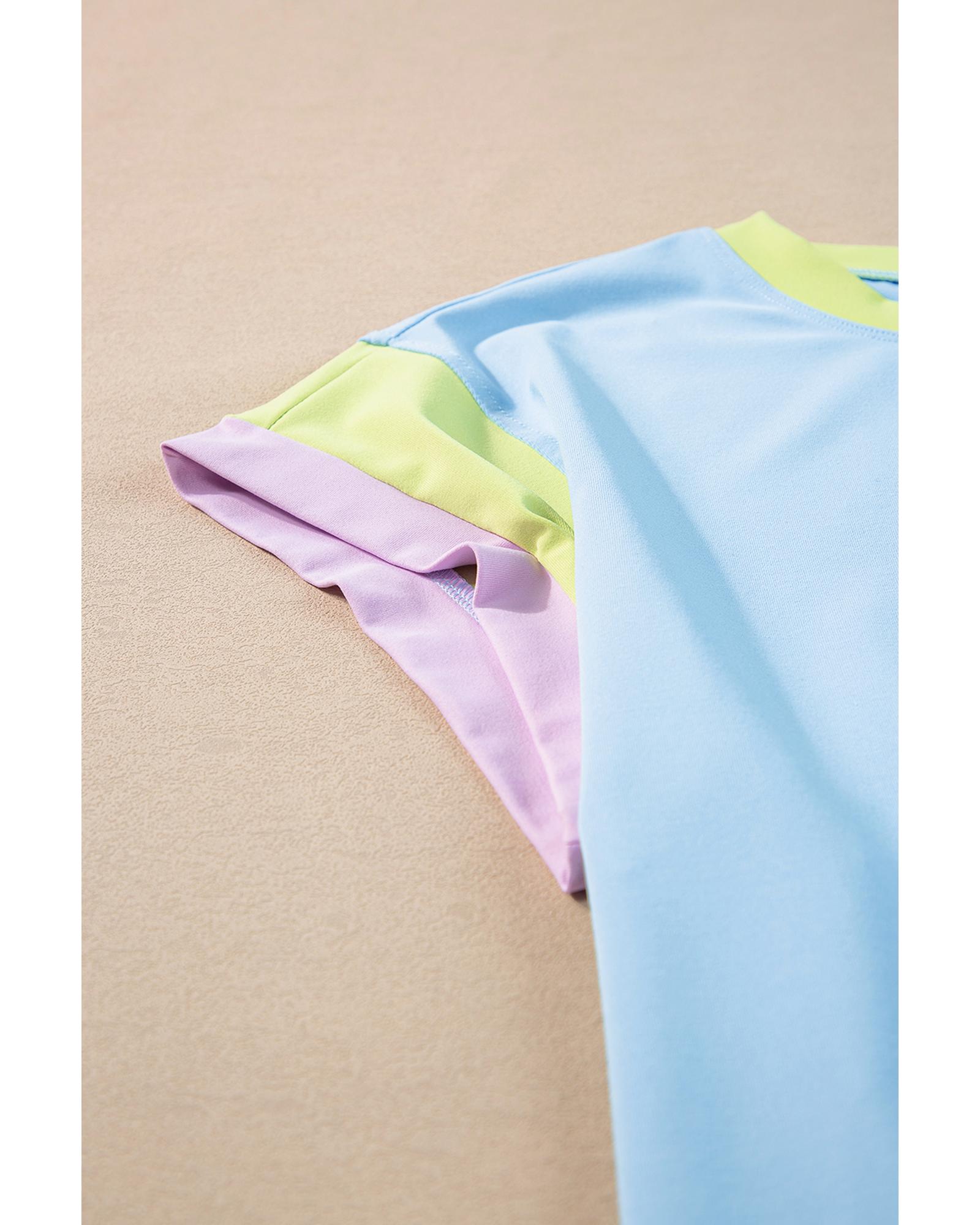 This casual two-piece outfit features a trendy sky blue color block design, perfect for warm weather. The set includes a crew neck cap sleeve tee and crop wide-leg pants, offering a loose fit that is adaptable to most body shapes. Made from a comfortable fabric blend, it combines style and comfort for everyday wear.