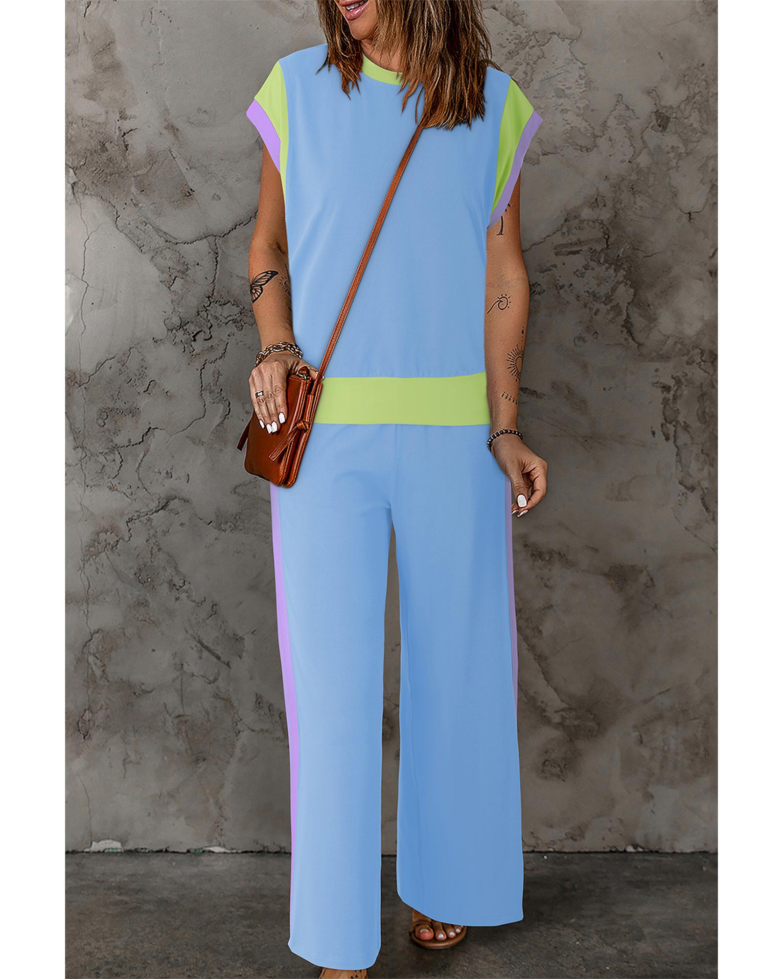 This sky blue color block casual two-piece outfit offers a trendy and comfortable look suitable for warm weather. Designed with a loose fit, it is adaptable to most body shapes and features eye-catching colorblock details for a stylish appearance. The outfit includes a crew neck cap sleeve tee and crop wide-leg pants, making it a versatile choice for casual occasions.