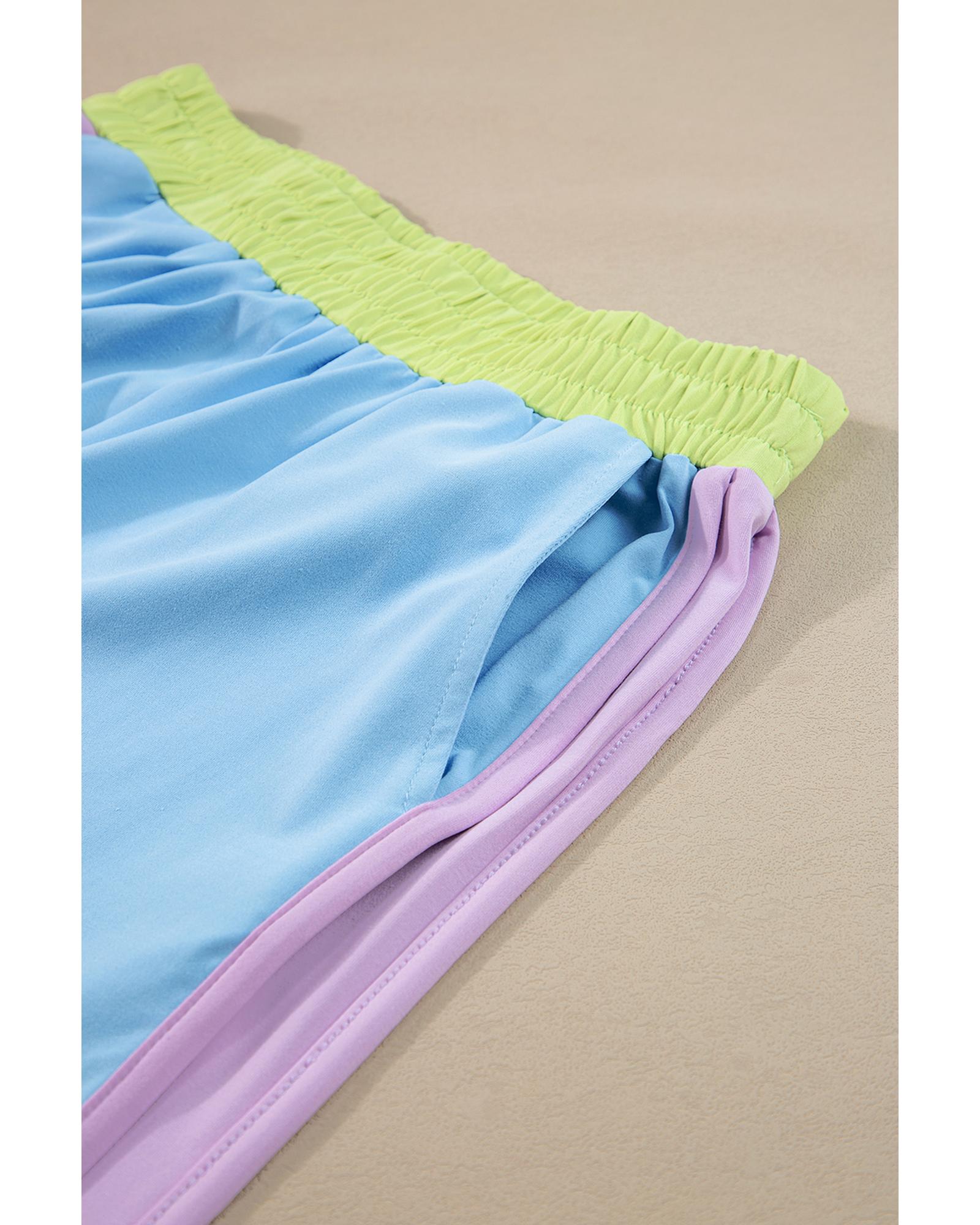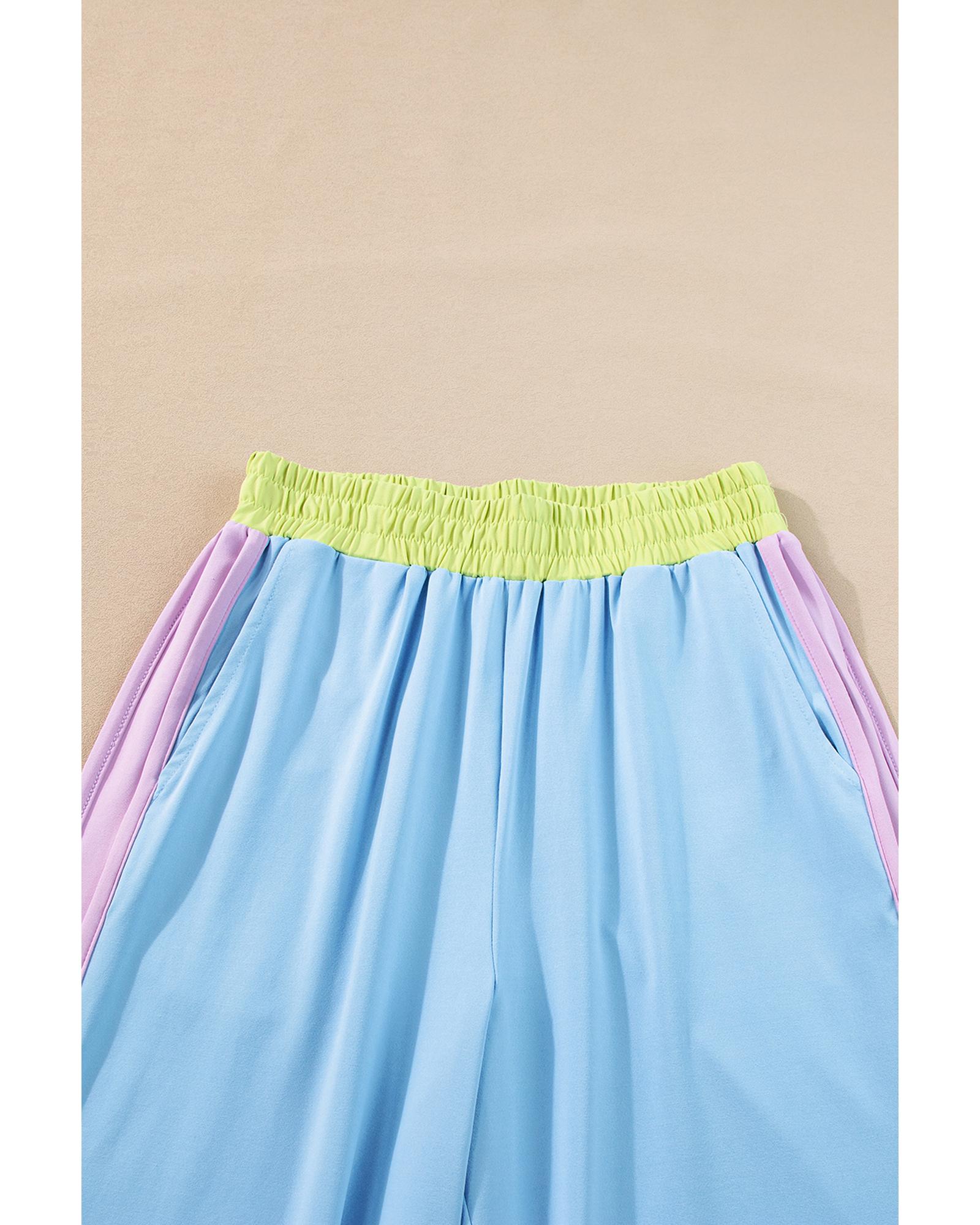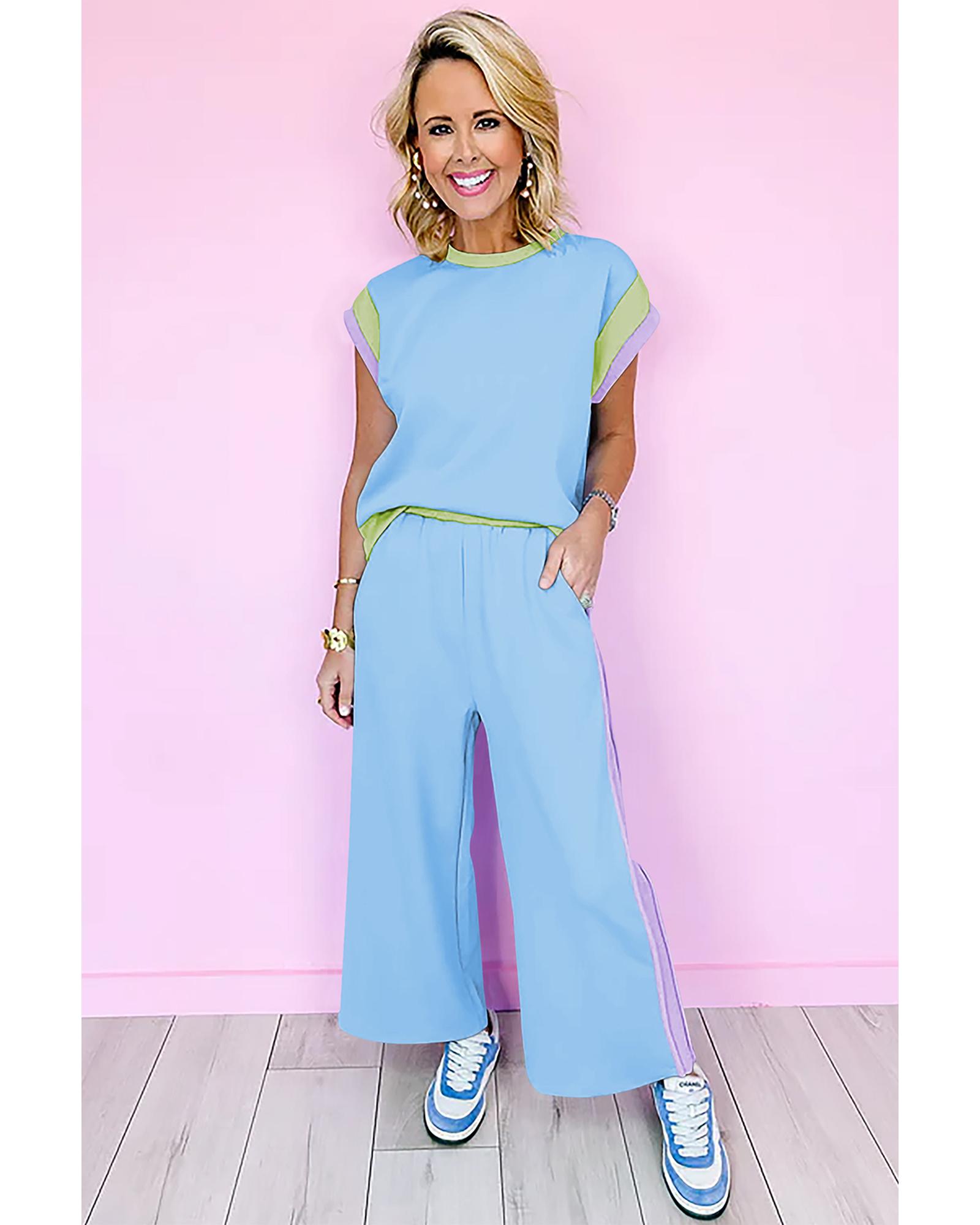 This sky blue color block casual two-piece outfit offers a trendy and comfortable look suitable for warm weather. Designed with a loose fit, it is adaptable to most body shapes and features eye-catching colorblock details for a stylish appearance. The set includes a crew neck cap sleeve tee and crop wide-leg pants, making it a versatile choice for casual occasions.