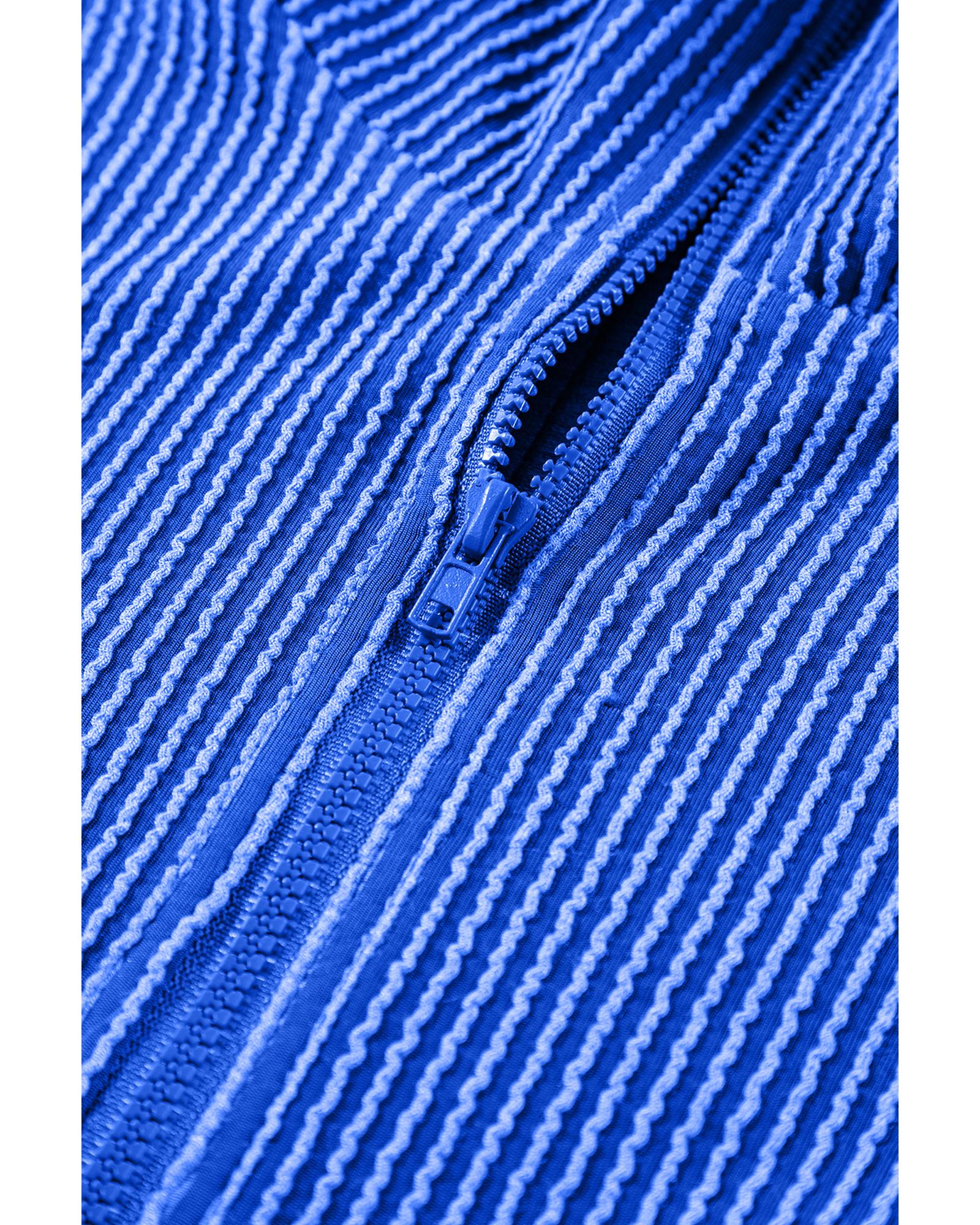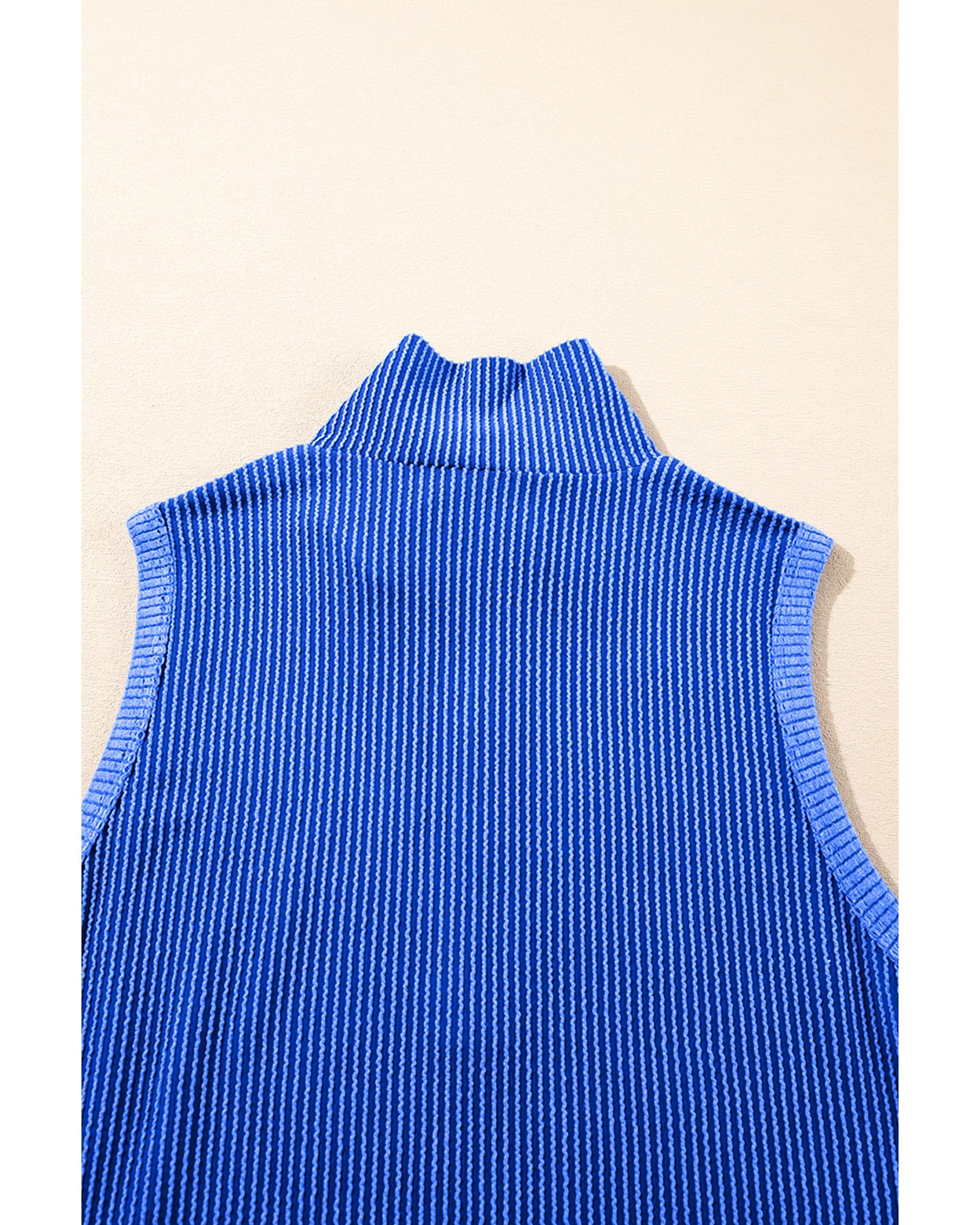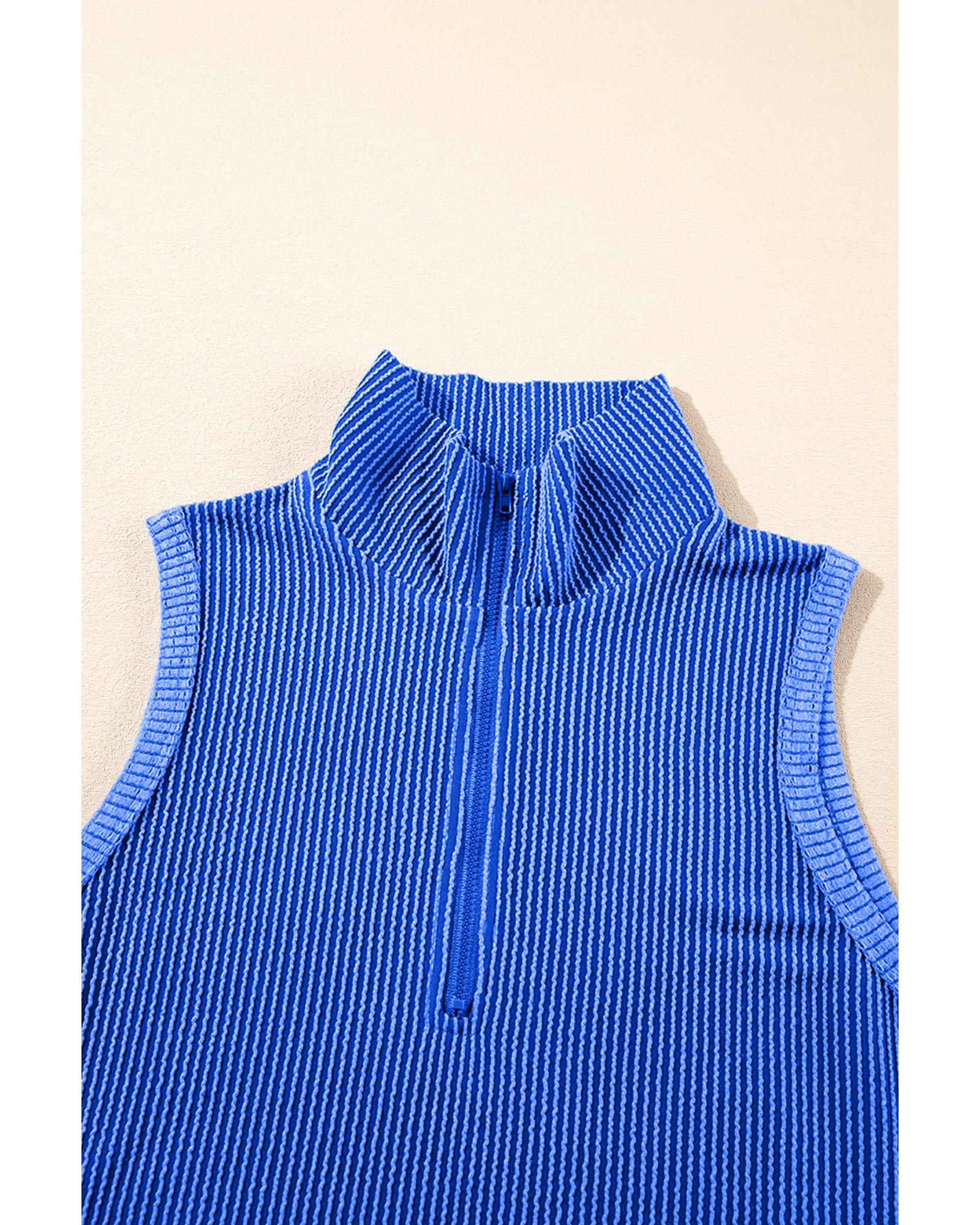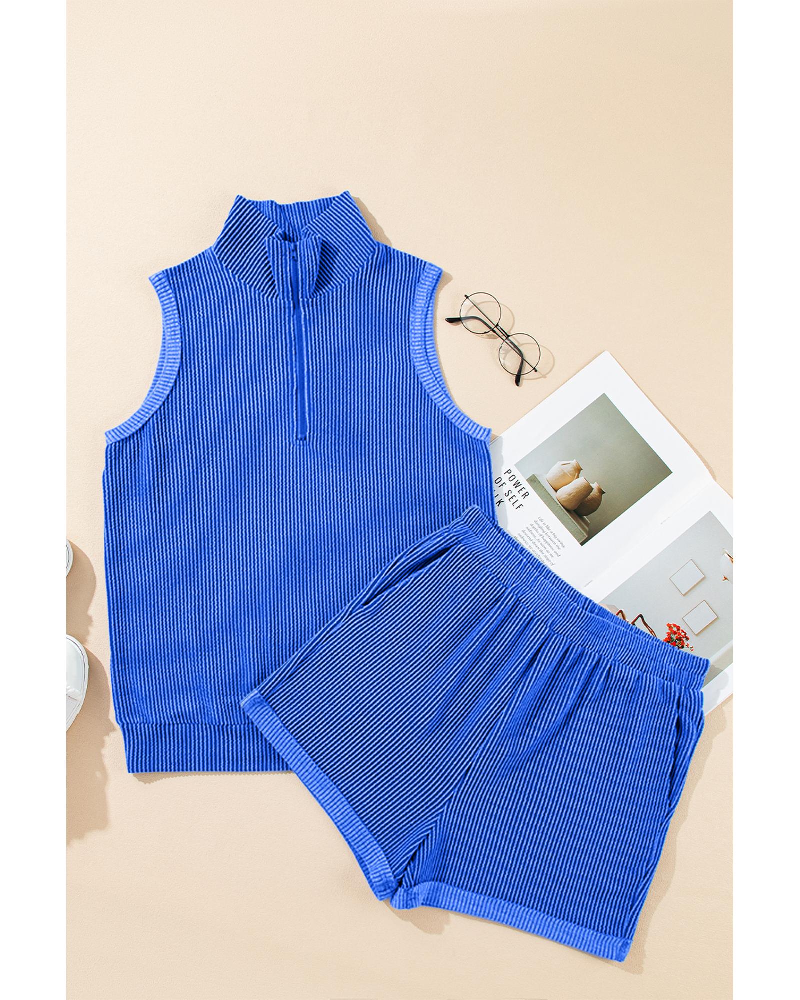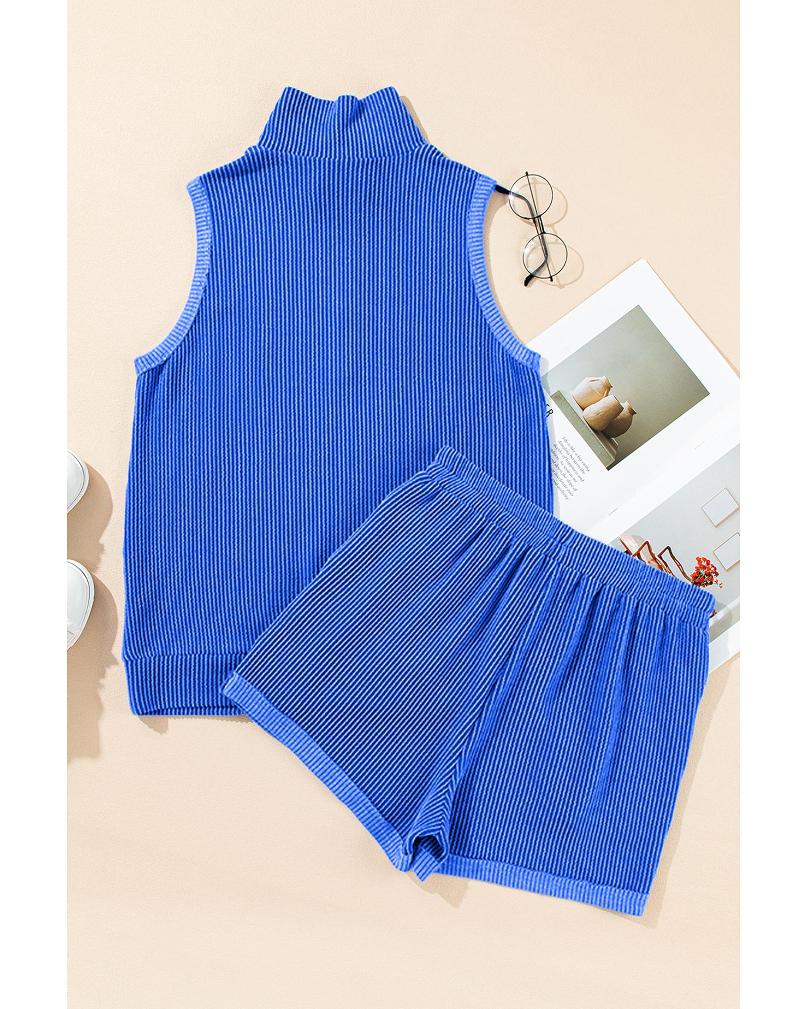 This stylish two-piece set features a corded textured fabric in a vibrant sky blue color. The outfit includes a collared tank top with a half-zip high collar and matching shorts with pockets, offering a comfortable and fashionable look suitable for various casual occasions.
