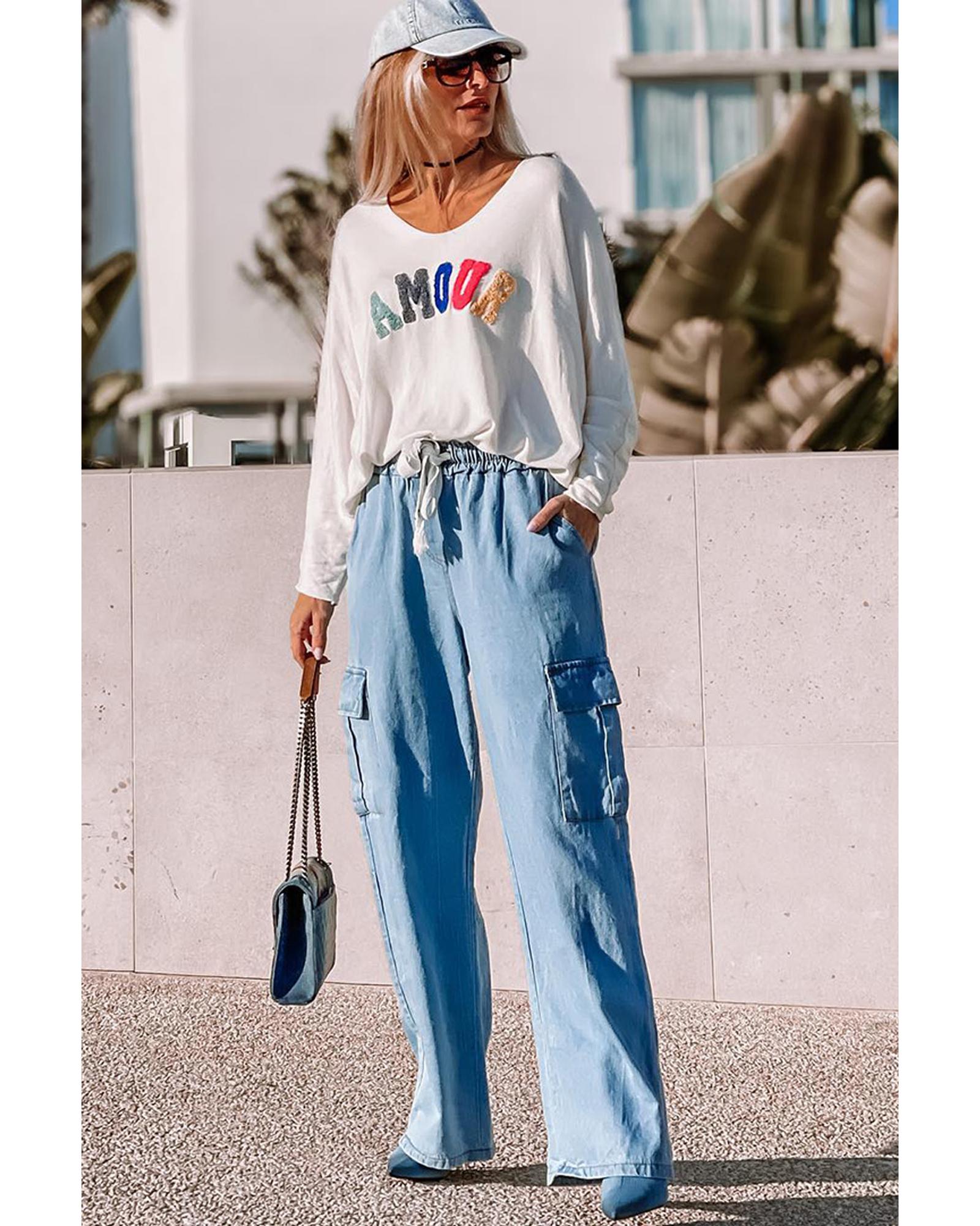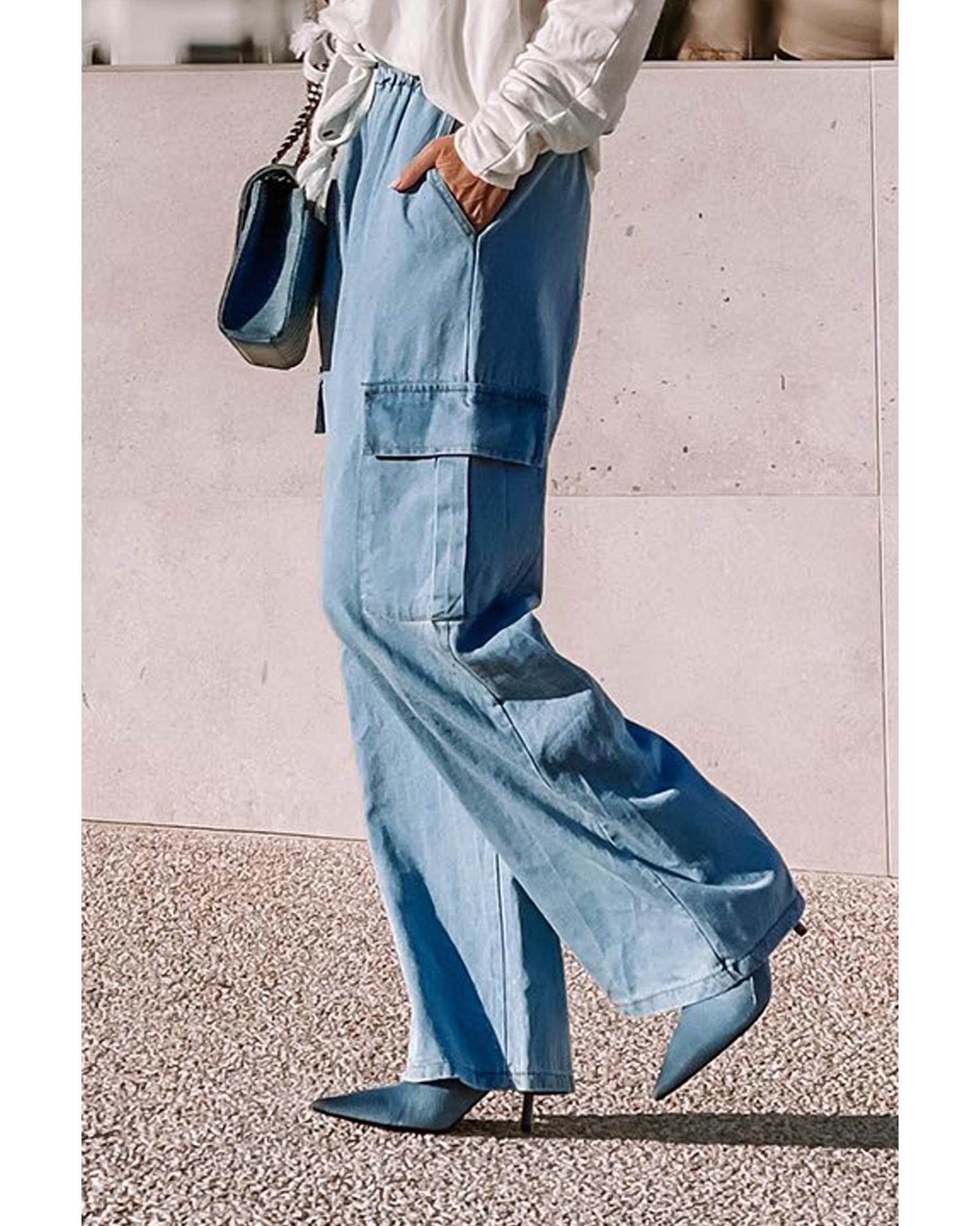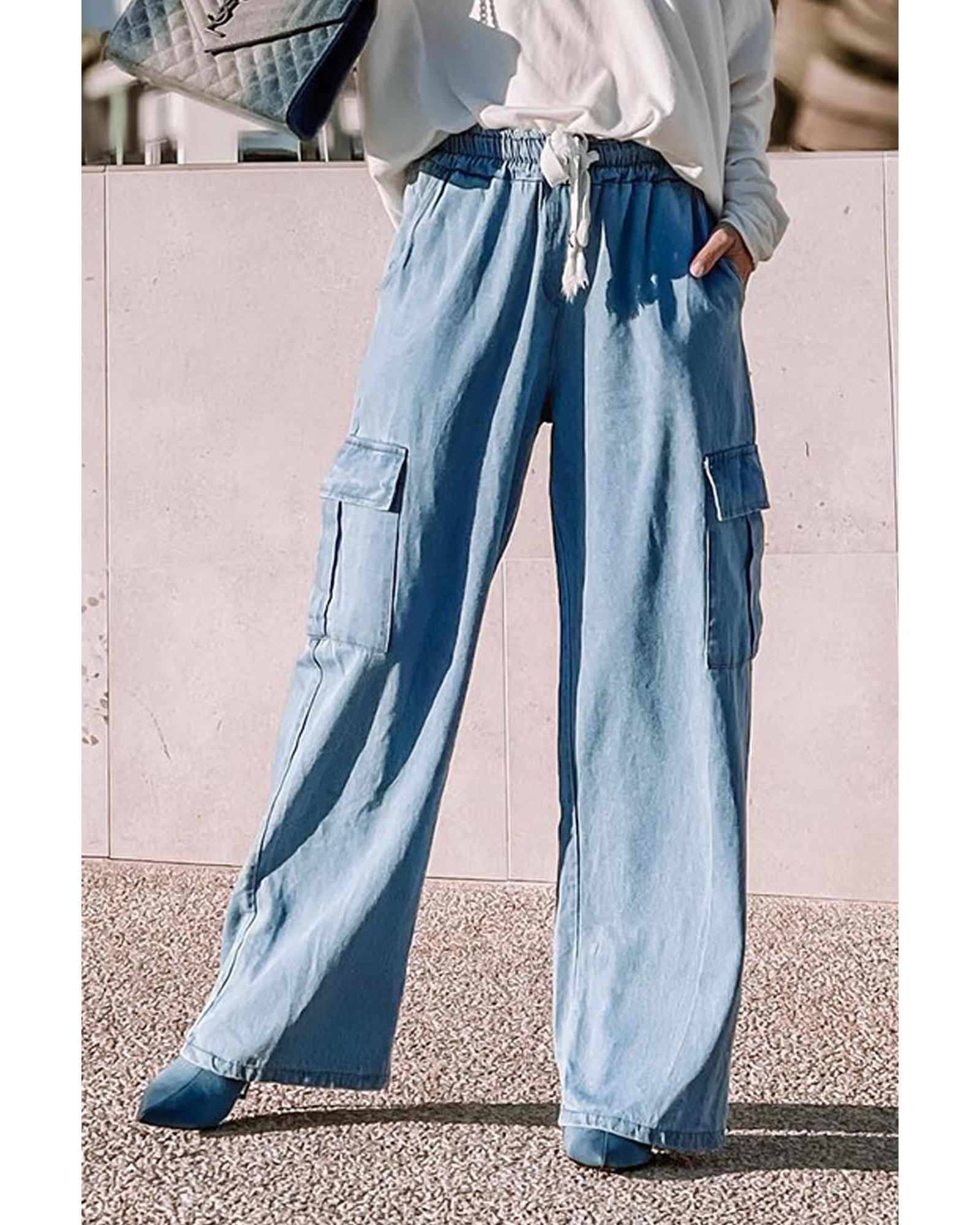 Package Content: One pair of sky blue drawstring high waist cargo pocket wide leg jeans.