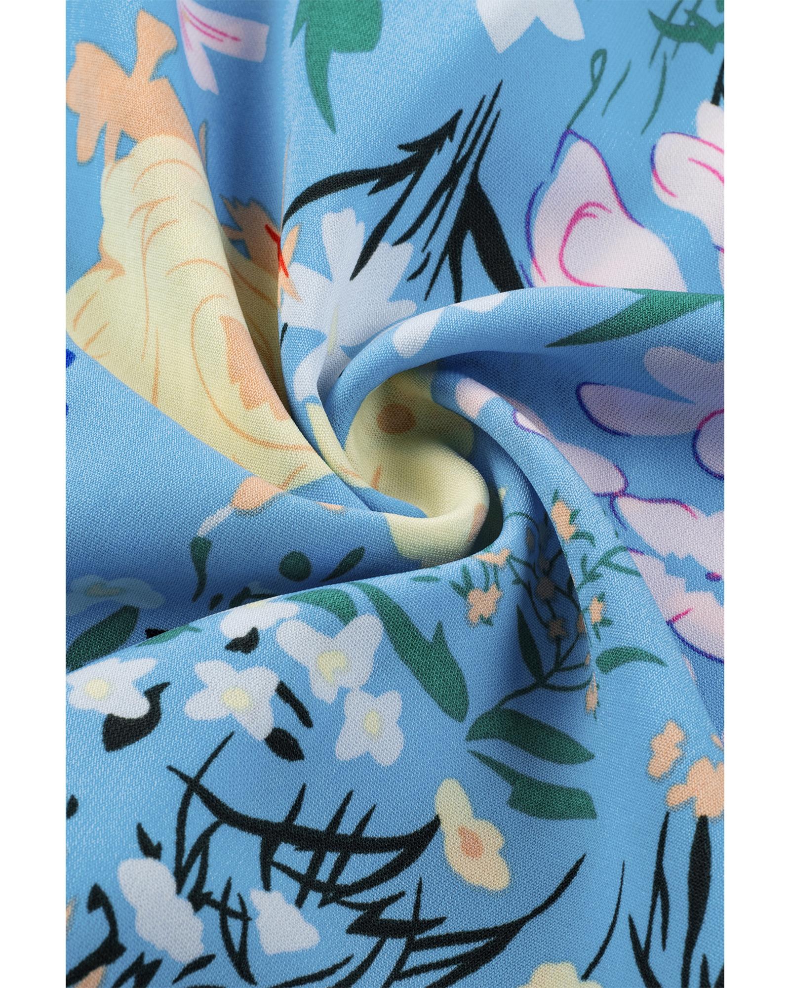 This sky blue floral dress features a trendy fitted design with a flutter sleeve and V neckline. It is crafted from soft, breathable fabric and includes ruffled details for a stylish look. The dress is suitable for various body types and offers a comfortable fit for different occasions.