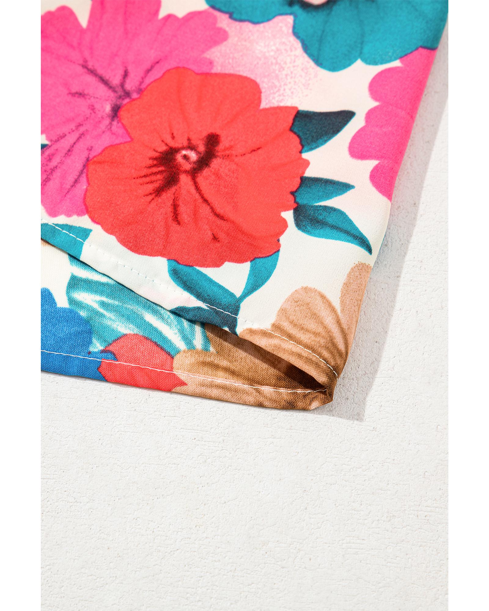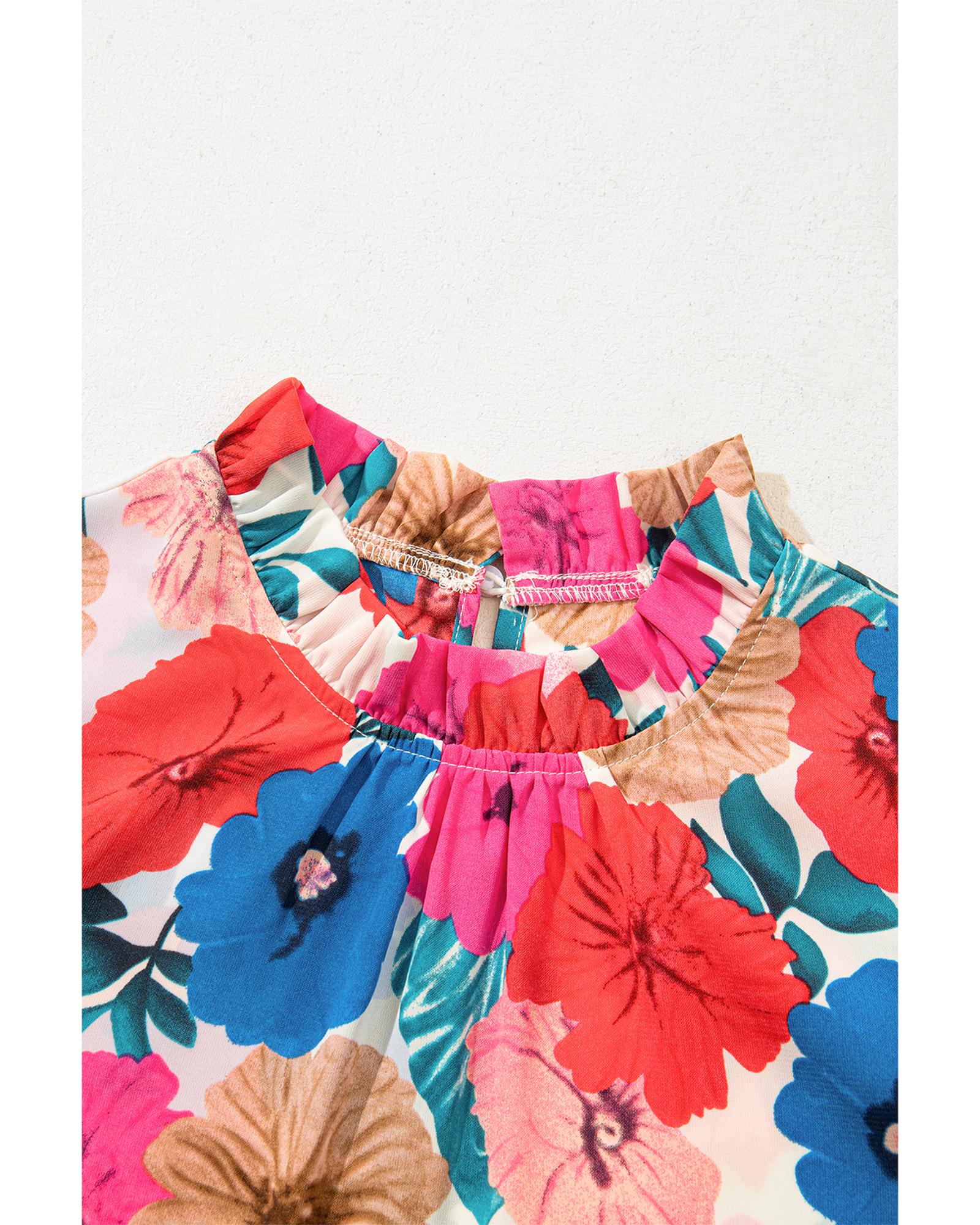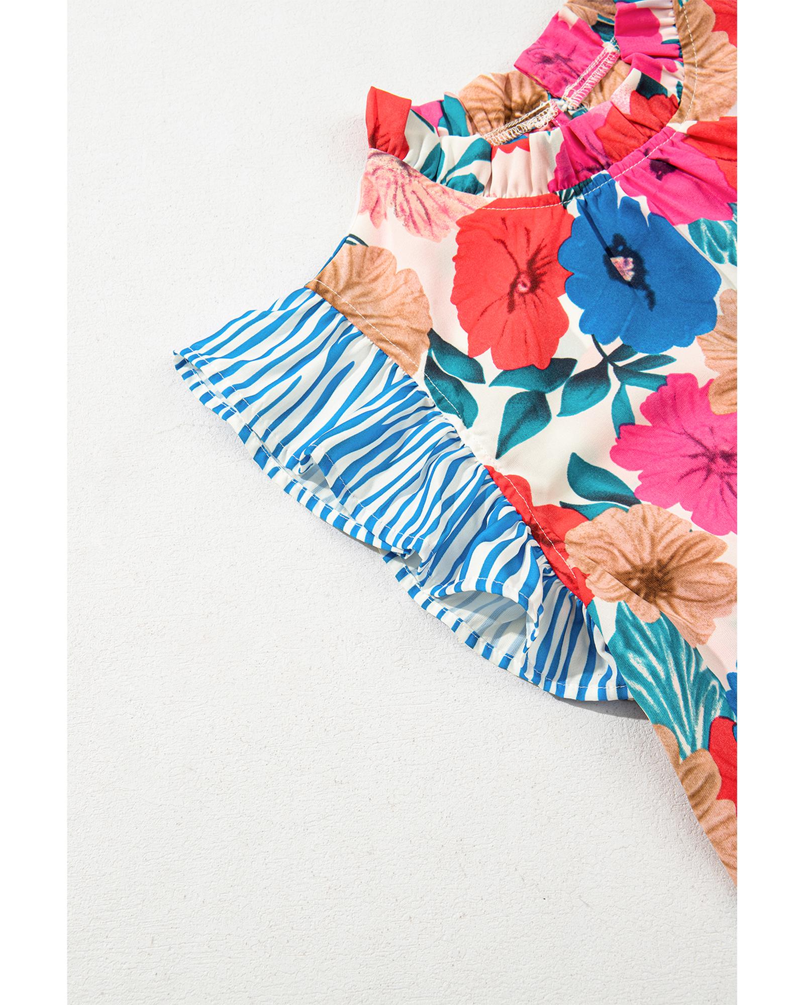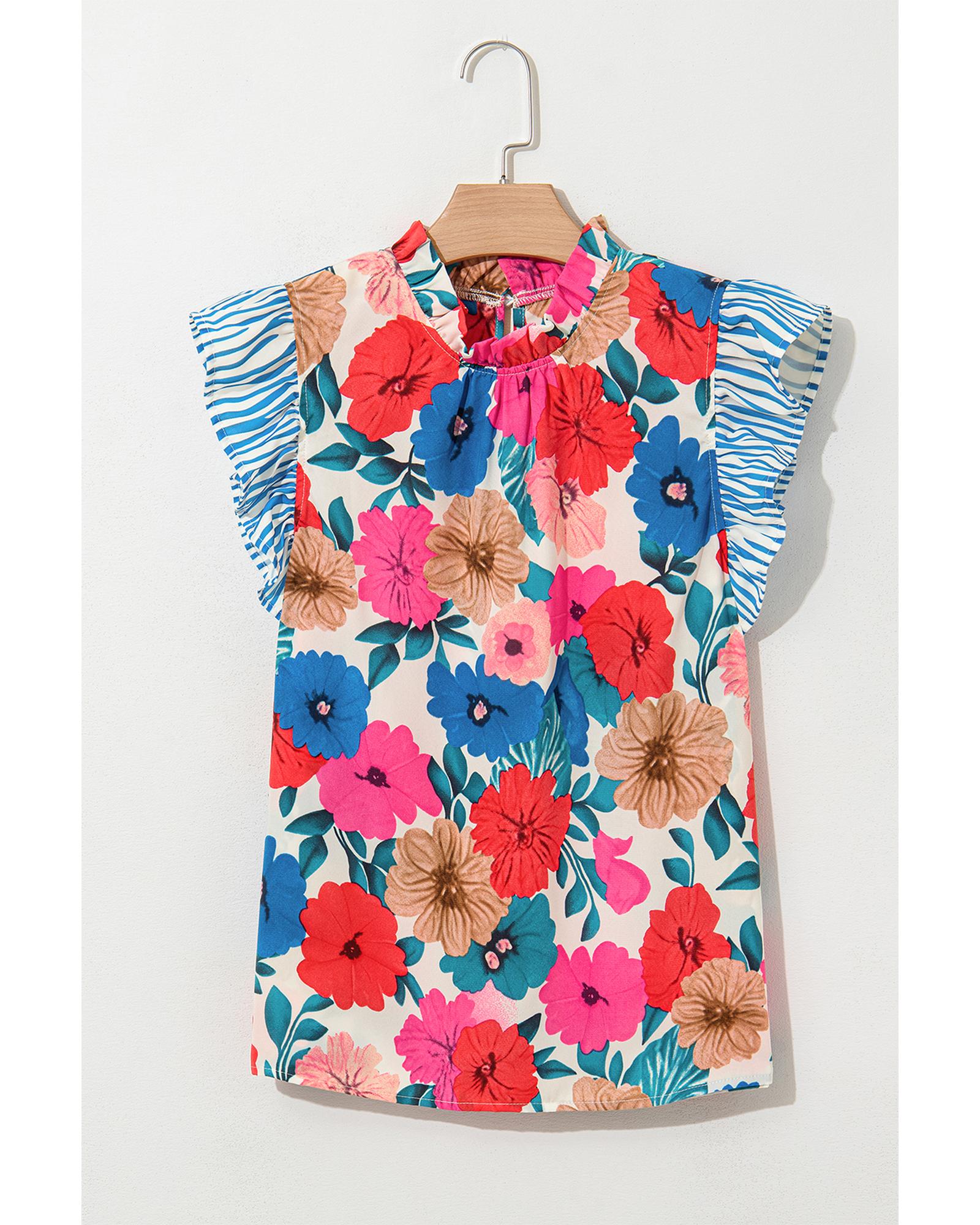 This sky blue floral blouse features a mock neck design and contrast striped flutter sleeves, creating a feminine and charming silhouette. It is suitable for both office and casual occasions and pairs well with tailored pants or jeans.