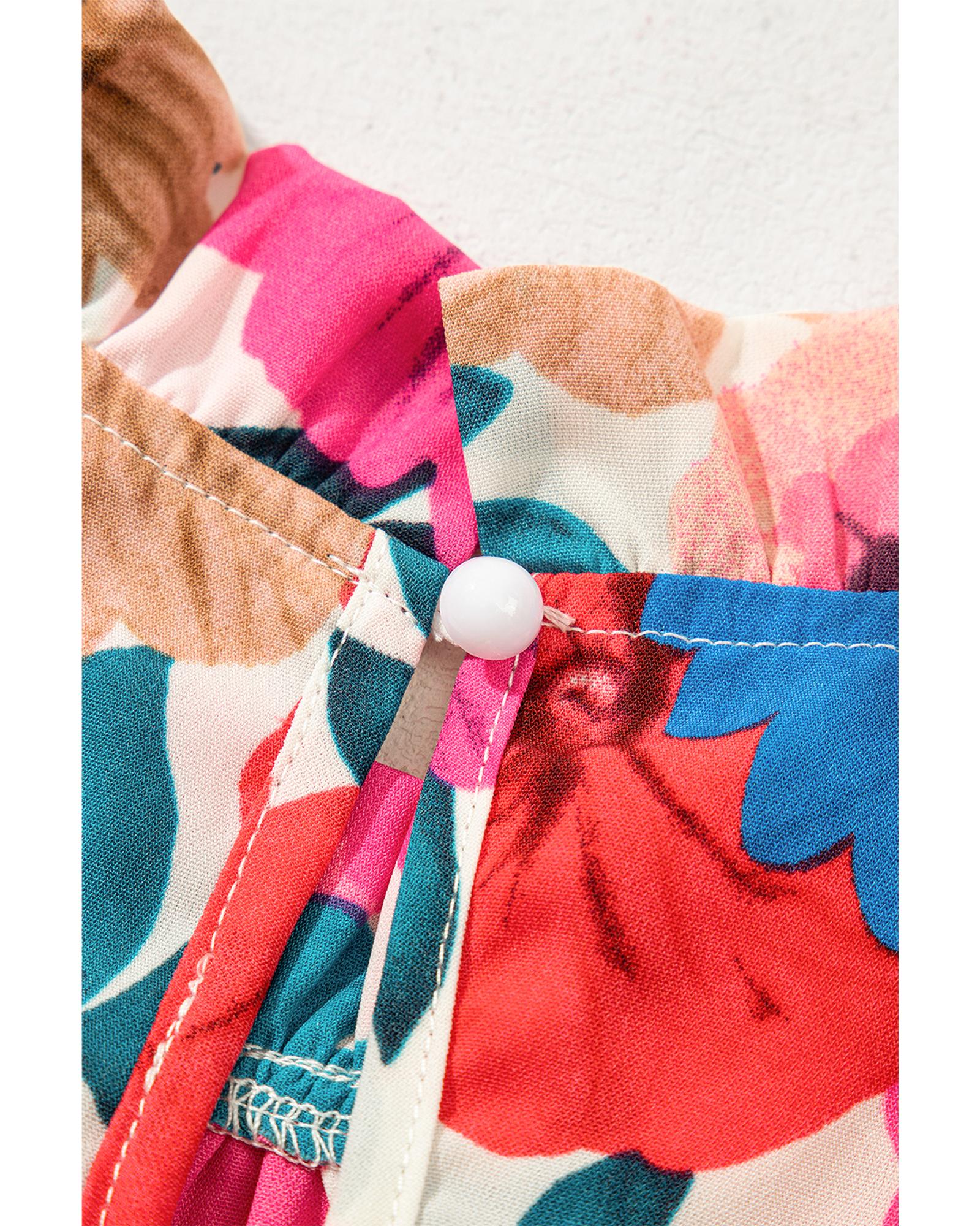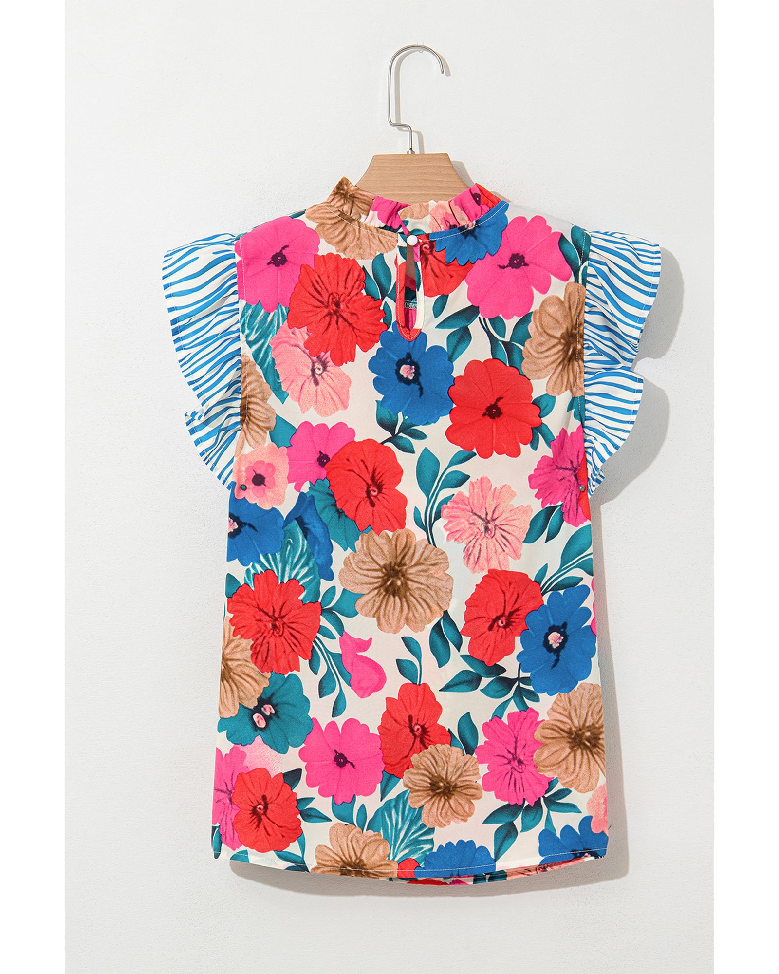 This sky blue floral blouse features a stylish mock neck and contrast striped flutter sleeves, creating a feminine and charming silhouette. It is suitable for both office and casual occasions, pairing well with tailored pants or jeans.