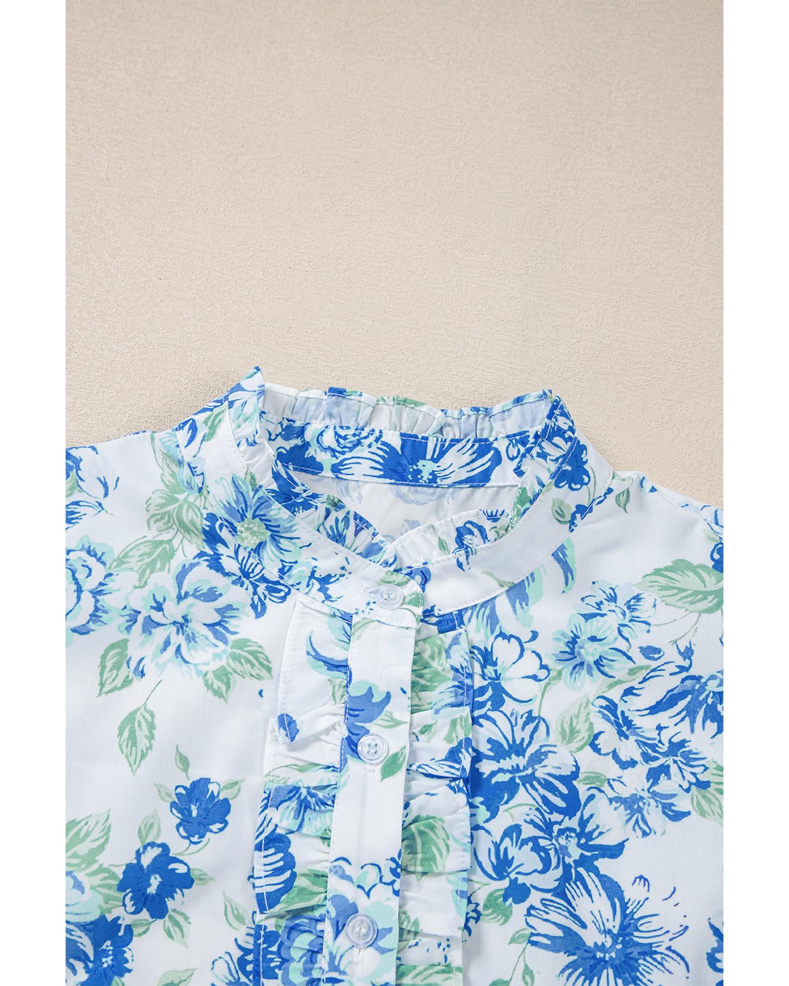 This stylish frilly button-up shirt features a charming sky blue floral print and elegant ruffle sleeves, making it a versatile addition to any wardrobe. Designed with a trendy fitted silhouette, it offers a fashionable look suitable for various occasions. The shirt includes classic front button closure and a frilled neck detail for added flair.