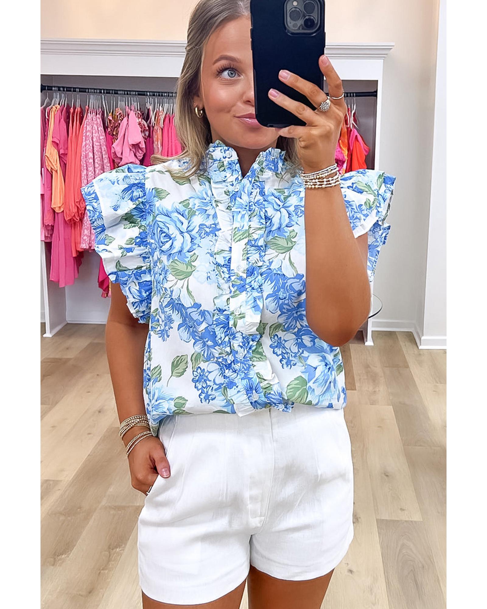 This stylish frilly button-up shirt features a charming sky blue floral print and elegant ruffle sleeves, making it a versatile addition to your wardrobe. Designed with a trendy fitted silhouette, it offers a fashionable look suitable for various occasions. The shirt includes classic front button closure and a frilled neck detail for added flair.