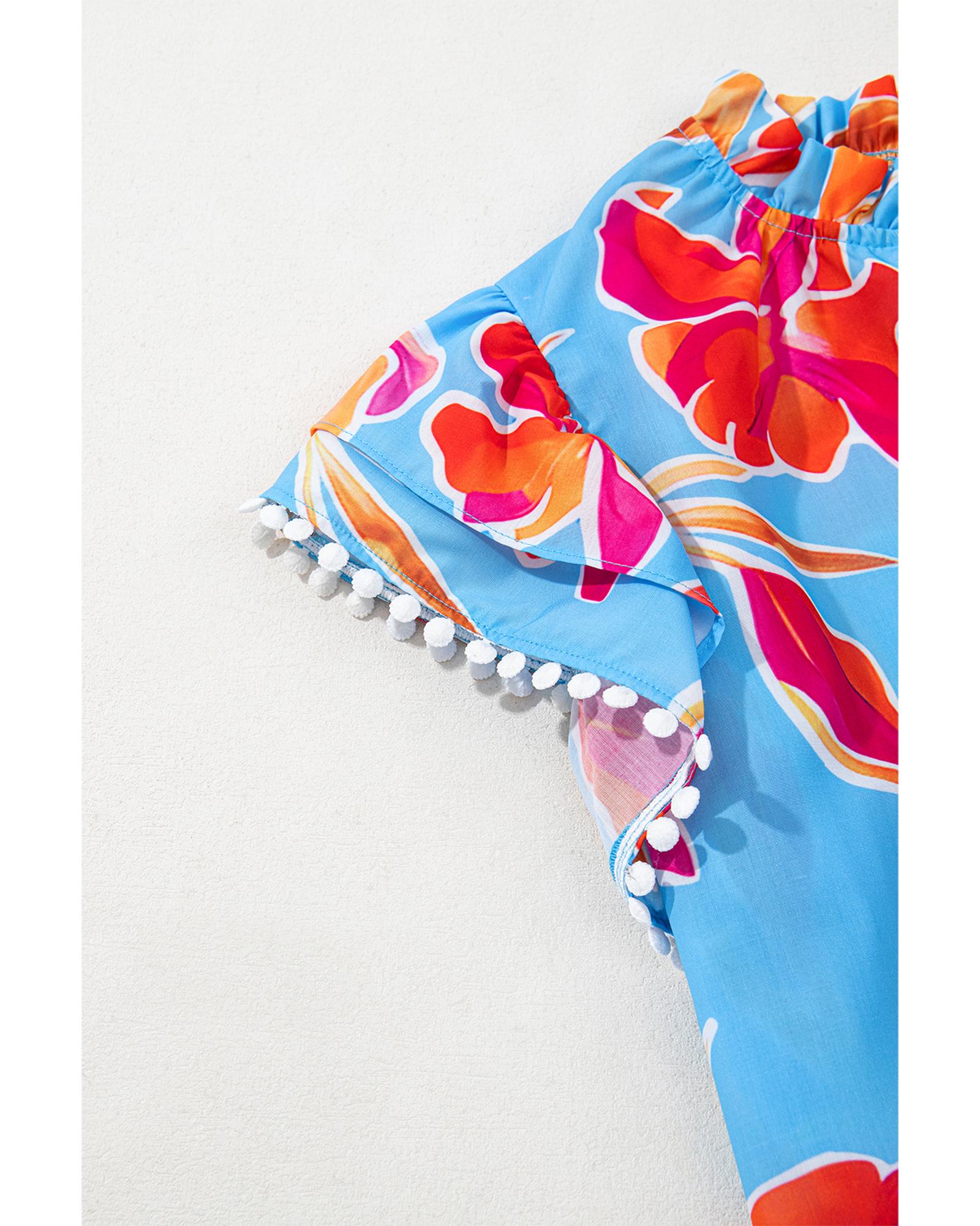 Sky Blue Floral Print V Neck Pompom Trim Flutter Sleeve Blouse – L