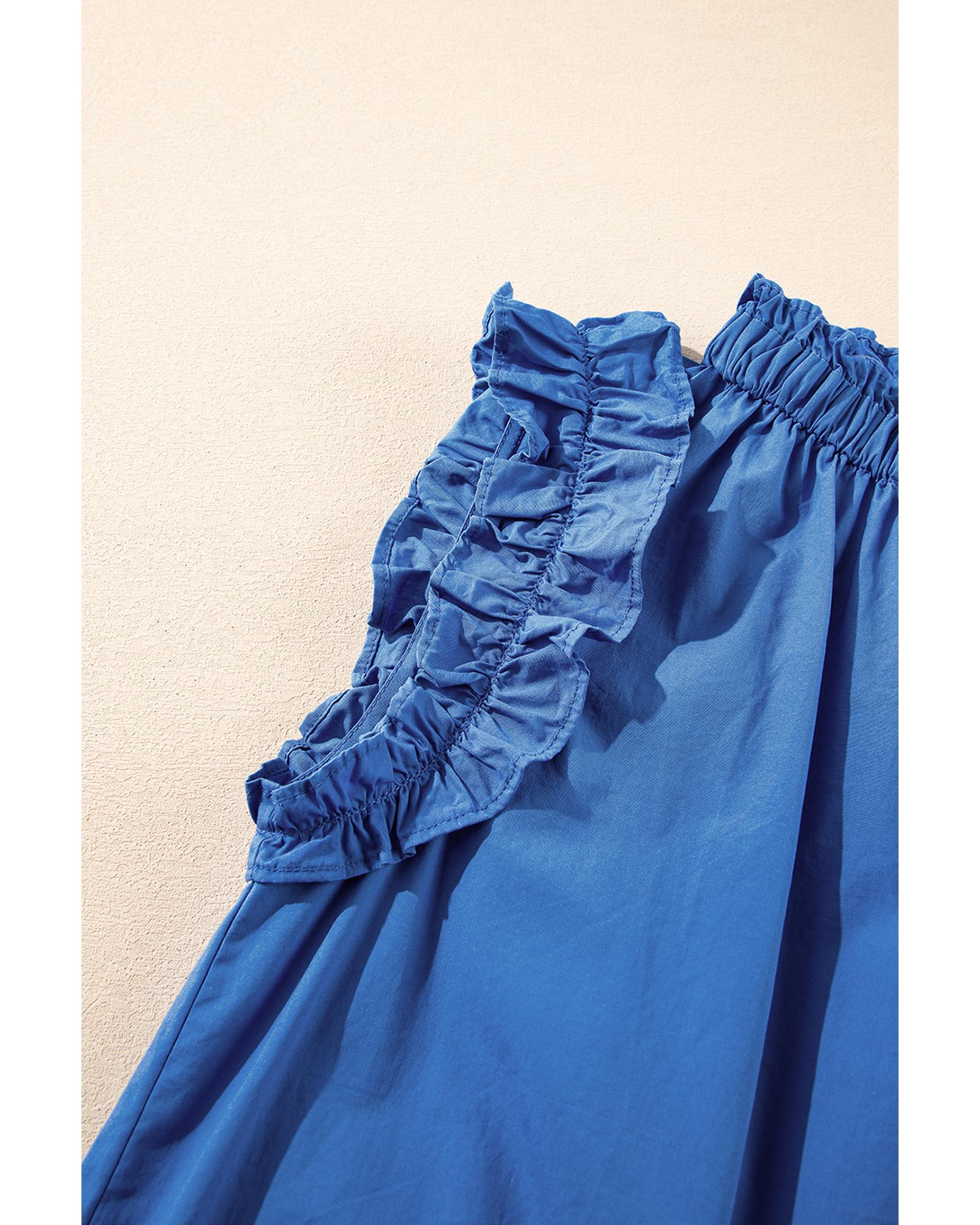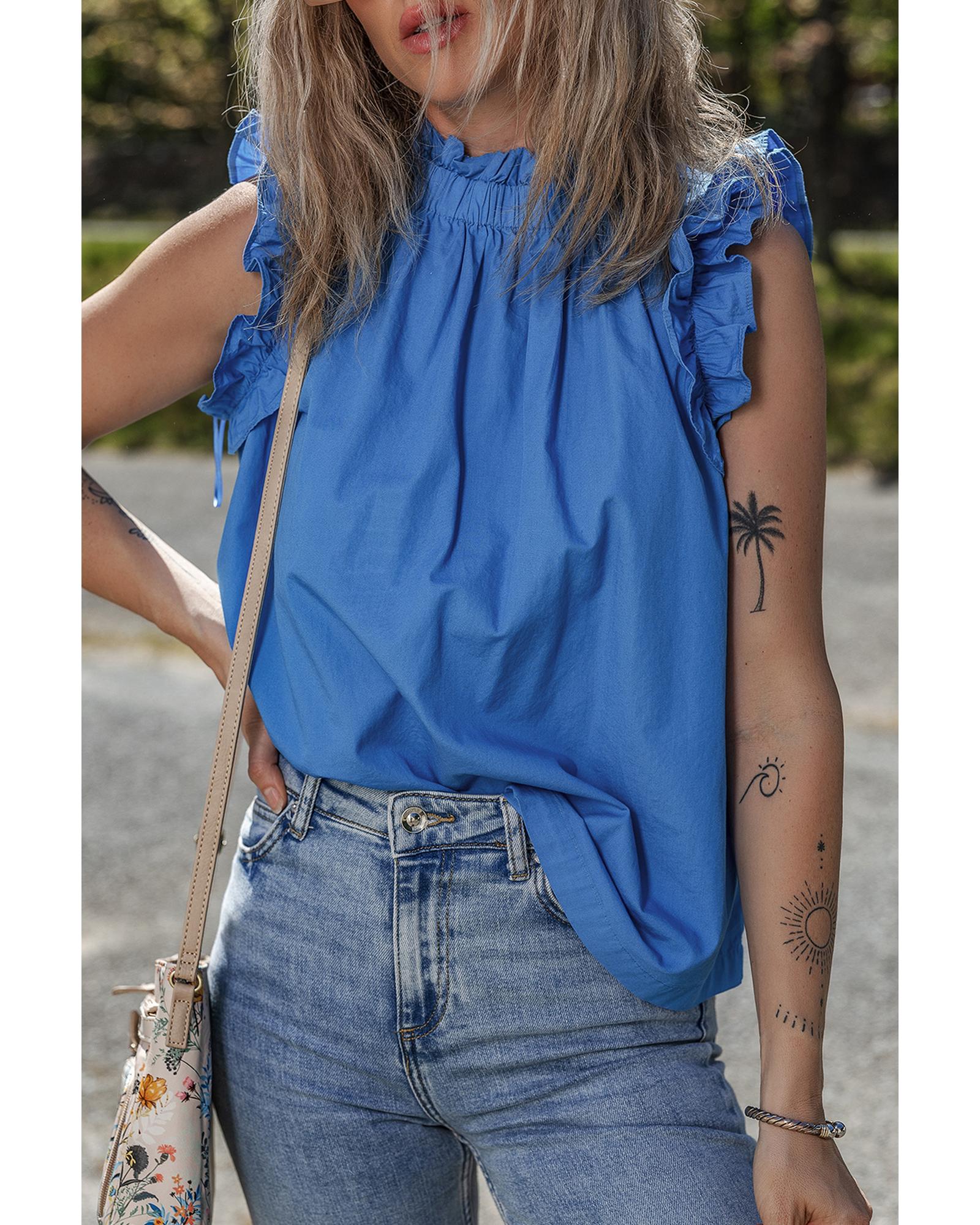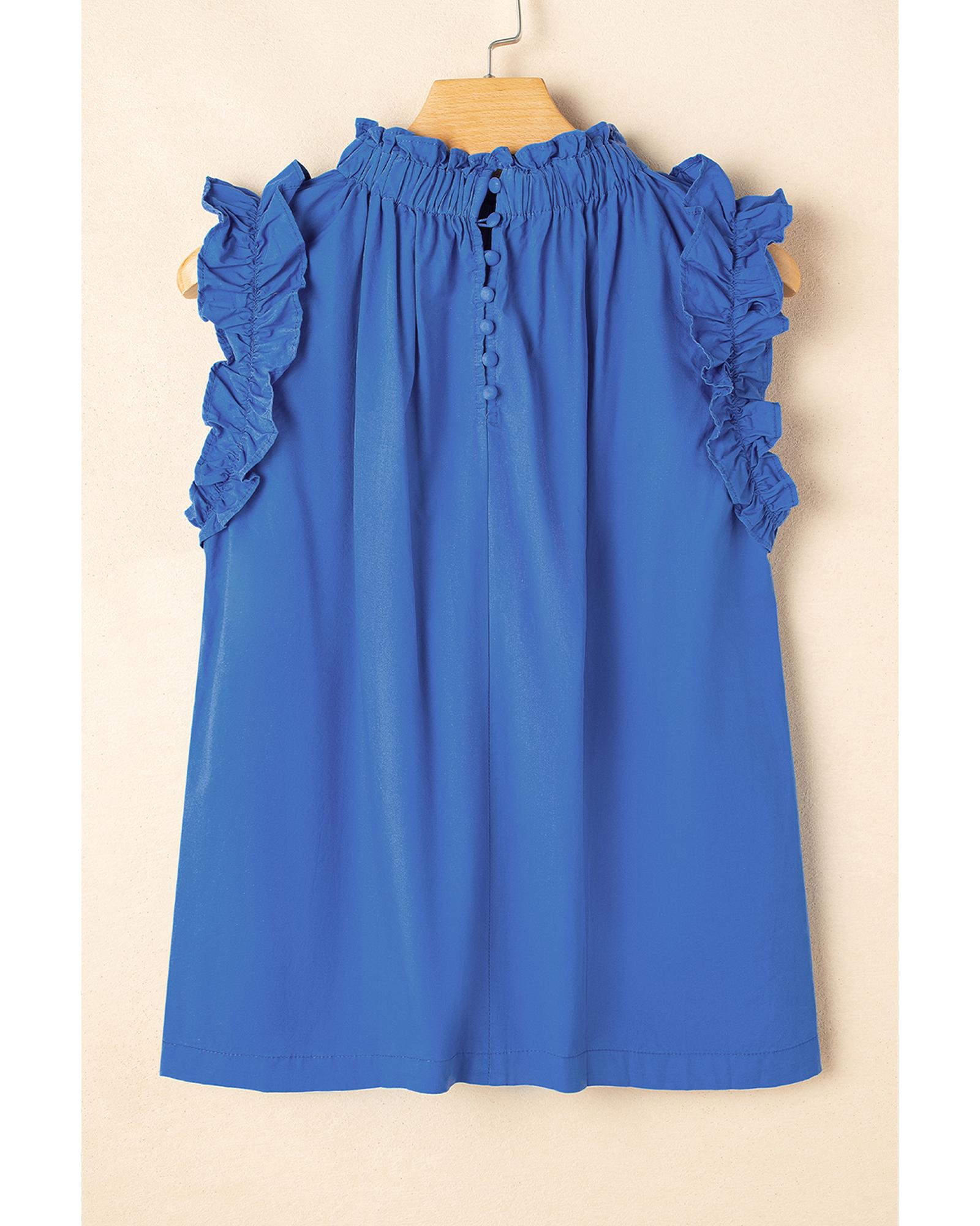 Sky Blue Frilled Neck Ruffled Armholes Buttoned Back Tank Top – L