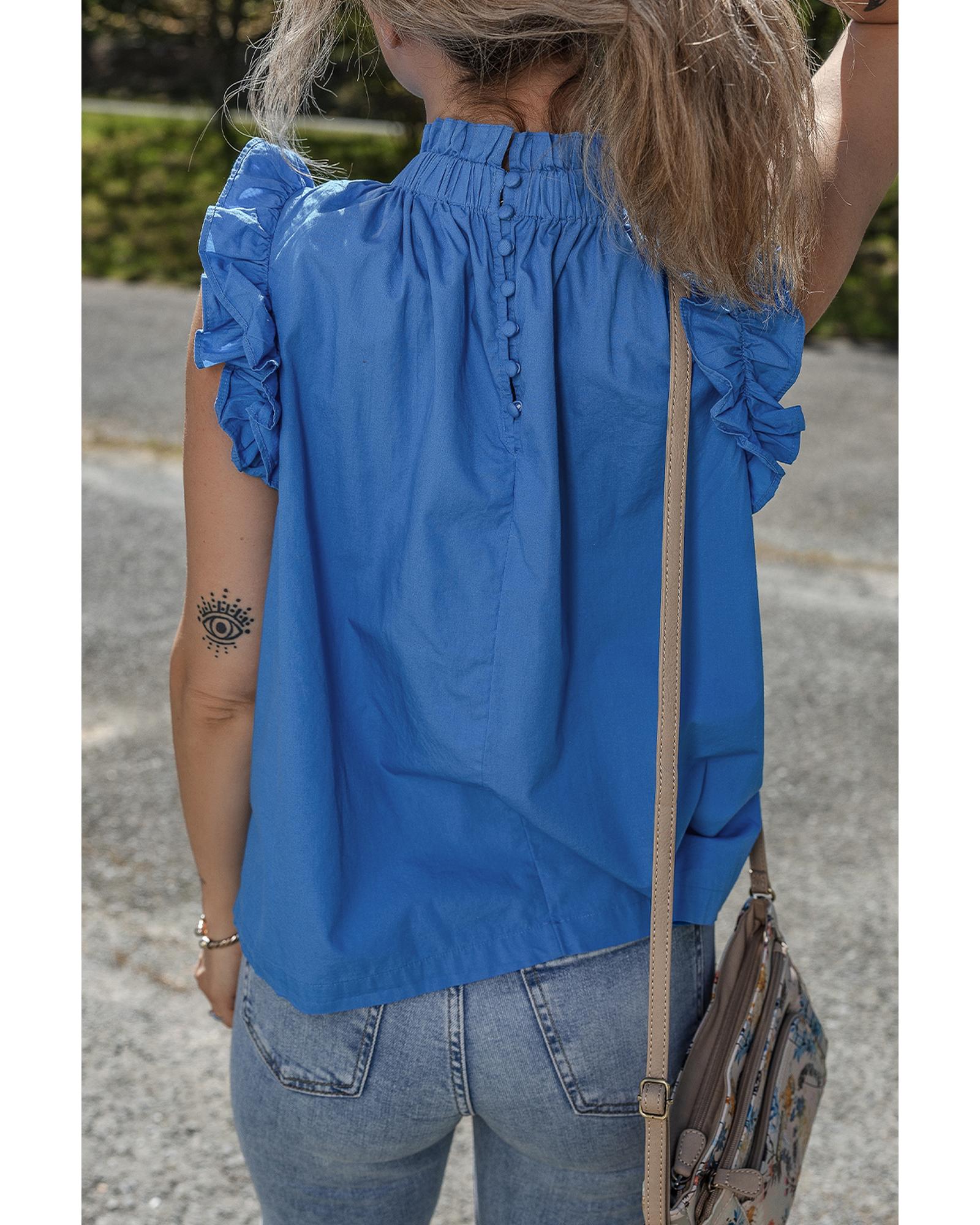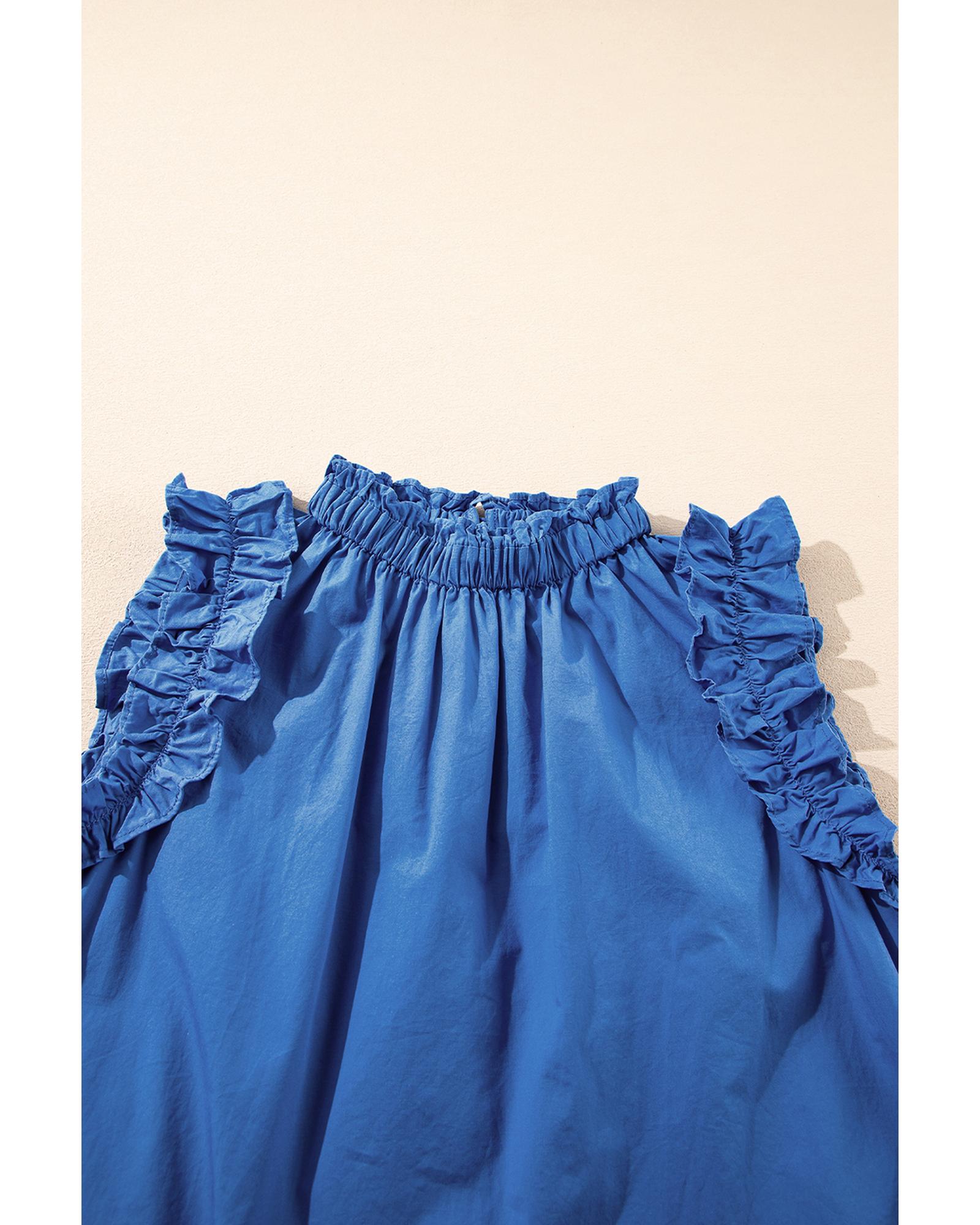 This stylish tank top features a vibrant sky blue color with a frilled neckline and ruffled armholes, offering a feminine and playful look. Its sleeveless design makes it ideal for warm weather, and the buttoned back adds both convenience and decorative detail. Perfect for layering or wearing alone, this top combines comfort with trendy style.