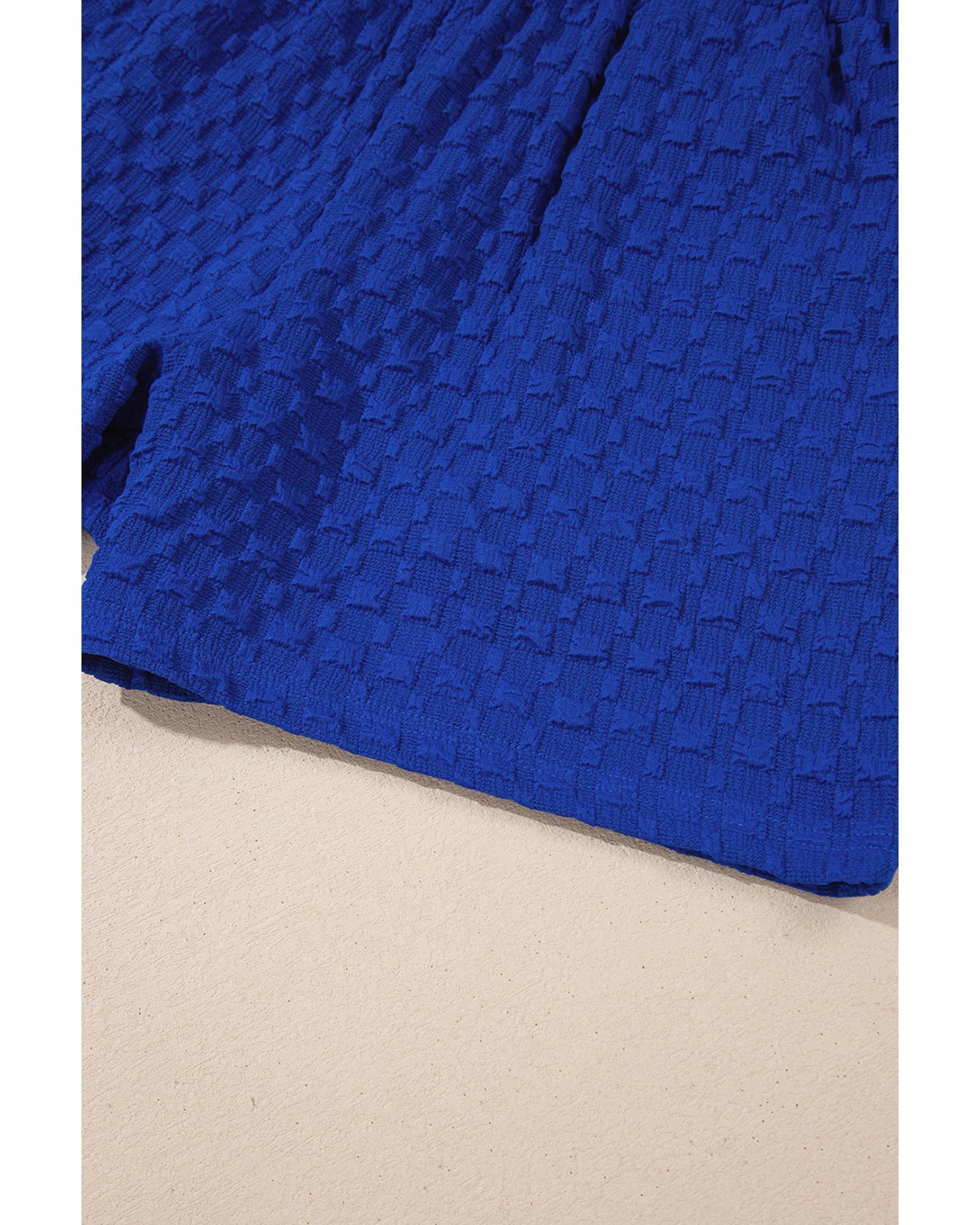 This stylish set features a textured jacquard fabric in a vibrant sky blue color, offering a trendy and comfortable look. The design includes a loose fit tee with cuffed sleeves and decorative button details, paired with matching shorts that have an elastic waistband and side pockets. Perfect for various casual occasions, this set combines fashion and practicality.